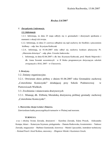 Kuźnia Raciborska, 15.06.2007 Rozkaz L6/2007 1. Zarządzenia i informacje. 1.2. Informacje. 1.2.1. Informuję, Ŝe dnia 25 maja odbyły się w gromadach i druŜynach spotkania z mamami z okazji ich święta. 1.2.2. Informuję, Ŝe dnia 21 czerwca odbędzie się rajd zuchowy do Siedlisk z pieczeniem kiełbasy – odp. hm. Krystyna Kubiczak 1.2.4.. Informuję, Ŝe 01.06.2007 roku odbył się zuchowy konkurs plastyczny Pt. „Marzenia dziecięce” - odp. phm. Urszula Jankowska 1. Informuję, Ŝe dnia 02.06.2007 r. dh. hm. Krystyna Kubiczak, pwd. Marek Majewski i dh. Anna Szostak uczestniczyli w II bloku programowym dotyczącym szkoleń związanych z HAL 2007 - w Chorzowie. 3. DruŜyny. 3.2. Zmiany organizacyjne. 3.2.1. Otwieram okres próbny z dniem 01.06.2007 roku Gromadzie zuchowej „Czterolistne Koniczynki” działającej przy Szkole Podstawowej w Pietrowicach Wielkich. 3.3. Zwolnienia i mianowania druŜynowych 3.3.1. Mianuję dh. ElŜbietę Morańską druŜynową próbnej gromady zuchowej „Czterolistne Koniczynki”. 6. Harcerska Akcja Letnia i Zimowa. Zatwierdzam kadrę poszczególnych turnusów w Pleśnej nad morzem. TURNUS I: z-ca i oboźny Iwona Zawada, druŜynowi – Karolina Zawada, Edyta Procek, Aleksandra Kempa, lekarz – Katarzyna Szymura, pielęgniarka – Danuta Rutkowska, kwatermistrz – Tadeusz Zawada, magazynier – Barbara Gumieniak, kierowca – Marek Lipczyński, instruktor techniczny – Roland Purol i Józef Kołton, ratownicy – Zbigniew Mirski i Kazimierz Grech. TURNUS II: z-ca pwd. Anna Rybicka, oboźny – pwd. Marek Rybicki, druŜynowi- Alina Wojtas, Gabriela Brzeźniak, Luiza Wieczorek, Małgorzata Gdesz, GraŜyna Szafraniec, Kinga Kubiczak, Michał Zientarski, Agnieszka Wdowiak, Wirginia Bulawa, Malgorzata Tykierka, lekarz- Ewa Białoskórska pielęgniarka – Wioletta Grobelny, kwatermistrz – Tadeusz Zawada, ratownik – Zbyslaw Szczepański i Kacper Kubiczak, magazynier – Barbara Gumieniak, ksiegowa – Anna Szostak, instruktor techniczny – Arkadiusz Janas i Tomasz Kucza, kierowca – Andrzej Kubiczak. TURNUS III : z-ca dh. Lidia Fatyga, oboźny – dh. Łukasz Wiktorzak, druŜynowi – Anna Brakowiecka, Jagoda Zagórska Aleksandra Stelmach, Adam Kamiński, Małgorzata Jaskuła, Marek Majewski, Joanna Wramba, lekarz- Damiana Kamińska, pielęgniarka- Maria Zawada, kwatermistrz – Krystyna Krzywda, kierowca – Bogdan Krzywda, instruktor techniczny – Jerzy Jary. 13. Pochwały. 13.1. Udzielam pochwały phm. Urszuli Jankowskiej za wzorowe przygotowanie konkursu plastycznego. Czuwaj!