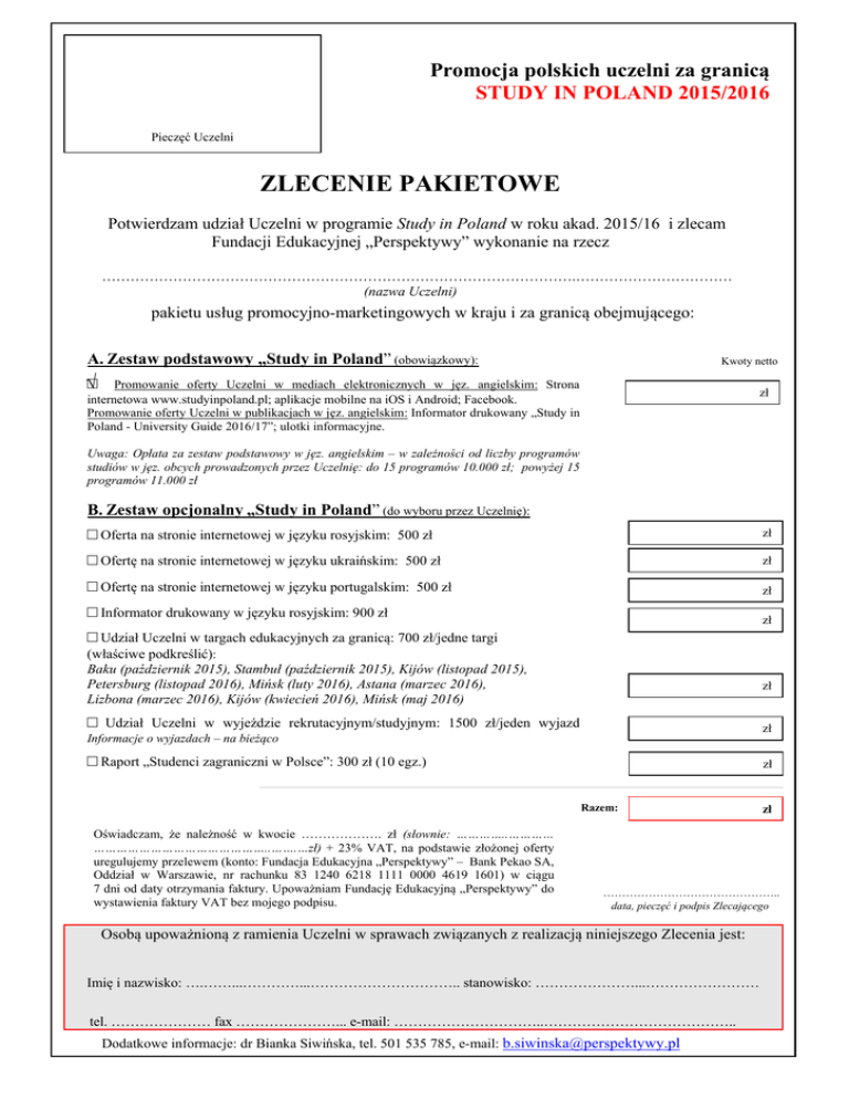 Promocja polskich uczelni za granicą STUDY IN POLAND 2015/2016 Pieczęć Uczelni ZLECENIE PAKIETOWE Potwierdzam udział Uczelni w programie Study in Poland w roku akad. 2015/16 i zlecam Fundacji Edukacyjnej „Perspektywy” wykonanie na rzecz ……………………………………………………………………………………….…………………………… (nazwa Uczelni) pakietu usług promocyjno-marketingowych w kraju i za granicą obejmującego: A. Zestaw podstawowy „Study in Poland” (obowiązkowy): Kwoty netto √□ Promowanie oferty Uczelni w mediach elektronicznych w jęz. angielskim: Strona internetowa www.studyinpoland.pl; aplikacje mobilne na iOS i Android; Facebook. Promowanie oferty Uczelni w publikacjach w jęz. angielskim: Informator drukowany „Study in Poland - University Guide 2016/17”; ulotki informacyjne. zł Uwaga: Opłata za zestaw podstawowy w jęz. angielskim – w zależności od liczby programów studiów w jęz. obcych prowadzonych przez Uczelnię: do 15 programów 10.000 zł; powyżej 15 programów 11.000 zł B. Zestaw opcjonalny „Study in Poland” (do wyboru przez Uczelnię): □ Oferta na stronie internetowej w języku rosyjskim: 500 zł zł □ Ofertę na stronie internetowej w języku ukraińskim: 500 zł zł □ Ofertę na stronie internetowej w języku portugalskim: 500 zł zł □ Informator drukowany w języku rosyjskim: 900 zł zł □ Udział Uczelni w targach edukacyjnych za granicą: 700 zł/jedne targi (właściwe podkreślić): Baku (październik 2015), Stambuł (październik 2015), Kijów (listopad 2015), Petersburg (listopad 2016), Mińsk (luty 2016), Astana (marzec 2016), Lizbona (marzec 2016), Kijów (kwiecień 2016), Mińsk (maj 2016) zł □ Udział Uczelni w wyjeździe rekrutacyjnym/studyjnym: 1500 zł/jeden wyjazd zł Informacje o wyjazdach – na bieżąco □ Raport „Studenci zagraniczni w Polsce”: 300 zł (10 egz.) zł zł Razem: Oświadczam, że należność w kwocie ………………. zł (słownie: …………..………… ………………………………………..…….…zł) + 23% VAT, na podstawie złożonej oferty uregulujemy przelewem (konto: Fundacja Edukacyjna „Perspektywy” – Bank Pekao SA, Oddział w Warszawie, nr rachunku 83 1240 6218 1111 0000 4619 1601) w ciągu 7 dni od daty otrzymania faktury. Upoważniam Fundację Edukacyjną „Perspektywy” do wystawienia faktury VAT bez mojego podpisu. zł ……………………………………….. data, pieczęć i podpis Zlecającego Osobą upoważnioną z ramienia Uczelni w sprawach związanych z realizacją niniejszego Zlecenia jest: Imię i nazwisko: ….……...…………...………………………….. stanowisko: …………………...…………………… tel. ………………… fax …………………... e-mail: …………………………..………………………………….. Dodatkowe informacje: dr Bianka Siwińska, tel. 501 535 785, e-mail: [email protected]
