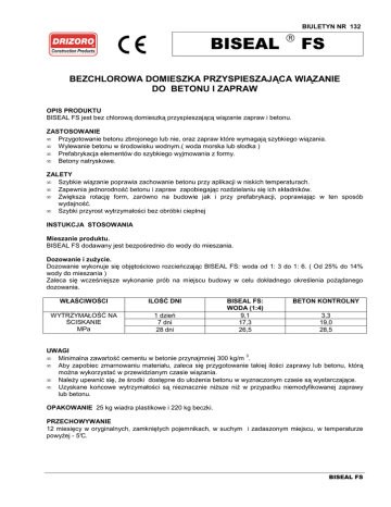 BIULETYN NR 132 BISEAL FS BEZCHLOROWA DOMIESZKA PRZYSPIESZAJĄCA WIĄZANIE DO BETONU I ZAPRAW OPIS PRODUKTU BISEAL FS jest bez chlorową domieszką przyspieszającą wiązanie zapraw i betonu. ZASTOSOWANIE • Przygotowanie betonu zbrojonego lub nie, oraz zapraw które wymagają szybkiego wiązania. • Wylewanie betonu w środowisku wodnym.( woda morska lub słodka ) • Prefabrykacja elementów do szybkiego wyjmowania z formy. • Betony natryskowe. ZALETY • Szybkie wiązanie poprawia zachowanie betonu przy aplikacji w niskich temperaturach. • Zapewnia jednorodność betonu i zapraw zapobiegając rozdzielaniu się ich składników. • Zwiększa rotację form, zarówno na budowie jak i przy prefabrykacji, poprawiając w ten sposób wydajność. • Szybki przyrost wytrzymałości bez obróbki cieplnej INSTUKCJA STOSOWANIA Mieszanie produktu. BISEAL FS dodawany jest bezpośrednio do wody do mieszania. Dozowanie i zuŜycie. Dozowanie wykonuje się objętościowo rozcieńczając BISEAL FS: woda od 1: 3 do 1: 6. ( Od 25% do 14% wody do mieszania ) Zaleca się wcześniejsze wykonanie prób na miejscu budowy w celu dokładnego określenia poŜądanego dozowania. WŁAŚCIWOŚCI ILOŚĆ DNI WYTRZYMAŁOŚĆ NA ŚCISKANIE MPa 1 dzień 7 dni 28 dni BISEAL FS: WODA (1:4) 9,1 17,3 26,5 BETON KONTROLNY 3,3 19,0 28,5 UWAGI 3 • Minimalna zawartość cementu w betonie przynajmniej 300 kg/m . • Aby zapobiec zmarnowaniu materiału, zaleca się przygotowanie takiej ilości zaprawy lub betonu, którą moŜna wykorzystać w przewidzianym czasie wiązania. • NaleŜy upewnić się, Ŝe środki dostępne do ułoŜenia betonu w wyznaczonym czasie są wystarczające. • Uzyskane końcowe wytrzymałości są nieznacznie niŜsze niŜ w przypadku niemodyfikowanej zaprawy lub betonu. OPAKOWANIE 25 kg wiadra plastikowe i 220 kg beczki. PRZECHOWYWANIE 12 miesięcy w oryginalnych, zamkniętych pojemnikach, w suchym i zadaszonym miejscu, w temperaturze powyŜej - 5°C. BISEAL FS DANE TECHNICZNE Opis 3 Gęstość (g/cm ) pH dodatek przyspieszający wiązanie EN 934-2 T6 1,25 ± 0,02 13 ± 1 Kolor Bezbarwny Wygląd Ciecz Rozpuszczalność w wodzie całkowita ® BISEAL FS spełnia wymagania znakowania CE dodatków przyspieszających do betonu zgodnie z EN 934-2. BHP Jest produktem nietoksycznym, ale naleŜy unikać kontaktu ze skórą i oczami. UŜywać gumowych rękawic i okularów ochronnych. W przypadku kontaktu ze skóra, naleŜy przemyć letnią wodą i mydłem. Jeśli produkt dostanie się do oczu, naleŜy przemyć dokładnie wodą i szukać pomocy medycznej. Produkt niepalny. Karta bezpieczeństwa dostępna na Ŝyczenie. Usuwanie produktu i jego pustych opakowań jest obowiązkiem uŜytkownika docelowego i musi być wykonane zgodnie z obowiązującymi przepisami. GWARANCJA Wszystkie produkty firmy DRIZORO wytwarzane są z najlepszych, dostępnych surowców, co zapewnia ich wysoką jakość. Nasza gwarancja dotyczy jakości produktu, a nie jego zastosowania poza naszą kontrolą. Za wszelkie uŜycie produktów do celów nie określonych w tym biuletynie, firma nie ponosi odpowiedzialności. Wartość gwarancji nie moŜe przewyŜszać wartości nabytego produktu. UWAGA Wraz z ukazaniem się tej instrukcji technicznej wszelkie wcześniejsze publikacje techniczne dotyczące produktu tracą swą waŜność. Wyłączny dystrybutor na kraj DRIZORO - Poland Przeds. „carmen” Sp. z o.o. 85-738 Bydgoszcz, ul. Szajnochy 14, Tel./fax: (052) 342 02 27, 348 91 14 www.drizoro.pl e-mail: [email protected] 02/2011 BISEAL FS