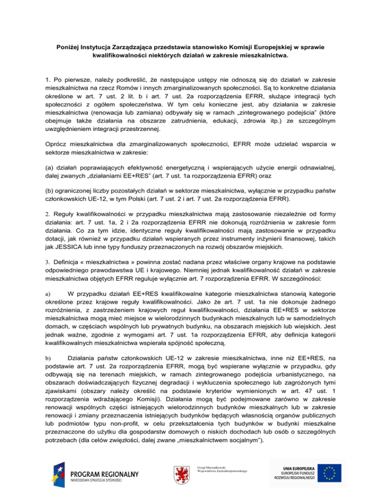 PoniŜej Instytucja Zarządzająca przedstawia stanowisko Komisji Europejskiej w sprawie kwalifikowalności niektórych działań w zakresie mieszkalnictwa. 1. Po pierwsze, naleŜy podkreślić, Ŝe następujące ustępy nie odnoszą się do działań w zakresie mieszkalnictwa na rzecz Romów i innych zmarginalizowanych społeczności. Są to konkretne działania określone w art. 7 ust. 2 lit. b i art. 7 ust. 2a rozporządzenia EFRR, słuŜące integracji tych społeczności z ogółem społeczeństwa. W tym celu konieczne jest, aby działania w zakresie mieszkalnictwa (renowacja lub zamiana) odbywały się w ramach „zintegrowanego podejścia” (które obejmuje takŜe działania na obszarze zatrudnienia, edukacji, zdrowia itp.) ze szczególnym uwzględnieniem integracji przestrzennej. Oprócz mieszkalnictwa dla zmarginalizowanych społeczności, EFRR moŜe udzielać wsparcia w sektorze mieszkalnictwa w zakresie: (a) działań poprawiających efektywność energetyczną i wspierających uŜycie energii odnawialnej, dalej zwanych „działaniami EE+RES” (art. 7 ust. 1a rozporządzenia EFRR) oraz (b) ograniczonej liczby pozostałych działań w sektorze mieszkalnictwa, wyłącznie w przypadku państw członkowskich UE-12, w tym Polski (art. 7 ust. 2 i art. 7 ust. 2a rozporządzenia EFRR). 2. Reguły kwalifikowalności w przypadku mieszkalnictwa mają zastosowanie niezaleŜnie od formy działania: art. 7 ust. 1a, 2 i 2a rozporządzenia EFRR nie dokonują rozróŜnienia w zakresie form działania. Co za tym idzie, identyczne reguły kwalifikowalności mają zastosowanie w przypadku dotacji, jak równieŜ w przypadku działań wspieranych przez instrumenty inŜynierii finansowej, takich jak JESSICA lub inne typy funduszy przeznaczonych na rozwój obszarów miejskich. 3. Definicja « mieszkalnictwa » powinna zostać nadana przez właściwe organy krajowe na podstawie odpowiedniego prawodawstwa UE i krajowego. Niemniej jednak kwalifikowalność działań w zakresie mieszkalnictwa objętych EFRR reguluje wyłącznie art. 7 rozporządzenia EFRR. W szczególności: a) W przypadku działań EE+RES kwalifikowalne kategorie mieszkalnictwa stanowią kategorie określone przez krajowe reguły kwalifikowalności. Jako Ŝe art. 7 ust. 1a nie dokonuje Ŝadnego rozróŜnienia, z zastrzeŜeniem krajowych reguł kwalifikowalności, działania EE+RES w sektorze mieszkalnictwa mogą mieć miejsce w wielorodzinnych budynkach mieszkalnych lub w samodzielnych domach, w częściach wspólnych lub prywatnych budynku, na obszarach miejskich lub wiejskich. Jest jednak waŜne, zgodnie z wymogami art. 7 ust. 1a rozporządzenia EFRR, aby definicja kategorii kwalifikowalnych mieszkalnictwa wspierała spójność społeczną. b) Działania państw członkowskich UE-12 w zakresie mieszkalnictwa, inne niŜ EE+RES, na podstawie art. 7 ust. 2a rozporządzenia EFRR, mogą być wspierane wyłącznie w przypadku, gdy odbywają się na terenach miejskich, w ramach zintegrowanego podejścia urbanistycznego, na obszarach doświadczających fizycznej degradacji i wykluczenia społecznego lub zagroŜonych tymi zjawiskami (obszary naleŜy określić na podstawie kryteriów wymienionych w art. 47 ust. 1 rozporządzenia wdraŜającego Komisji). Działania mogą być podejmowane zarówno w zakresie renowacji wspólnych części istniejących wielorodzinnych budynków mieszkalnych lub w zakresie renowacji i zmiany przeznaczenia istniejących budynków będących własnością organów publicznych lub podmiotów typu non-profit, w celu przekształcenia tych budynków w budynki mieszkalne przeznaczone do uŜytku dla gospodarstw domowych o niskich dochodach lub osób o szczególnych potrzebach (dla celów zwięzłości, dalej zwane „mieszkalnictwem socjalnym”). Urząd Marszałkowski Województwa Zachodniopomorskiego 4. EFRR nie obejmuje wsparciem budowy nowych domów lub rozbudowy domów juŜ istniejących. W rzeczywistości przepisy art. 7 ust. 1a, 2 i 2a rozporządzenia EFRR mają zastosowanie wyłącznie do istniejących budynków mieszkalnych. Przepisy te przyjęto w celu polepszenia jakości Ŝycia mieszkańców i charakterystyki energetycznej istniejących zasobów mieszkaniowych oraz niepodejmowania działań wspierających budowę nowych domów lub rozbudowy powierzchni mieszkalnych domów juŜ istniejących. Zatem, przekształcenie np. poddaszy w mieszkania nie powinno kwalifikować się do objęcia wsparciem EFRR, chyba Ŝe przekształcenie to stanowi część szerszych działań zmieniających przeznaczenie istniejących budynków stanowiących własność publiczną w celu zapewnienia mieszkań socjalnych. 5. W przypadku budynków o mieszanym przeznaczeniu (np. wielorodzinny budynek mieszkalny ze znajdującymi się na parterze sklepami) EFRR moŜe wspierać element „mieszkaniowy” działań, podczas gdy budŜet państwa (w ramach moŜliwości, razem z EFRR, np. na podstawie programu pomocy państwa na rzecz małych i średnich przedsiębiorstw, współfinansowanego takŜe przez EFRR) moŜe wspierać składnik „niemieszkaniowy" tych działań. 6. Zamiar przekształcenia w mieszkania socjalne (np. mieszkania na poddaszach) jedynie pewnych części budynków stanowiących własność publiczną. Brzmienie art. 7 ust. 2a rozporządzenia EFRR: „zmiana przeznaczenia istniejących budynków (...) w budynki mieszkalne” sugeruje, Ŝe zmiana ta odnosi się do całości budynku, a nie jedynie do jego części. Mieszkalnictwo socjalne stanowi jednak kwestię, którą naleŜy rozpatrywać równieŜ w kontekście prawodawstwa krajowego. Przykładowo, jeŜeli prawodawstwo krajowe na to zezwala, nie moŜna wykluczyć przekształcenia duŜego budynku będącego własnością publiczną częściowo w mieszkania socjalne, a częściowo w miejsca świadczenia usług publicznych, biura, sklepy itp. Niemniej jednak w procesie podejmowania decyzji dotyczących działań w zakresie „mieszkalnictwa socjalnego” w danym kontekście w