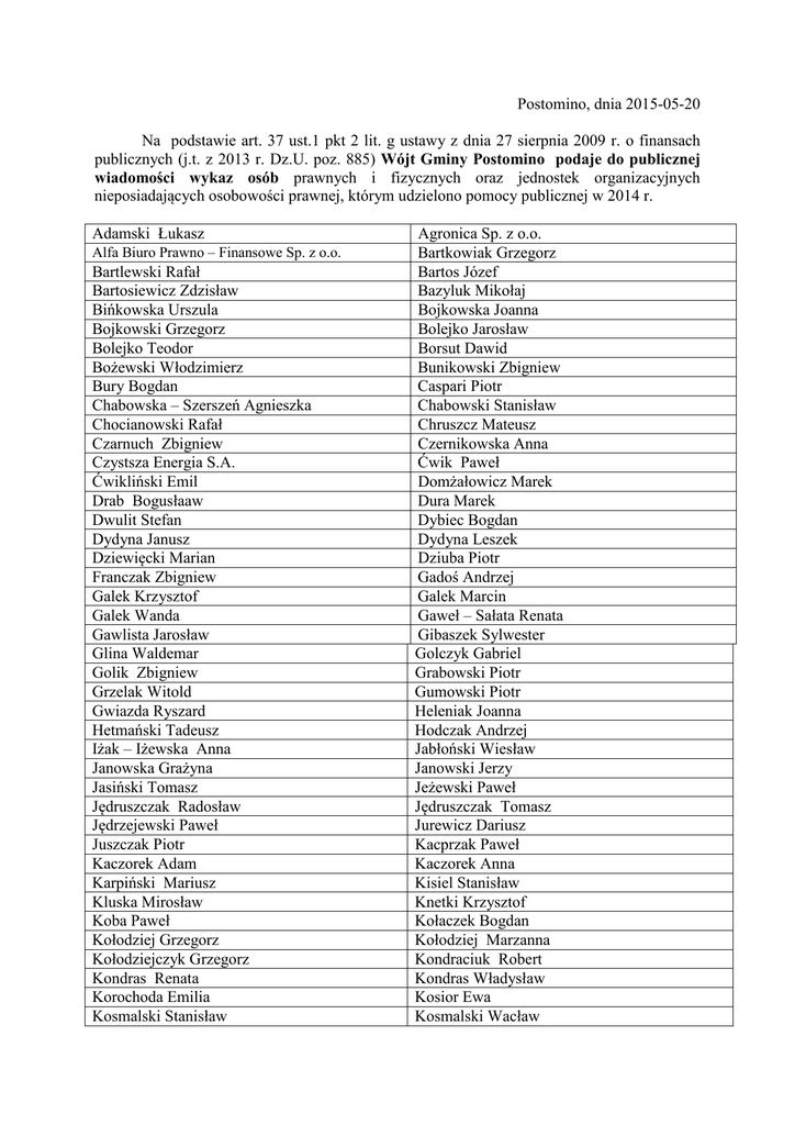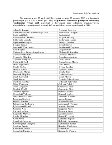 Postomino, dnia 2015-05-20 Na podstawie art. 37 ust.1 pkt 2 lit. g ustawy z dnia 27 sierpnia 2009 r. o finansach publicznych (j.t. z 2013 r. Dz.U. poz. 885) Wójt Gminy Postomino podaje do publicznej wiadomości wykaz osób prawnych i fizycznych oraz jednostek organizacyjnych nieposiadających osobowości prawnej, którym udzielono pomocy publicznej w 2014 r. Adamski Łukasz Alfa Biuro Prawno – Finansowe Sp. z o.o. Bartlewski Rafał Bartosiewicz Zdzisław Bińkowska Urszula Bojkowski Grzegorz Bolejko Teodor Bożewski Włodzimierz Bury Bogdan Chabowska – Szerszeń Agnieszka Chocianowski Rafał Czarnuch Zbigniew Czystsza Energia S.A. Ćwikliński Emil Drab Bogusłaaw Dwulit Stefan Dydyna Janusz Dziewięcki Marian Franczak Zbigniew Galek Krzysztof Galek Wanda Gawlista Jarosław Glina Waldemar Golik Zbigniew Grzelak Witold Gwiazda Ryszard Hetmański Tadeusz Iżak – Iżewska Anna Janowska Grażyna Jasiński Tomasz Jędruszczak Radosław Jędrzejewski Paweł Juszczak Piotr Kaczorek Adam Karpiński Mariusz Kluska Mirosław Koba Paweł Kołodziej Grzegorz Kołodziejczyk Grzegorz Kondras Renata Korochoda Emilia Kosmalski Stanisław Agronica Sp. z o.o. Bartkowiak Grzegorz Bartos Józef Bazyluk Mikołaj Bojkowska Joanna Bolejko Jarosław Borsut Dawid Bunikowski Zbigniew Caspari Piotr Chabowski Stanisław Chruszcz Mateusz Czernikowska Anna Ćwik Paweł Domżałowicz Marek Dura Marek Dybiec Bogdan Dydyna Leszek Dziuba Piotr Gadoś Andrzej Galek Marcin Gaweł – Sałata Renata Gibaszek Sylwester Golczyk Gabriel Grabowski Piotr Gumowski Piotr Heleniak Joanna Hodczak Andrzej Jabłoński Wiesław Janowski Jerzy Jeżewski Paweł Jędruszczak Tomasz Jurewicz Dariusz Kacprzak Paweł Kaczorek Anna Kisiel Stanisław Knetki Krzysztof Kołaczek Bogdan Kołodziej Marzanna Kondraciuk Robert Kondras Władysław Kosior Ewa Kosmalski Wacław Kostrzewa Przemysław Kowal Andrzej Kowal Ireneusz Kowalski Marian Kowalski Sebastian Kozdroń Zbigniew Kubera Krzysztof Kujawa Tomasz Kulas Marta Kurek Anna Kwiatek Waldemar Lachowicz Zbigniew Lech – Szajner Maria Lech Zenon Lichacy Grzegorz Lichacy Rafał Lisek Henryk Łyczko Jan Machelski Zdzisław Majewski Mirosław Małolepszy Paweł Matelak Jerzy Mezgier Katarzyna Michalak Ryszard Mielczarek Józef Mielczarek Paweł Miszczak Piotr Morka Adrian Morka Wojciech Musielak Marek Mystkowski Albert Nadstawna Iwona Namiel Ryszard Nasiadko – Wojcieszyńska Kamila Nieradka Katarzyna Niewczas Sławomir Nowak Andrzej Nowak Krzysztof Nowe Marzena Olszewski Krzysztof Olzak Paweł Ostrowski Jerzy Pabisiak Grzegorz Pakos Daniel Pawelec Wiesław Pawlak Lech Piaseczny Robert Piaszczyńska Sylwia Kośka Włodzimierz Kowal Gabriel Kowal Jarosław Kowalski Piotr Kowalski Tomasz Kruczkowski Andrzej Kudeń Andrzej Kukowski Grzegorz Kulińska Maria Kurzyńska Marzena Lach Waldemar Langiewicz Henryk Lech Marek Lenczewski Zbigniew Lichacy Jan Lichacy Tadeusz Lisowska Emilia Machała Lesław Macias Ireneusz Maksim Henryk Masłyk Jarosław Matuszak Janusz Michalak Lucyna Michalska Renata Mielczarek Lucjan Mielczarek Szczepan Morawiec Wanda Morka Lucjan Morka Zenon Mysiewicz Mariusz Mystkowski Robert Namiel Paweł Namiel Stanisław Nasiadko Mieszko Niewadził Marek Niewiński Bogdan Nowak Henryk Nowak lucyna Odroczko Krzysztof Olzak Andrzej Orłowski Leszek Oszmiański Stanisław Pacak Elżbieta Paprocki Bartłomiej Pawlak Jolanta Piaseczna Irena Piaszczyńska Adela Piecyk Wojciech Pilecka Alicja Plytta Marcin Podemski Leszek Preś Tadeusz Przewodowski Marian Przybyła Mateusz Rojek Piotr Rolnicza Spółdzielnia Produkcyjna w Tyniu, Rudnikowski Zbyszek Ryfa Robert Sarnicki Jacek Sieciński Mariusz Sieradzki Zdzisław Sikora Paweł Siwiuk Bronisława Sówka Janusz Sówka Sylwester Spychała Marian Staniszewska Anna Stasik Wojciech Stępniak Przemysław Szada Józef Szczęch Jacek Szczot Iwona Szmyd Wojciech Szwichtenberg Mirosław Szyszka Tadeusz Tomczyk Monika Walentynowicz Agnieszka Wielgat Grzegorz Wieliński Andrzej Wilgos Andrzej WIND AND WATER Sp. Z o. o. Winiarski Norbert Wisowaty Kazimiera Wnuczek Halina Wojciechowski Witold Wojtaś Roman Wrzesień Marta Ziebell Jan Zosiuk Tadeusz Zwolan Mieczysław Żukowski Jarosław Durczak Agata F-ka Obrabiarek ACORN Sc Ryszard Żołędziowski Grądzki Tomasz Jakubowski Tadeusz Piotrowski Edmund Płachecki Zbigniew Podgórski Adam Prochera – Gans Władysław Przedsiębiorstwo Rolne „AVENA Rodewald Mateusz Rolnicza Spółdzielnia Produkcyjna w Rusinowie, Ruchniak Jan Rybicki Piotr Sadowski Tadeusz Sawicki Piotr Sieradzki Krzysztof Sikora Adrian Siudek Arkadiusz Skóra Zdzisław Sówka Przemysław Specjalistyczne Gospodarstwo Rolne S.C. Stachowicz Mariusz Stanulewicz Anita Staszczak Ireneusz Surma Halina Szczepanek Mirosław Szczoczarz Katarzyna Szmyd Jan Szwichtenberg Krzysztof Szwiec Danuta Świeboda Marcin Wagner Grzegorz Waszkiewicz Józef Wielgat Marek Wiktor Iwona Wilgos Bożena Winiarski Mirosław Wisowaty Jarosław Włodarczyk Wiesław Wojciechowski Marian Wojtaś Krzysztof Wrotniak Jacek Zdrzeniecki Jerzy Znojek Stanisław Zwolan Leszek Żelazko Zbigniew Dzikowski Ryszard Firma Handlowa CORSA sp. z o.o. Henning Rafał Jurgiewicz Jan Kowalski Stanisław Małachowski Artur Olczyk Dorota Rolbiecki Marek Skwierawski Waldemar Woszczyk Artur Krzysztofik Anna Miszczak Stanisław Przeds.Gospodarki Komunalnej sp. z o.o. Siwek Karol Tama Roman Wójt Gminy Postomino Janusz Bojkowski