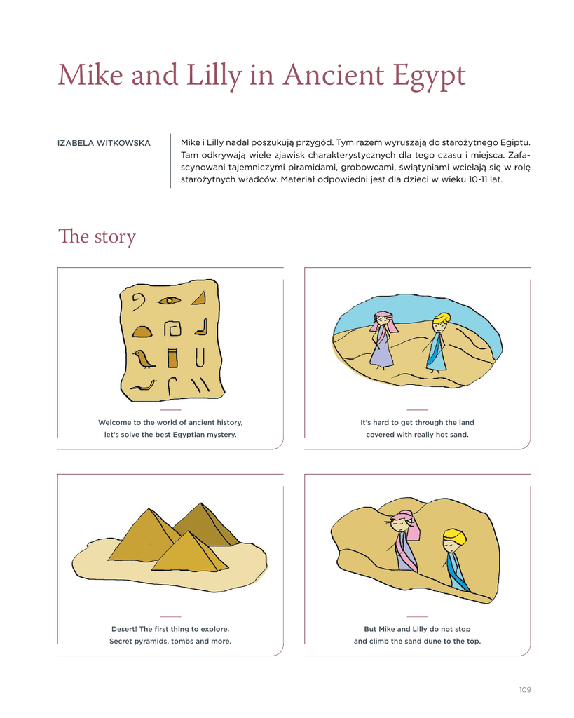 Mike and Lilly in Ancient Egypt Izabela Witkowska Mike i Lilly nadal poszukują przygód. Tym razem wyruszają do starożytnego Egiptu. Tam odkrywają wiele zjawisk charakterystycznych dla tego czasu i miejsca. Zafascynowani tajemniczymi piramidami, grobowcami, świątyniami wcielają się w rolę starożytnych władców. Materiał odpowiedni jest dla dzieci w wieku 10-11 lat. The story Welcome to the world of ancient history, It’s hard to get through the land let’s solve the best Egyptian mystery. covered with really hot sand. Desert! The first thing to explore. But Mike and Lilly do not stop Secret pyramids, tombs and more. and climb the sand dune to the top. 109 nauczanie dzieci There’s a temple, let’s go inside. Mike, I am scared, mummies are here. Look at the pictures on the right. You’re with me, Lilly, never fear! What are these symbols? They’re words. King Mike, you look powerful. I like the ones that look like birds. Your Highness, you’re beautiful. Now, let’s go down the River Nile. OK, but there’s a crocodile. 1103/2016 Mike and Lilly in Ancient Egypt Decipher the sentences Ćwiczenie polega na uzupełnieniu zaszyfrowanych zdań. Brakującym słowom przypisałam przypadkowe symbole przedstawione w tabeli. Podobnie jak Mike i Lilly odczytują alfabet ze ścian świątyni, uczniowie bawią się w odnalezienie tajemniczego słowa. ∏ ∆ ≈ pyramids temple Ancient Nile mummies 1. Mike an Lilly go to Egypt. 4. They visit the 2. They explore secret . 5. They go down the River 3. They climb the sand 6. Lilly is scared of to the top. dune . . . Find the pairs W ćwiczeniu tym utrwalane są wyrażenia dotyczące omawianego tematu. Zadanie polega na połączeniu słów z kolumny A ze słowami z kolumny B w odpowiednie pary. Połączone w pary wyrazy można znaleźć w tekście. A B River pyramids sand Egypt Ancient dune secret amulet Egyptian Nile magic mystery 111 nauczanie dzieci Correct the sentences Podane zdania są niezgodne z treścią historyjki. Zadanie polega na zaznaczeniu słowa, które nie pasuje do treści, a następnie zastąpieniu go odpowiednim wyrazem wybranym z ramki. jewels mummies crocodile desert Egypt sand dune Nile temple 1. Mike and Lilly go to Ancient Greece. 2. They explore the jungle. 3. They climb the mountains. 4. They go inside the museum. 5. They go down the River Thames. 6. There’s a fish in the river. 7. Lilly is scared of spiders. 8. They wear Egyptian shoes. Załącznik 1. Pobierz materiał do wydruku (link dostępny w elektronicznej wersji artykułu) Symbole użyte w ćwiczeniu Decipher the sentences zaczerpnięte zostały z zestawu symboli programu Word i są przypadkowo przypisane do słów. Znaki i symbole zawarte w rysunkach nie mają prawdziwego znaczenia, a ich podobieństwo do pisma starożytnego jest również przypadkowe. 1123/2016