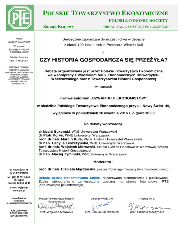 POLSKIE TOWARZYSTWO EKONOMICZNE POLISH ECONOMIC SOCIETY Zarząd Krajowy Prezes ELŻBIETA MĄCZYŃSKA ORGANIZACJA POŻYTKU PUBLICZNEGO Serdecznie zapraszam do uczestnictwa w debacie Wiceprezesi z okazji 100-lecia urodzin Profesora Witolda Kuli BOGUSŁAW FIEDOR BOGDAN ŚLUSARZ pt. Sekretarz Generalny BEATA MAJECKA CZY HISTORIA GOSPODARCZA SIĘ PRZEŻYŁA? Członkowie Prezydium ELŻBIETA CHABOWSKA BOGUSŁAWA DRELICH-SKULSKA RYSZARD KAMIŃSKI JAROSŁAW MARCZAK ALEKSANDER PANASIUK ANDRZEJ PRUSEK ANDRZEJ SZPLIT Debata organizowana jest przez Polskie Towarzystwo Ekonomiczne we współpracy z Wydziałem Nauk Ekonomicznych Uniwersytetu Warszawskiego oraz z Towarzystwem Historii Gospodarczej w ramach Konwersatorium „CZWARTKI U EKONOMISTÓW” w siedzibie Polskiego Towarzystwa Ekonomicznego przy ul. Nowy Świat 49, wyjątkowo w poniedziałek 18 kwietnia 2016 r. o godz.16:00 Do debaty wprowadzą: dr Maciej Bukowski, WNE Uniwersytet Warszawski dr Piotr Koryś, WNE Uniwersytet Warszawski prof. dr hab. Marcin Kula, Wydz. Historii Uniwersytet Warszawski dr hab. Cecylia Leszczyńska, WNE Uniwersytet Warszawski prof. dr hab. Wojciech Morawski, Szkoła Główna Handlowa w Warszawie, prezes Towarzystwa Historii Gospodarczej dr hab. Maciej Tymiński, WNE Uniwersytet Warszawski Moderator: ul. Nowy Świat 49 00-042 Warszawa tel.: (48) 22 551 54 01, 551 54 05 fax: (48) 22 551 54 44 e-mail: [email protected] www.pte.pl Konto/Bank a/c Millennium 38116022020000000060847735 KRS 0000099464 REGON 007022016 NIP 526-03-00-196 prof. dr hab. Elżbieta Mączyńska, prezes Polskiego Towarzystwa Ekonomicznego Debata będzie transmitowana online, rejestrowana elektronicznie i publikowana. Zapisy stenograficzne zamieszczone zostaną na stronie internetowej PTE (http:/www.pte.pl/konferencje). Prezes Towarzystwa Historii Gospodarczej Dziekan WNE UW Prezes PTE prof. Wojciech Morawski prof. Jan Jakub Michałek prof. Elżbieta Mączyńska Informujemy, że spotkanie będzie transmitowane online. 1. Uczestnictwo w transmisji online wymaga dostępu do komputera oraz łącza internetowego. 2. Z transmisją wydarzenia łączymy się za pomocą adresu WWW: https://pte.clickwebinar.com/debata 3. Transmisja rozpocznie się na 20 min. przed właściwym spotkaniem. 4. Po otworzeniu linku proszę postępować według poniższej instrukcji: 5. Program przed odtworzeniem transmisji sprawdzi aktualność Państwa oprogramowania. W zależności od wyniku, może powstać potrzeba aktualizacji wybranych komponentów (testowanie można przeprowadzić w każdym momencie, nawet gdy spotkanie nie jest jeszcze rozpoczęte). 6. Po wejściu do pokoju transmisji powinien pokazać się zbliżony ekran: 7. W przypadku problemów z połączeniem, proszę o kontakt na adres mailowy: [email protected]
