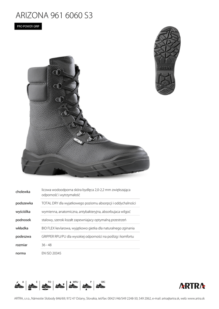 ARIZONA 961 6060 S3 cholewka licowa wodoodporna skóra bydlęca 2,0-2,2 mm zwiększająca odporność i wytrzymałość podszewka TOTAL DRY dla wyjatkowego poziomu absorpcji i oddychalności wyściólka wymienna, anatomiczna, antybakteryjna, absorbujaca wilgoć podnosek stalowy, szeroki kszałt zapewniajacy optymalną przestrzeń wkładka BIO FLEX kevlarowa, wyjątkowo gietka dla naturalnego zginania podeszwa GRIPPER RPU/PU dla wysokiej odporności na poślizg i komfortu rozmiar 36 - 48 norma EN ISO 20345 ARTRA, s.r.o., Námestie Slobody 846/69, 972 47 Oslany, Slovakia, tel/fax: 00421/46/549 2248-50, 549 2062, e-mail: [email protected], web: www.artra.sk