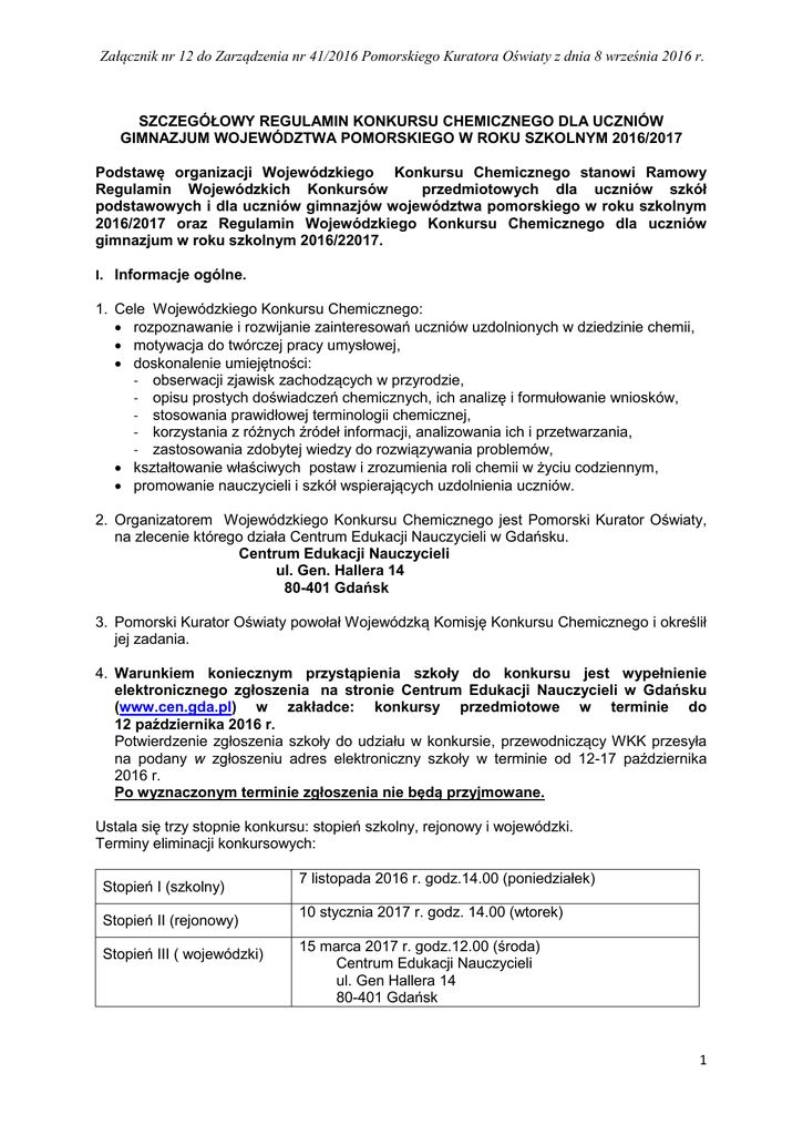 Załącznik nr 12 do Zarządzenia nr 41/2016 Pomorskiego Kuratora Oświaty z dnia 8 września 2016 r. SZCZEGÓŁOWY REGULAMIN KONKURSU CHEMICZNEGO DLA UCZNIÓW GIMNAZJUM WOJEWÓDZTWA POMORSKIEGO W ROKU SZKOLNYM 2016/2017 Podstawę organizacji Wojewódzkiego Konkursu Chemicznego stanowi Ramowy Regulamin Wojewódzkich Konkursów przedmiotowych dla uczniów szkół podstawowych i dla uczniów gimnazjów województwa pomorskiego w roku szkolnym 2016/2017 oraz Regulamin Wojewódzkiego Konkursu Chemicznego dla uczniów gimnazjum w roku szkolnym 2016/22017. I. Informacje ogólne. 1. Cele Wojewódzkiego Konkursu Chemicznego: rozpoznawanie i rozwijanie zainteresowań uczniów uzdolnionych w dziedzinie chemii, motywacja do twórczej pracy umysłowej, doskonalenie umiejętności: - obserwacji zjawisk zachodzących w przyrodzie, - opisu prostych doświadczeń chemicznych, ich analizę i formułowanie wniosków, - stosowania prawidłowej terminologii chemicznej, - korzystania z różnych źródeł informacji, analizowania ich i przetwarzania, - zastosowania zdobytej wiedzy do rozwiązywania problemów, kształtowanie właściwych postaw i zrozumienia roli chemii w życiu codziennym, promowanie nauczycieli i szkół wspierających uzdolnienia uczniów. 2. Organizatorem Wojewódzkiego Konkursu Chemicznego jest Pomorski Kurator Oświaty, na zlecenie którego działa Centrum Edukacji Nauczycieli w Gdańsku. Centrum Edukacji Nauczycieli ul. Gen. Hallera 14 80-401 Gdańsk 3. Pomorski Kurator Oświaty powołał Wojewódzką Komisję Konkursu Chemicznego i określił jej zadania. 4. Warunkiem koniecznym przystąpienia szkoły do konkursu jest wypełnienie elektronicznego zgłoszenia na stronie Centrum Edukacji Nauczycieli w Gdańsku (www.cen.gda.pl) w zakładce: konkursy przedmiotowe w terminie do 12 października 2016 r. Potwierdzenie zgłoszenia szkoły do udziału w konkursie, przewodniczący WKK przesyła na podany w zgłoszeniu adres elektroniczny szkoły w terminie od 12-17 października 2016 r. Po wyznaczonym terminie zgłoszenia nie będą przyjmowane. Ustala się trzy stopnie konkursu: stopień szkolny, rejonowy i wojewódzki. Terminy eliminacji konkursowych: Stopień I (szkolny) Stopień II (rejonowy) Stopień III ( wojewódzki) 7 listopada 2016 r. godz.14.00 (poniedziałek) 10 stycznia 2017 r. godz. 14.00 (wtorek) 15 marca 2017 r. godz.12.00 (środa) Centrum Edukacji Nauczycieli ul. Gen Hallera 14 80-401 Gdańsk 1 Załącznik nr 12 do Zarządzenia nr 41/2016 Pomorskiego Kuratora Oświaty z dnia 8 września 2016 r. II. Organizacja i przebieg eliminacji I stopnia ( szkolnych). 1. W I stopniu (szkolnym) konkursu chemicznego dla gimnazjum może wziąć udział każdy uczeń gimnazjum. 2. Jeżeli w szkole macierzystej konkurs nie jest organizowany, to uczeń może do niego przystąpić w szkole wskazanej przez dyrektora. 3. Eliminacje szkolne organizują i przeprowadzają Szkolne Komisje Konkursowe (SKK) powołane przez dyrektorów szkół gimnazjalnych. 4. Dyrektor szkoły informuje uczniów i nauczycieli o organizacji i terminach przeprowadzania konkursu i warunkach udziału w nich uczniów. 5. Obowiązkiem dyrektora jest: zgłoszenie w podanym terminie udziału szkoły w konkursie; zapoznanie nauczycieli, uczniów i rodziców z regulaminem konkursu; powołanie Szkolnych Komisji Konkursowych(SKK) do przeprowadzenia eliminacji I stopnia oraz nadzorowanie prawidłowego przebiegu konkursu. 6. Zasady przebiegu eliminacji I stopnia ( szkolnych): a) Uczestnikami konkursu mogą być uczniowie wszystkich klas gimnazjum. Każdy uczeń, który zgłosi chęć udziału w konkursie, zobowiązany jest przedłożyć Szkolnej Komisji Konkursowej wypełnioną „Kartę zgłoszenia ucznia do konkursu”, stanowiącą załącznik nr 1 do Ramowego regulaminu, podpisaną przez dyrektora szkoły, do której uczęszcza i rodzica (prawnego opiekuna). Podpis rodzica jest automatycznie zgodą na uczestnictwo ucznia w konkursie i przetwarzanie danych na potrzeby konkursu oraz publikacje wyników konkursowych w Internecie. b) Arkusz zadań zostanie przesłany do każdego gimnazjum drogą elektroniczną na podany w zgłoszeniu adres e-mail dyrektora szkoły ( lub upoważnionego członka SKK) najpóźniej w dniu poprzedzającym eliminacje szkolne. Zadania konkursowe do czasu rozpoczęcia konkursu stanowią tajemnicę służbową i są oznaczone klauzulą „zastrzeżone” W przypadku nieotrzymania zdań Przewodniczący SKK powiadamia przewodniczącego WKK telefonicznie: 58 34 04 112 c) Uczestnicy konkursu rozwiązują pisemne zadania otwarte i zamknięte. Odpowiedzi do zadań konkursowych są punktowane z dokładnością do jedności. d) Maksymalny czas rozwiązywania zadań wynosi 60 minut. Uczniowie mogą korzystać z prostych kalkulatorów oraz tablic, dostarczonych wraz z arkuszem. e) Szkolne komisje konkursowe przeprowadzają konkurs, sprawdzają i oceniają prace uczniów, według kryteriów ustalonych przez Wojewódzką Komisję Konkursową. f) Szkolne Komisje Konkursowe sporządzają protokół (załącznik nr 4 do Ramowego Regulaminu)ze stopnia szkolnego konkursu chemicznego. g) W przypadku, gdy żaden z uczniów nie osiągnął wymaganych 70 % punktów, SKK jest zobowiązana również dostarczyć do przewodniczącego RKK protokół zawierający informację o liczbie uczniów, którzy przystąpili do konkursu. Przewodniczący SKK przekazują Przewodniczącemu Rejonowej Komisji Konkursowej(RKK), w ciągu trzech dni roboczych, licząc od dnia następnego, po dniu przeprowadzenia konkursu, protokół z posiedzenia SKK, sprawdzone prace uczniów oraz „ Karty zgłoszenia uczniów do konkursu” tych uczniów, którzy uzyskali wymagane 70% możliwych do uzyskania punktów. Kopię protokołu przesłanego do RKK, SKK pozostawia w swojej dokumentacji. h) Uczniowie, którzy uzyskali co najmniej 70% możliwych do uzyskania punktów, po weryfikacji przez Rejonowe Komisje Konkursowe zostają zakwalifikowani do II stopnia eliminacj
