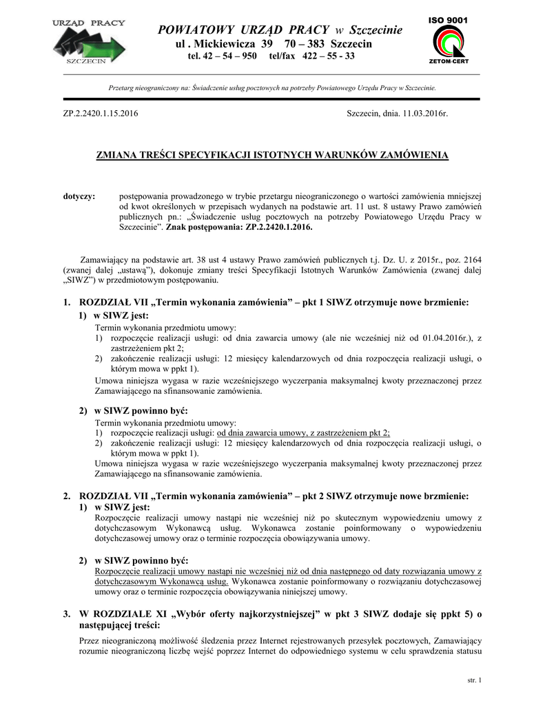 POWIATOWY URZĄD PRACY w Szczecinie ul . Mickiewicza 39 tel. 42 – 54 – 950 70 – 383 Szczecin tel/fax 422 – 55 - 33 Przetarg nieograniczony na: Świadczenie usług pocztowych na potrzeby Powiatowego Urzędu Pracy w Szczecinie. ZP.2.2420.1.15.2016 Szczecin, dnia. 11.03.2016r. ZMIANA TREŚCI SPECYFIKACJI ISTOTNYCH WARUNKÓW ZAMÓWIENIA dotyczy: postępowania prowadzonego w trybie przetargu nieograniczonego o wartości zamówienia mniejszej od kwot określonych w przepisach wydanych na podstawie art. 11 ust. 8 ustawy Prawo zamówień publicznych pn.: „Świadczenie usług pocztowych na potrzeby Powiatowego Urzędu Pracy w Szczecinie”. Znak postępowania: ZP.2.2420.1.2016. Zamawiający na podstawie art. 38 ust 4 ustawy Prawo zamówień publicznych t.j. Dz. U. z 2015r., poz. 2164 (zwanej dalej „ustawą”), dokonuje zmiany treści Specyfikacji Istotnych Warunków Zamówienia (zwanej dalej „SIWZ”) w przedmiotowym postępowaniu. 1. ROZDZIAŁ VII „Termin wykonania zamówienia” – pkt 1 SIWZ otrzymuje nowe brzmienie: 1) w SIWZ jest: Termin wykonania przedmiotu umowy: 1) rozpoczęcie realizacji usługi: od dnia zawarcia umowy (ale nie wcześniej niż od 01.04.2016r.), z zastrzeżeniem pkt 2; 2) zakończenie realizacji usługi: 12 miesięcy kalendarzowych od dnia rozpoczęcia realizacji usługi, o którym mowa w ppkt 1). Umowa niniejsza wygasa w razie wcześniejszego wyczerpania maksymalnej kwoty przeznaczonej przez Zamawiającego na sfinansowanie zamówienia. 2) w SIWZ powinno być: Termin wykonania przedmiotu umowy: 1) rozpoczęcie realizacji usługi: od dnia zawarcia umowy, z zastrzeżeniem pkt 2; 2) zakończenie realizacji usługi: 12 miesięcy kalendarzowych od dnia rozpoczęcia realizacji usługi, o którym mowa w ppkt 1). Umowa niniejsza wygasa w razie wcześniejszego wyczerpania maksymalnej kwoty przeznaczonej przez Zamawiającego na sfinansowanie zamówienia. 2. ROZDZIAŁ VII „Termin wykonania zamówienia” – pkt 2 SIWZ otrzymuje nowe brzmienie: 1) w SIWZ jest: Rozpoczęcie realizacji umowy nastąpi nie wcześniej niż po skutecznym wypowiedzeniu umowy z dotychczasowym Wykonawcą usług. Wykonawca zostanie poinformowany o wypowiedzeniu dotychczasowej umowy oraz o terminie rozpoczęcia obowiązywania umowy. 2) w SIWZ powinno być: Rozpoczęcie realizacji umowy nastąpi nie wcześniej niż od dnia następnego od daty rozwiązania umowy z dotychczasowym Wykonawcą usług. Wykonawca zostanie poinformowany o rozwiązaniu dotychczasowej umowy oraz o terminie rozpoczęcia obowiązywania niniejszej umowy. 3. W ROZDZIALE XI „Wybór oferty najkorzystniejszej” w pkt 3 SIWZ dodaje się ppkt 5) o następującej treści: Przez nieograniczoną możliwość śledzenia przez Internet rejestrowanych przesyłek pocztowych, Zamawiający rozumie nieograniczoną liczbę wejść poprzez Internet do odpowiedniego systemu w celu sprawdzenia statusu str. 1 POWIATOWY URZĄD PRACY w Szczecinie ul . Mickiewicza 39 tel. 42 – 54 – 950 70 – 383 Szczecin tel/fax 422 – 55 - 33 Przetarg nieograniczony na: Świadczenie usług pocztowych na potrzeby Powiatowego Urzędu Pracy w Szczecinie. rejestrowanych przesyłek pocztowych tj. w szczególności ich daty nadania oraz daty doręczenia. Informacje te muszą być dostępne w systemie przez co najmniej 30 dni od daty doręczenia przesyłki. 4. ROZDZIAŁ XIV „Opis przedmiotu zamówienia” – pkt 7 SIWZ otrzymuje nowe brzmienie: 1) w SIWZ jest: Wykonawca zobowiązany będzie do (z zastrzeżeniem pkt 11): 1) odbioru przesyłek pocztowych z siedziby Zamawiającego tj. Powiatowy Urząd Pracy w Szczecinie, ul. Mickiewicza 39 (Informacja), raz dziennie, w godzinach między 13:00 a 14:00, w dni robocze od poniedziałku do piątku, 2) dostarczenia przesyłek pocztowych do siedziby Zamawiającego (Sekretariat), co najmniej raz dziennie do godziny 11:00. W przypadku, gdy dzień odbioru/dostarczenia przesyłek pocztowych będzie dla Zamawiającego dniem wolnym od pracy, odbiór/dostarczenie przesyłek pocztowych nastąpi w następnym dniu roboczym dla Zamawiającego. Dopuszcza się zmianę sposobu, godzin oraz miejsca odbioru/dostarczenia przesyłek, za zgodą obu stron. 2) w SIWZ powinno być: Wykonawca zobowiązany będzie do (z zastrzeżeniem pkt 11): 1) odbioru przesyłek pocztowych z siedziby Zamawiającego tj. Powiatowy Urząd Pracy w Szczecinie, ul. Mickiewicza 39 (Informacja), raz dziennie, w godzinach między 13:00 a 14:00, w dni robocze od poniedziałku do piątku. Jeżeli w danym dniu Zamawiający nie będzie posiadał przesyłek przeznaczonych do odbioru przez Wykonawcę, Zamawiający niezwłocznie poinformuje o tym Wykonawcę telefonicznie, faksem lub droga elektroniczną, 2) dostarczenia przesyłek pocztowych do siedziby Zamawiającego (Sekretariat), co najmniej raz dziennie do godziny 11:00, w dni robocze od poniedziałku do piątku. Jeżeli w danym dniu Wykonawca nie będzie posiadał przesyłek przeznaczonych do dostarczenia Zamawiającemu, Wykonawca niezwłocznie poinformuje o tym Zamawiającego telefonicznie, faksem lub droga elektroniczną. W przypadku, gdy dzień odbioru/dostarczenia przesyłek pocztowych będzie dla Zamawiającego dniem wolnym od pracy, odbiór/dostarczenie przesyłek pocztowych nastąpi w następnym dniu roboczym dla Zamawiającego. Zamawiający powiadomi Wykonawcę (pisemnie, faksem lud drogą elektroniczną) o dniach wolnych od pracy dla Zamawiającego z odpowiednim wyprzedzeniem, za wyjątkiem dni które wynikają z ustawy z dnia 18 stycznia 1951 r. o dniach wolnych od pracy (t.j. Dz. U. z 2015r., poz. 90). Dopuszcza się zmianę sposobu, godzin oraz miejsca odbioru/dostarczenia przesyłek, za zgodą obu stron. 5. ROZDZIAŁ XIV „Opis przedmiotu zamówienia” – pkt 10 SIWZ otrzymuje nowe brzmienie: 1) w SIWZ jest: Nadanie przesyłek objętych przedmiotem zamówienia następować będzie w dniu ich odbioru przez Wykonawcę od Zamawiającego. 2) w SIWZ powinno być: Nadanie przesyłek objętych przedmiote