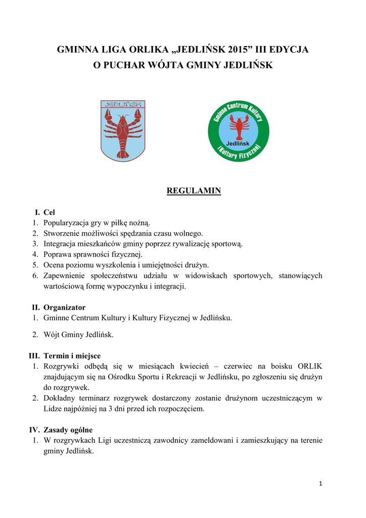 GMINNA LIGA ORLIKA „JEDLIŃSK 2015” III EDYCJA O PUCHAR WÓJTA GMINY JEDLIŃSK REGULAMIN I. 1. 2. 3. 4. 5. 6. Cel Popularyzacja gry w piłkę nożną. Stworzenie możliwości spędzania czasu wolnego. Integracja mieszkańców gminy poprzez rywalizację sportową. Poprawa sprawności fizycznej. Ocena poziomu wyszkolenia i umiejętności drużyn. Zapewnienie społeczeństwu udziału w widowiskach sportowych, stanowiących wartościową formę wypoczynku i integracji. II. Organizator 1. Gminne Centrum Kultury i Kultury Fizycznej w Jedlińsku. 2. Wójt Gminy Jedlińsk. III. Termin i miejsce 1. Rozgrywki odbędą się w miesiącach kwiecień – czerwiec na boisku ORLIK znajdującym się na Ośrodku Sportu i Rekreacji w Jedlińsku, po zgłoszeniu się drużyn do rozgrywek. 2. Dokładny terminarz rozgrywek dostarczony zostanie drużynom uczestniczącym w Lidze najpóźniej na 3 dni przed ich rozpoczęciem. IV. Zasady ogólne 1. W rozgrywkach Ligi uczestniczą zawodnicy zameldowani i zamieszkujący na terenie gminy Jedlińsk. 1 2. Zgłaszana drużyna może składać się z minimum 6 zawodników a maksymalnie 12 zawodników. 3. Drużyny zgłaszają swoje uczestnictwo do rozgrywek Ligi jej organizatorowi do dnia 11 kwietnia 2015 r. wraz z imiennym składem drużyn, dokonując następujących formalności: imię i nazwisko, adres zamieszkania, data urodzenia, pesel, a także numer kontaktowy do kierownika drużyny. 4. Każda z drużyn wraz z listą zgłoszeniową składa oświadczenie o odpowiedzialności, które zawiera podpisy wszystkich zawodników wpisanych na listę zgłoszeniową. 5. W przypadku zawodników niepełnoletnich każdy z nich musi załączyć pisemną zgodę przynajmniej jednego z rodziców na udział w rozgrywkach. 6. Każda z drużyn przed rozpoczęciem meczu przekazuje sędziemu protokół z listą maksymalnie 12 zawodników z listy zgłoszeniowej biorących udział w meczu, podpisany przez kierownika drużyny (protokoły wydaje organizator). 7. Każdy zawodnik zobowiązany jest posiadać podczas meczu dokument tożsamości, który będzie sprawdzany przez sędziego i organizatora przy wejściu na boisko przed rozgrywanym meczem. 8. Zawodnik zgłoszony do udziału w rozgrywkach, może reprezentować barwy tylko jednej drużyny w czasie trwania całych rozgrywek. 9. Zawodnicy trenujący w klubach sportowych mogą wziąć udział w lidze pod warunkiem, że zamieszkują i są zameldowani na terenie Gminy Jedlińsk. 10. Mecze odbywają się przy sędziowaniu jednego sędziego wyznaczonego przez organizatora. 11. Po każdym meczu sędzia sporządza protokół, który jest podstawą prowadzenia tabeli rozgrywek. 12. Organizator prowadzi rejestrację drużyn oraz tabelę rozgrywek. 13. Wszelkie sprawy sporne związane z przebiegiem rozgrywek rozpatruje sędzia oraz organizator. Decyzje podaje się do wiadomości w ciągu 3 dni od chwili otrzymania protokołu. 14. Ogłoszenie rozgrywek stanowi integralną część regulaminu. V. 1. 2. 3. System rozgrywek Mecze rozgrywane są systemem „każdy z każdym” wg ustalonego terminarza. O rozegraniu meczu decyduje sędzia. Mecz może być rozpoczęty, gdy w zespole występuje minimum 4 zawodników. W przypadku mniejszej liczby zawodników mecz zostaje rozstrzygnięty, jako walkower na korzyść drużyny przeciwnej. 4. Drużyny składają się z 6 zawodników (w tym bramkarz) + maksymalnie 6 zawodników rezerwowych. 5. Mecze rozgrywane są 2x20 minut z 5 minutową przerwą. 6. W meczu dokonywane są „zmiany hokejowe” w strefie zmian przy linii środkowej. 2 7. Drużyna, która nie stawi się w regulaminowym czasie gry przegrywa mecz walkowerem 0:3. 8. Drużyna, która odda dwa mecze walkowerem zostaje wykluczona z rozgrywek do końca edycji. 9. W przypadku, gdy drużyna oddaje drugi mecz walkowerem, a zarazem jest to ostatnia kolejka rozgrywek, wówczas zespół ten zostaje sklasyfikowany na ostatnim miejscu w tabeli bez względu na dorobek punktowy. VI. 1. 2. 3. 4. • • • • • Punktacja Zwycięstwo – 3 punkty. Remis – 1 punkt. Przegrana – 0 punktów. O kolejności miejsc w tabeli rozgrywek decyduje: większa ilość zdobytych punktów, korzystniejszy bilans bezpośrednich spotkań, korzystniejsza różnica bramek, większa ilość zdobytych bramek rzuty karne pomiędzy zainteresowanymi drużynami, VII. Przepisy W trakcie trwania rozgrywek obowiązują przepisy PZPN z wyjątkami: 1. Nie obowiązują przepisy dotyczące spalonego i pozycji spalonej. 2. Odległość muru od piłki przy stałych fragmentach gry wynosi 5m. 3. Rzut karny wykonuje się z linii pola karnego. 4. Wznowienie gry ze środka traktowane jest, jako rzut wolny pośredni. 5. Auty boczne wykonywane są rękoma zza głowy natomiast aut bramkowy wybijany jest z tzw. „piątki”. 6. Aut bramkowy wybijany z „piątki” musi być rozegrany na własnej połowie, tzn. piłka wprowadzana przez zawodnika drużyny, której przyznano aut bramkowy, przed opuszczeniem połowy, z której aut jest wykonywany musi dotknąć zawodnika przebywającego na tej samej połowie lub podłoża. 7. Za złe wprowadzenie piłki z autu bramkowego przyznaje się drużynie przeciwnej rzut wolny pośredni, wykonywany z linii środkowej boiska. 8. Bramkarz po złapaniu piłki z akcji może wprowadzić ją do gry w obrębie całego boiska. 9. Stosowane są kary minutowe 2 i 5 minut oraz czerwona kartka. Po otrzymaniu przez zawodnika czerwonej kartki jego zespół gra w osłabieniu do zakończenia meczu. VIII. Sprzęt sportowy 1. Wszystkie drużyny obowiązuje posiadanie w meczu: 3 • obuwia sportowego (lanki, korkotrampki), obowiązuje zakaz gry we wkrętach. • jednolitego stroju sportowego wraz z numerami na koszulkach, • opaski kapitana drużyny, IX. Ubezpieczenie 1. Każdy zawodnik powinien w zakresie własnym poddać się badaniu lekarskiemu o zdolności do gry w piłkę nożną. 2. Każdy z zawodników w okresie rozgrywek musi być ubezpieczony na własną rękę. 3. Udzi