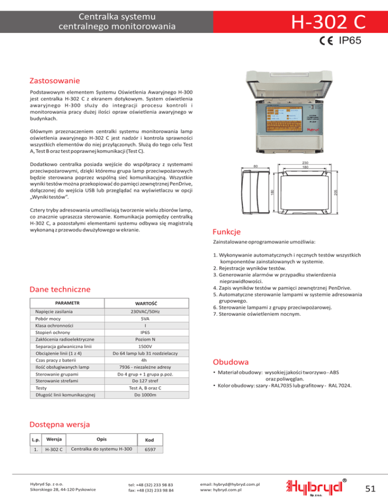 Centralka systemu centralnego monitorowania H-302 C IP65 Zastosowanie Podstawowym elementem Systemu Oœwietlenia Awaryjnego H-300 jest centralka H-302 C z ekranem dotykowym. System oœwietlenia awaryjnego H-300 s³u¿y do integracji procesu kontroli i monitorowania pracy du¿ej iloœci opraw oœwietlenia awaryjnego w budynkach. G³ównym przeznaczeniem centralki systemu monitorowania lamp oœwietlenia awaryjnego H-302 C jest nadzór i kontrola sprawnoœci wszystkich elementów do niej przy³¹czonych. S³u¿¹ do tego celu Test A, Test B oraz test poprawnej komunikacji (Test C). Cztery tryby adresowania umo¿liwiaj¹ tworzenie wielu zbiorów lamp, co znacznie upraszcza sterowanie. Komunikacja pomiêdzy centralk¹ H-302 C, a pozosta³ymi elementami systemu odbywa siê magistral¹ wykonan¹ z przewodu dwu¿y³owego w ekranie. 230 180 180 80 205 Dodatkowo centralka posiada wejœcie do wspó³pracy z systemami przeciwpo¿arowymi, dziêki któremu grupa lamp przeciwpo¿arowych bêdzie sterowana poprzez wspóln¹ sieæ komunikacyjn¹. Wszystkie wyniki testów mo¿na przekopiowaæ do pamiêci zewnêtrznej PenDrive, do³¹czonej do wejœcia USB lub przegl¹daæ na wyœwietlaczu w opcji „Wyniki testów”. Funkcje Zainstalowane oprogramowanie umo¿liwia: Dane techniczne PARAMETR WARTOŒÆ Napiêcie zasilania 230VAC/50Hz Pobór mocy Klasa ochronnoœci Stopieñ ochrony Zak³ócenia radioelektryczne Separacja galwaniczna linii Obci¹¿enie linii (1 z 4) Czas pracy z baterii Iloœæ obs³ugiwanych lamp Sterowanie grupami Sterowanie strefami Testy D³ugoœæ linii komunikacyjnej 5VA I IP65 Poziom N 1500V Do 64 lamp lub 31 rozdzielaczy 4h 7936 - niezale¿ne adresy Do 4 grup + 1 grupa p.po¿. Do 127 stref Test A, B oraz C Do 1000m 1. Wykonywanie automatycznych i rêcznych testów wszystkich komponentów zainstalowanych w systemie. 2. Rejestracje wyników testów. 3. Generowanie alarmów w przypadku stwierdzenia nieprawid³owoœci. 4. Zapis wyników testów w pamiêci zewnêtrznej PenDrive. 5. Automatyczne sterowanie lampami w systemie adresowania grupowego. 6. Sterowanie lampami z grupy przeciwpo¿arowej. 7. Sterowanie oœwietleniem nocnym. Obudowa • Materia³ obudowy: wysokiej jakoœci tworzywo - ABS oraz poliwêglan. • Kolor obudowy: szary - RAL7035 lub grafitowy - RAL 7024. Dostêpna wersja L.p. 1. Wersja Opis Kod H-302 C Centralka do systemu H-300 6597 R Hybryd Sp. z o.o. Sikorskiego 28, 44-120 Pyskowice tel: +48 (32) 233 98 83 fax: +48 (32) 233 98 84 email: [email protected] www: hybryd.com.pl 51 Sp. z o.o.