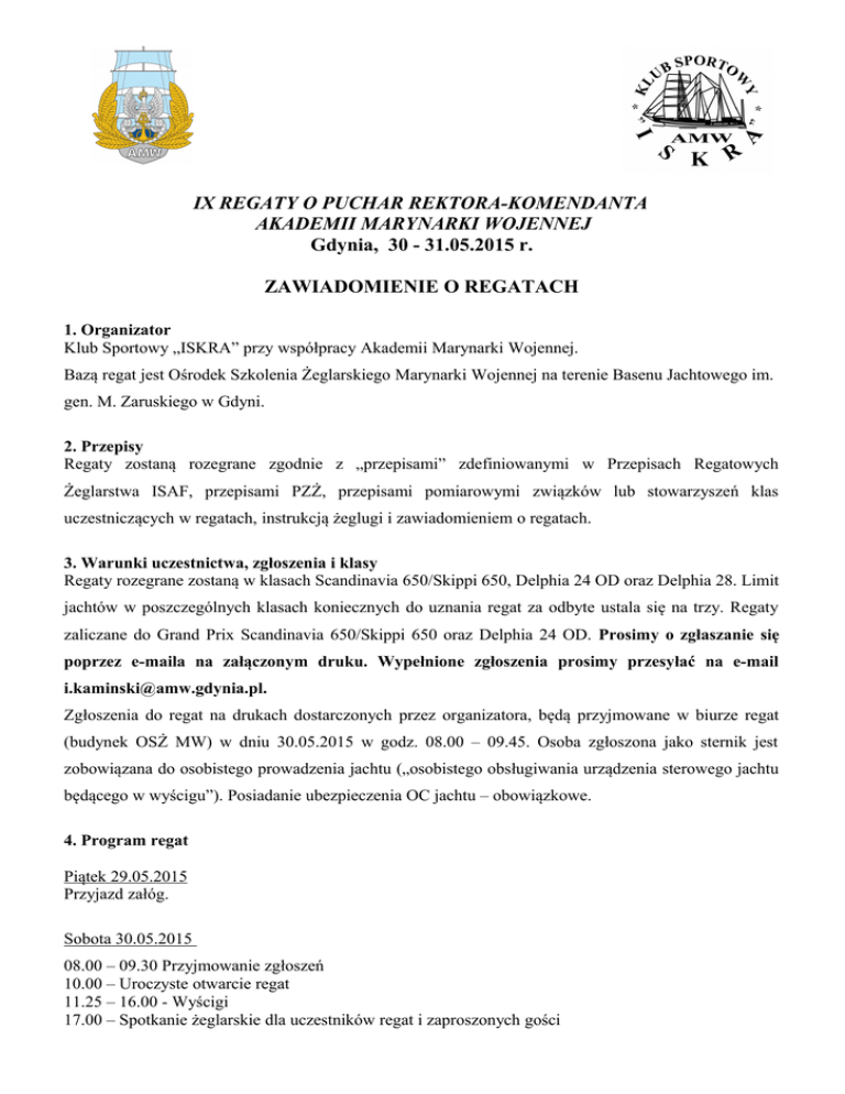 IX REGATY O PUCHAR REKTORA-KOMENDANTA AKADEMII MARYNARKI WOJENNEJ Gdynia, 30 - 31.05.2015 r. ZAWIADOMIENIE O REGATACH 1. Organizator Klub Sportowy „ISKRA” przy współpracy Akademii Marynarki Wojennej. Bazą regat jest Ośrodek Szkolenia Żeglarskiego Marynarki Wojennej na terenie Basenu Jachtowego im. gen. M. Zaruskiego w Gdyni. 2. Przepisy Regaty zostaną rozegrane zgodnie z „przepisami” zdefiniowanymi w Przepisach Regatowych Żeglarstwa ISAF, przepisami PZŻ, przepisami pomiarowymi związków lub stowarzyszeń klas uczestniczących w regatach, instrukcją żeglugi i zawiadomieniem o regatach. 3. Warunki uczestnictwa, zgłoszenia i klasy Regaty rozegrane zostaną w klasach Scandinavia 650/Skippi 650, Delphia 24 OD oraz Delphia 28. Limit jachtów w poszczególnych klasach koniecznych do uznania regat za odbyte ustala się na trzy. Regaty zaliczane do Grand Prix Scandinavia 650/Skippi 650 oraz Delphia 24 OD. Prosimy o zgłaszanie się poprzez e-maila na załączonym druku. Wypełnione zgłoszenia prosimy przesyłać na e-mail [email protected]. Zgłoszenia do regat na drukach dostarczonych przez organizatora, będą przyjmowane w biurze regat (budynek OSŻ MW) w dniu 30.05.2015 w godz. 08.00 – 09.45. Osoba zgłoszona jako sternik jest zobowiązana do osobistego prowadzenia jachtu („osobistego obsługiwania urządzenia sterowego jachtu będącego w wyścigu”). Posiadanie ubezpieczenia OC jachtu – obowiązkowe. 4. Program regat Piątek 29.05.2015 Przyjazd załóg. Sobota 30.05.2015 08.00 – 09.30 Przyjmowanie zgłoszeń 10.00 – Uroczyste otwarcie regat 11.25 – 16.00 - Wyścigi 17.00 – Spotkanie żeglarskie dla uczestników regat i zaproszonych gości Niedziela 31.05.2015 10.00 – 13.00 - Wyścigi 14.00 – 15.00 - Poczęstunek dla uczestników regat. 15.00 – Uroczyste zakończenie regat Planuje się rozegranie 7 wyścigów w klasie Scandinavia650/Skippi 650 i Delphia 24 OD oraz 5 w klasie Delphia 28. W dniu 31.05.2015 sygnał ostrzeżenia nie może być podany później niż o godzinie 13.00. 5. Instrukcja Żeglugi Instrukcja Żeglugi i opis trasy będą dostępne dla zawodników po zgłoszeniu się do regat w biurze regat. 6. Punktacja Regaty zostaną uznane za ważne po rozegraniu 1 wyścigu. W przypadku rozegrania 4 wyścigów i więcej, najgorszy rezultat jachtu zostanie odrzucony. 7. Nagrody Wg uznania organizatora. 8. Ochrona środowiska Jacht którego załoga wyrzuci śmieci do wody, może być ukarany decyzją Komisji Regatowej lub Zespołu Protestowego po rozpatrzeniu protestu. 9. Licencje Przypomina się wszystkim uczestnikom regat o konieczności posiadania licencji PZŻ na noszenie reklamy. 10.Zastrzeżenia odpowiedzialności Wszyscy uczestnicy biorą udział w regatach na własną odpowiedzialność. Żadna z czynności wykonana lub nie wykonana przez organizatorów nie zwalnia uczestników regat od ponoszenia odpowiedzialności za jakąkolwiek szkodę spowodowaną przez zawodnika lub jego jacht wynikającą z udział u w regatach. Załogi uczestniczące w regatach mają obowiązek przestrzegania przepisów żeglugowych obowiązujących na akwenie regat. 11. Informacje dodatkowe i osoby kontaktowe. Wodowanie: bezpłatnie slip w basenie jachtowym. Parking dla przyczep podłodziowych na terenie OSŻ MW lub parkingu AMW (Gdynia Oksywie). Informacje dodatkowe: Dariusz Sapiejka 602 700 723, 621 26 29 04 Ireneusz Kamiński 502 355 991, 621 26 25 46, e-mail [email protected]
