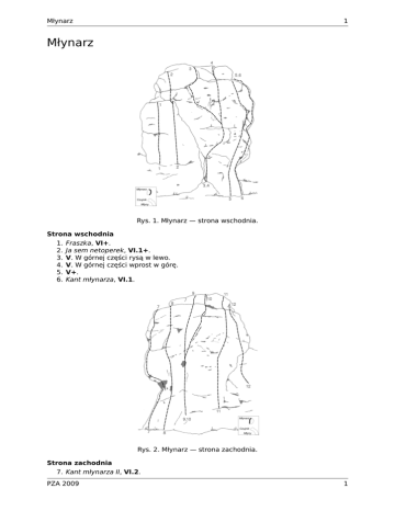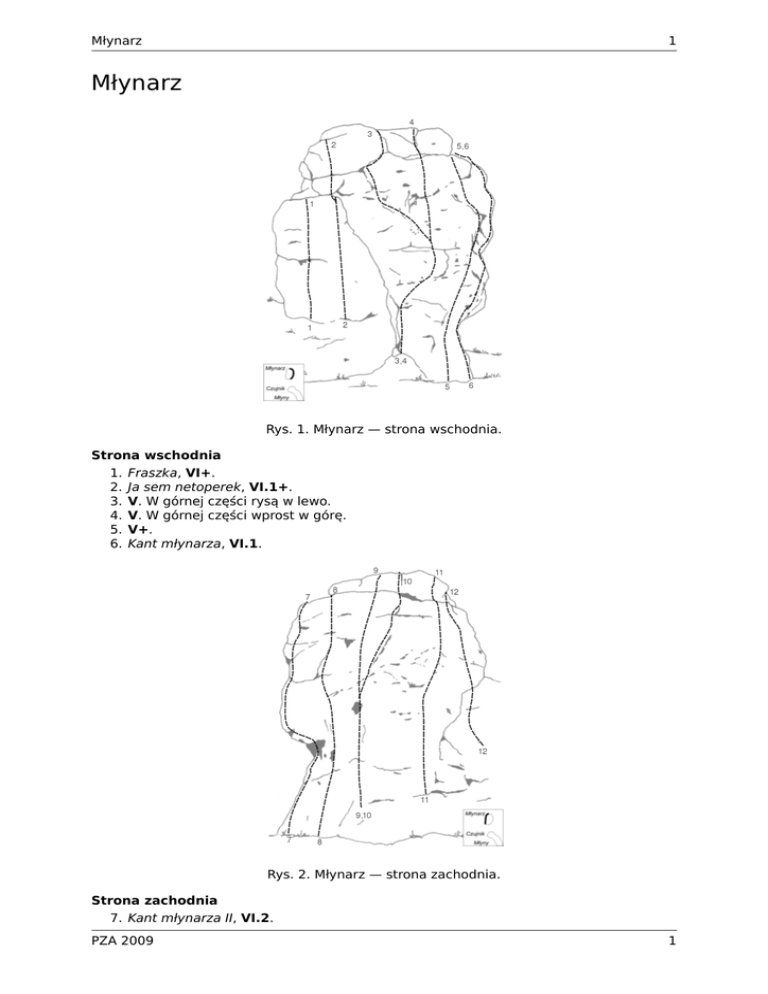 Młynarz 1 Młynarz Rys. 1. Młynarz — strona wschodnia. Strona wschodnia 1. Fraszka, VI+. 2. Ja sem netoperek, VI.1+. 3. V. W górnej części rysą w lewo. 4. V. W górnej części wprost w górę. 5. V+. 6. Kant młynarza, VI.1. Rys. 2. Młynarz — strona zachodnia. Strona zachodnia 7. Kant młynarza II, VI.2. PZA 2009 1 2 Młynarz 8. 9. 10. 11. 12. 2 Lewy młynarz, VI+. Direttissima, VI. VI. Wariant do Direttissimy, od dziupli w skos w prawo. VI. Prawy młynarz, V+. PZA 2009