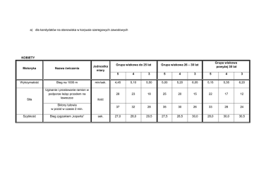 a) dla kandydatów na stanowiska w korpusie szeregowych zawodowych KOBIETY Motoryka Wytrzymałość Siła Nazwa ćwiczenia Bieg na 1000 m Uginanie i prostowanie ramion w podporze leżąc przodem na ławeczce Jednostka miary min/sek. Bieg zygzakiem „koperta” Grupa wiekowa powyżej 30 lat Grupa wiekowa 26 – 30 lat 5 4 3 5 4 3 5 4 3 4,45 5,10 5,50 5,00 5,20 6,05 5,15 5,35 6,20 28 23 18 25 20 15 22 17 12 37 32 28 35 30 26 33 28 24 27,0 28,0 29,5 27,5 28,5 30,0 28,0 30,0 30,5 ilość Skłony tułowia w przód w czasie 2 min. Szybkość Grupa wiekowa do 25 lat sek.