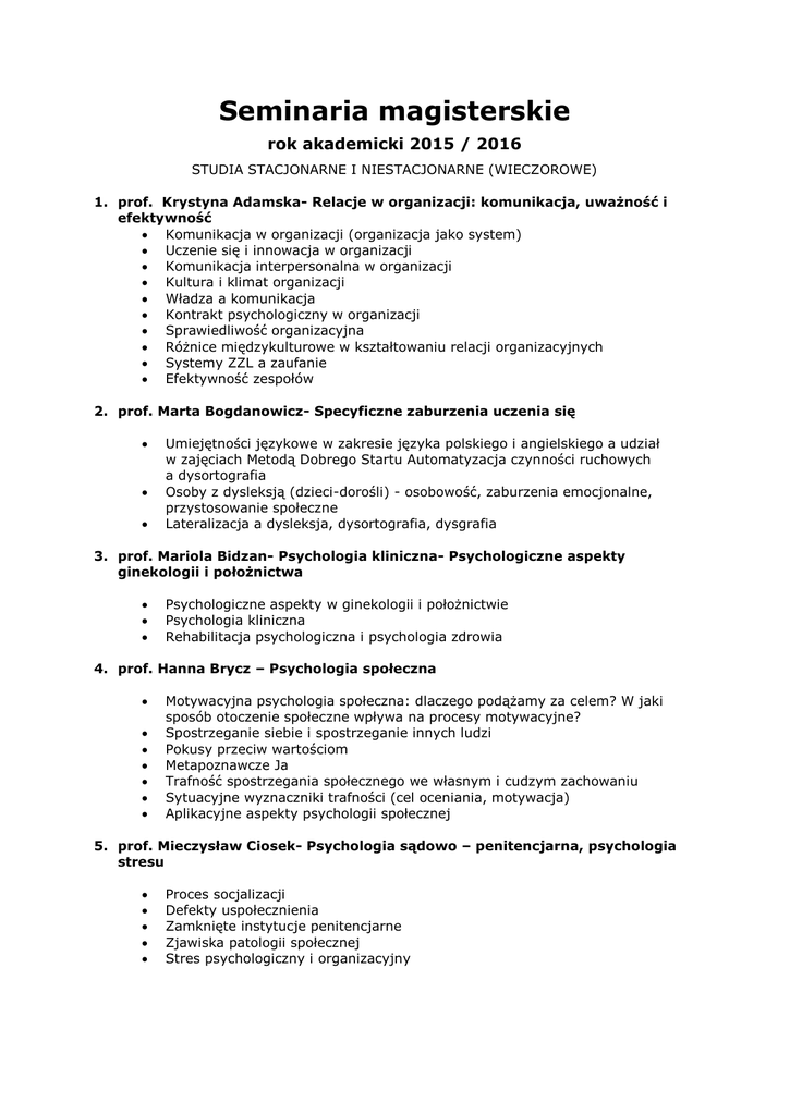 Seminaria magisterskie rok akademicki 2015 / 2016 STUDIA STACJONARNE I NIESTACJONARNE (WIECZOROWE) 1. prof. Krystyna Adamska- Relacje w organizacji: komunikacja, uważność i efektywność Komunikacja w organizacji (organizacja jako system) Uczenie się i innowacja w organizacji Komunikacja interpersonalna w organizacji Kultura i klimat organizacji Władza a komunikacja Kontrakt psychologiczny w organizacji Sprawiedliwość organizacyjna Różnice międzykulturowe w kształtowaniu relacji organizacyjnych Systemy ZZL a zaufanie Efektywność zespołów 2. prof. Marta Bogdanowicz- Specyficzne zaburzenia uczenia się Umiejętności językowe w zakresie języka polskiego i angielskiego a udział w zajęciach Metodą Dobrego Startu Automatyzacja czynności ruchowych a dysortografia Osoby z dysleksją (dzieci-dorośli) - osobowość, zaburzenia emocjonalne, przystosowanie społeczne Lateralizacja a dysleksja, dysortografia, dysgrafia 3. prof. Mariola Bidzan- Psychologia kliniczna- Psychologiczne aspekty ginekologii i położnictwa Psychologiczne aspekty w ginekologii i położnictwie Psychologia kliniczna Rehabilitacja psychologiczna i psychologia zdrowia 4. prof. Hanna Brycz – Psychologia społeczna Motywacyjna psychologia społeczna: dlaczego podążamy za celem? W jaki sposób otoczenie społeczne wpływa na procesy motywacyjne? Spostrzeganie siebie i spostrzeganie innych ludzi Pokusy przeciw wartościom Metapoznawcze Ja Trafność spostrzegania społecznego we własnym i cudzym zachowaniu Sytuacyjne wyznaczniki trafności (cel oceniania, motywacja) Aplikacyjne aspekty psychologii społecznej 5. prof. Mieczysław Ciosek- Psychologia sądowo – penitencjarna, psychologia stresu Proces socjalizacji Defekty uspołecznienia Zamknięte instytucje penitencjarne Zjawiska patologii społecznej Stres psychologiczny i organizacyjny 6. prof. Krzysztof Jodzio- Psychologia kliniczna, neuropsychologia i psychologia poznawcza Psychologia kliniczna Neuropsychologia Psychologia procesów poznawczych 7. prof. Małgorzata Lipowska - Psychologia dziecka Zespół nadpobudliwości psychoruchowej Dysleksja Współwystępowanie zaburzeń Psychologia wychowawcza dziecka 8. prof. Franciszek Makurat- Psychologia sportu Sport indywidualny i zespołowy Sport dzieci i młodzieży Sport jako czynnik rehabilitacyjny i socjalizacyjny w kontekście przystosowania Sport osób niepełnosprawnych Kształtowanie postaw sportowych i prozdrowotnych w kontekście rodziny Szkoły mistrzostwa sportowego 9. prof. Henryk Olszewski- Psychologia rozwoju- Psychologiczna problematyka starzenia się i starości Psychologia starzenia się Psychologia starości Zmiany rozwojowe w przebiegu życia człowieka Wydarzenia kryzysowe w przebiegu rozwoju 10.Prof. Michał Harciarek – Neuropsychologia medyczna, neuropsychologia kliniczna i eksperymentalna Funkcjonowanie poznawczo-emocjonalne osób z chorobami układu sercowonaczyniowego Funkcjonowanie poznawczo-emocjonalne osób z przewlekłą niewydolnością nerek Funkcjonowanie poznawczo-emocjonalne osób z cukrzycą Neuropsychologiczne następstwa HIV/AIDS Wpływ sposobu leczenia chorób somatycznych na funkcje poznawczoemocjonalne Znaczenie czynników demograficznych (np. wieku, wykształcenia) w procesie powstawania zmian neuropsychologicznych u pacjentów chorych somatycznie Neurofizjologiczne korelaty dysfunkcji wykonawczych u osób z przewlekłą niewydolnością nerek Diagnoza różnicowa chorób otępiennych (otępienie czołowo-skroniowe, choroba Alzheimera) Mózgowa organizacja procesów uwagi 11.prof. Małgorzata Niesiobędzka – Psychologia zachowań finansowych i konsumenckich Dysfunkcjonalne zachowania konsumenckie: kompulsywne kupowanie, kompulsywne gromadzenie Czynniki warunkujące przebieg i skutki prawidłowej i nieprawidłowej socjalizacji ekonomicznej i konsumenckiej Motywy kupowania ubezpieczeń; cechy osobowościowe a skłonność do ubezpieczania się Psychologiczna analiza zachowań związanych z oszczędzaniem i zadłużaniem się Czynniki społeczne i moralne w zachowaniach ekonomicznych Społeczno- psychologiczne uwarunkowania oszustw podatkowych Poczucie sprawiedliwości organizacyjnej a zachowania w organizacji Wyznaczniki kontraktu psychologicznego z organizacją Agresja i przemoc w organizacji 12.prof. Beata Pastwa – Wojciechowska – Kliniczne, sądowo-penitencjarne i seksuologiczne aspekty funkcjonowania człowieka Zaburzenia osobowości - analiza porównawcza modeli diagnostycznych i terapeutycznych, aspekty funkcjonowania w związkach, diagnoza, metodologia diagnozy Osobowościowe i kliniczne aspekty funkcjonowania i diagnozowania sprawców przestępstw na tle seksualnym Radzenie sobie z sytuacją izolacji więziennej w zależności od typu osobowości Psychologiczne aspekty analizy zeznań świadków Wiktymizacja - psychologiczne konsekwencje doznania traumy w związku z przestępstwem Funkcjonowanie seksualne człowieka - dysfunkcje i parafilie seksualne Uzależnienia a funkcjonowanie jednostkowe i rodzinne, zagadnienia współuzależnienia Psychologiczne aspekty funkcjonowania osób z chorobami alergicznymi i dermatologicznymi 13.prof. Wioletta Radziwiłłowicz - Psychologia kliniczna młodzieży 14.prof. Empiryczna weryfikacja modeli opisujących występowanie objawów depresyjnych u młodzieży Socjotropia i autonomia jako czynniki kształtujące przebieg kryzysu adolescencyjnego Kształtowanie się obrazu ciała u chłopców i dziewcząt w okresie dorastania Teresa Rostowska – Psychologiczne problemy małżeństwa i rodziny Więzi uczuciowe w małżeństwie i rodzinie Komunikacja i konflikty rodzinne Aktywność zawodowa a życie rodzinne Zdrowotne aspekty życia rodzinnego Funkcjonowanie rodziny z osobą chorą i niepełnosprawną Relacje w podsystemach rodzinnych Wychowawcze aspekty życia rodzinnego Transmisja międzypokoleniowa w rodzinie 15.prof. Anna Maria Zawadzka – W poszukiwaniu szczęścia w świecie konsumpcji i materializmu Typy kon