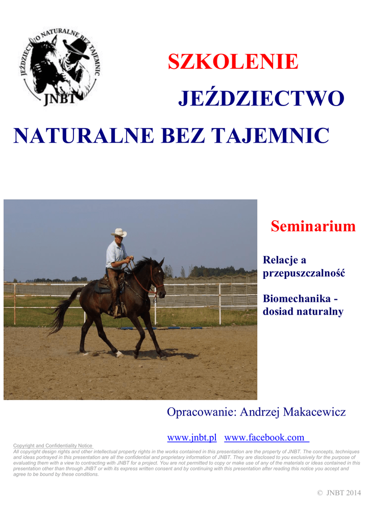 SZKOLENIE JEŹDZIECTWO NATURALNE BEZ TAJEMNIC Seminarium Relacje a przepuszczalność Biomechanika dosiad naturalny Opracowanie: Andrzej Makacewicz www.jnbt.pl www.facebook.com Copyright and Confidentiality Notice All copyright design rights and other intellectual property rights in the works contained in this presentation are the property of JNBT. The concepts, techniques and ideas portrayed in this presentation are all the confidential and proprietary information of JNBT. They are disclosed to you exclusively for the purpose of evaluating them with a view to contracting with JNBT for a project. You are not permitted to copy or make use of any of the materials or ideas contained in this presentation other than through JNBT or with its express written consent and by continuing with this presentation after reading this notice you accept and agree to be bound by these conditions. © JNBT 2014 Seminarium „Jeździectwo Naturalne bez Tajemnic ” 1.Relacje a przepuszczalność 2. Biomechanika-dosiad naturalny Termin: 9-10.01.2014 (pt/sob) godz. 10-19( sob 16) Lokalizacja: JANSOWO, Ośrodek Szkoleń i Rekreacji; ul. Sczanieckiej 2364-316 Kuślin tel. 605 639 254 e-mail: [email protected]; http://www.jansowo.pl/ Duże zainteresowanie poprzednim cyklem zdecydowało o kontynuacji seminariów w 2015 roku. W bieżącej edycji skupiamy się na wybranych elementach, problemach i detalach. Dwudniowe seminarium w drugiej edycji serii seminariów poświęconych koncepcjom naturalnego treningu koni. Znakomita okazja do kontaktu z wiedzą prezentowaną przez uznane krajowe autorytety w praktyce stosowania metod naturalnych. W trzech kolejnych miesiącach w dwudniowych sesjach , każdorazowo przez inną osobę będą prowadzone wykłady przeplatane pokazem ćwiczeń praktycznych z końmi. Wielowątkowa tematyka pomagająca rozwijać dotychczasowe relacje z koniem , ale z naciskiem położonym na stosowaniu metod naturalnych z siodła. Wiele cennych praktycznych uwag i metod także do stosowania w klasycznym stylu jazdy konnej i codziennym treningu. Wykładowca: Andrzej Makacewicz Koreferaty: Aleksandra Najman, Katarzyna Mroczkowska 1.Relacje a przepuszczalność w jeździectwie 1.1 Jak skupić konia na pomocach? 1.2 Co motywuje konia w treningu? 1.3 Warunkowania a relacje 1.4 Jak zbudować lekkość pomocy w pracy z ziemi? 1.5 Jak przełożyć pracę z ziemi na pracę w siodle 2. Biomechanika-dosiad naturalny. 2.1 Pomoce jeździeckie, komunikacja a fazy 2.2 Dosiad - pomoc naturalna, czy klasyczna? 2.3 Niedoceniony dosiad zewnętrzny 2.4 Balans podłużny i poprzeczny 2.5 Balans a praca rąk 2.6 Jak pomóc koniowi w odnalezieniu i rozwinięciu naturalnego ruchu w pracy pod siodłem? Andrzej Makacewicz ze swoim zespołem JNBT będzie prezentował równoległą pracę z 3 końmi o rozmaitym temperamencie, osobowości, predyspozycjach i doświadczeniu treningowym. Zgłoszenia przyjmowane są pod telefonem 605 639 254 lub [email protected] JNBT 2014