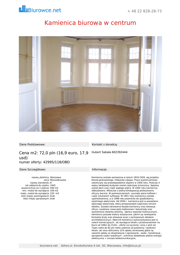 + 48 22 828-28-73 Kamienica biurowa w centrum Dane Podstawowe: Kontakt z doradcą: Cena m2: 72,0 pln (16,9 euro, 17,9 usd) Hubert Sabała 602392444 numer oferty: 42995/118/OBD Dane Szczegółowe: Informacje: nazwa_dzielnicy: Warszawa ulica: Marszałkowska nazwa_standardu: B rok oddania do użytku: 1945 powierzchnia na 1 piętrze: 500 m2 min. moduł do wynajęcia: 106 m2 maks. moduł do wynajęcia: 220 m2 ilość miejsc parkingowych: brak ilość miejsc garażowych: brak biurowce.net Kamienica została wzniesiona w latach 1910-1920, wg projektu Karola Jankowskiego i Edwarda Lilpopa. Prace wykończeniowe zakończyły się prawdopodobnie dopiero w 1926 roku. Podczas II wojny światowej budynek został częściowo zniszczony. Spalony został dach oraz część piątego piętra. W 1945 roku kamienicę odbudowano. Wówczas o jedną kondygnację podwyższono oficyny boczne. W pomieszczeniach usunięto piece kaflowe i część sztukaterii sufitowej. W 1951 roku kamienica została upaństwowiona, a w 1996 roku powróciła do spadkobiercy ostatniego właściciela. Od 2004 r. kamienica jest w posiadaniu obecnego właściciela, który przeprowadził częściowy remont obiektu. Została odnowiona fasada kamienicy oraz elewacja oficyn, osadzono nowe płyty balkonowe i balustrady oraz wymieniono stolarkę okienną. Oprócz walorów historycznych, kamienica posiada walory artystyczne, jakimi są rozwiązania formalne bryły oraz elewacje wraz z zachowanym detalem architektonicznym. Obecnie kamienica wykorzystywana jest w celach komercyjnych , do wynajęcia lokale z przeznaczeniem na biuro od 106m do 212m , oferta na życzenie, cena z am2 od 72pln netto do 82 pln netto zależnie od położenia i wielkości lokalu ,do ceny doliczamy 12% opłaty serwisowej gdzie są zawarte opłaty za eksploatacje ( ogrzewanie , woda , kanalizacja , sprzątanie części wspólnych , ochrona) dodatkowo płatne energia elektryczna + umowa telekomunikacyjna. Adres:ul. Konduktorska 4 lok. 30, Warszawa, [email protected]