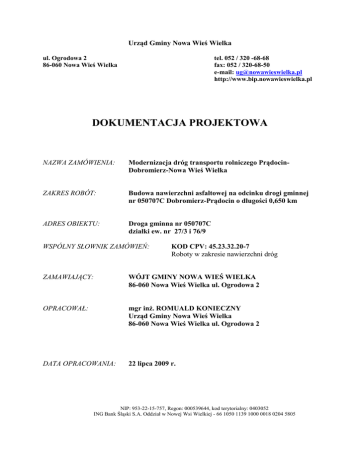 Urząd Gminy Nowa Wieś Wielka ul. Ogrodowa 2 86-060 Nowa Wieś Wielka tel. 052 / 320 -68-68 fax: 052 / 320-68-50 e-mail: [email protected] http://www.bip.nowawieswielka.pl DOKUMENTACJA PROJEKTOWA NAZWA ZAMÓWIENIA: Modernizacja dróg transportu rolniczego PrądocinDobromierz-Nowa Wieś Wielka ZAKRES ROBÓT: Budowa nawierzchni asfaltowej na odcinku drogi gminnej nr 050707C Dobromierz-Prądocin o długości 0,650 km ADRES OBIEKTU: Droga gminna nr 050707C działki ew. nr 27/3 i 76/9 WSPÓLNY SŁOWNIK ZAMÓWIEŃ: KOD CPV: 45.23.32.20-7 Roboty w zakresie nawierzchni dróg ZAMAWIAJĄCY: WÓJT GMINY NOWA WIEŚ WIELKA 86-060 Nowa Wieś Wielka ul. Ogrodowa 2 OPRACOWAŁ: mgr inŜ. ROMUALD KONIECZNY Urząd Gminy Nowa Wieś Wielka 86-060 Nowa Wieś Wielka ul. Ogrodowa 2 DATA OPRACOWANIA: 22 lipca 2009 r. NIP: 953-22-15-757, Regon: 000539644, kod terytorialny: 0403052 ING Bank Śląski S.A. Oddział w Nowej Wsi Wielkiej - 66 1050 1139 1000 0018 0204 5805 Zawartość dokumentacji projektowej 1. Opis techniczny. 2. Część rysunkowa. OPIS TECHNICZNY 1. Podstawa opracowania. Projekt modernizacji dróg transportu rolniczego Prądocin - Dobromierz - Nowa Wieś Wielka, obejmujący budowę nawierzchni asfaltowej na odcinku drogi gminnej 050707C Dobromierz - Prądocin o długości 0,650 km, opracowano w oparciu o niŜej wymienione materiały: - plan sytuacyjny istniejącej drogi, - mapa ewidencyjna gruntów w skali l :1000, - pomiary uzupełniające w zakresie niezbędnym do wykonania projektu wykonane we własnym zakresie, - uzgodnienia dokonywane w trakcie wykonywania dokumentacji, - rozporządzenie Ministra Transportu i Gospodarki Morskiej z dnia 2 marca 1999 r. w sprawie warunków technicznych, jakim powinny odpowiadać drogi publiczne i ich usytuowanie, - wytyczne projektowania dróg - Katalog Podstawowych Elementów Drogowych. 2. Stan istniejący i uzasadnienie realizacji zadania. Przedmiotowa droga gminna nr 050707C zlokalizowana jest w środkowej części gminy Nowa Wieś Wielka i łączy się poprzez Prądocin z drogą krajową nr 25. Teren wzdłuŜ przebiegu drogi jest płaski, połoŜony pomiędzy gruntami rolnymi oraz zabudową wsi Dobromierz. W pasie drogowym przebiega trasa linii napowietrznej elektroenergetycznej nn oraz sieć wodociągowa. Nawierzchnia drogi miała wykonaną wcześniej podbudowę z kruszywa betonowego i jest w dobrym stanie technicznym. Występują nieliczne nierówności i ubytki, a nawierzchnia jest przemieszana z gruntem. 3. Stan projektowany. 3.1. Podstawowe parametry techniczne. Parametry techniczne drogi projektuje się na podstawie parametrów odpowiadających klasie drogi D: - szerokość nawierzchni asfaltowej gr. 6 cm - 4,0 m, - szerokość poboczy umocnionych ulepszonym kruszywem budowlanym - 0,5 m, - grubość uzupełnienia podbudowy kruszywem po zagęszczeniu do 10 cm, - maksymalne pochylenie podłuŜne - max 4%, - pochylenie poprzeczne - 3,5%, - pochylenie pobocza - 7%. Budowa nawierzchni polega na wyprofilowaniu istniejącej nawierzchni ulepszonej z kruszywa betonowego przez zastosowanie mieszanki betonowo-asfaltowej, bez zmiany jej cech geometrycznych. Nie określa się rzędnych wysokościowych na górnej warstwie nawierzchni profilowej, naleŜy wyprofilować istniejące podłoŜe, uzupełnić podbudowę warstwą kruszywa o gr. 10 cm i wykonać nawierzchnię asfaltową gr. 6 cm. W planie droga przebiega w układzie istniejącej trasy. SkrzyŜowania z drogami gminnymi naleŜy wyokrąglić łukami o promieniu 6 m. Wg danych posiadanych przez Zamawiającego obciąŜenie ruchem przyjmuje się na poziomie średniego. 3.2. Nawierzchnia. Budowa nawierzchni polega na wykonaniu warstwy profilowej gr. 6,0 cm z mieszanki betonowo-asfaltowej o uziarnieniu 0/16mm wraz z uzupełnieniem podbudowy kruszywem po zagęszczeniu o gr. 10 cm i obustronnymi poboczami szer. 0,5 m. 3.3. Odwodnienie. Przewiduje się odwodnienie powierzchniowe drogi z odprowadzeniem wody opadowej na pobocze. 4. Wykonanie robót. Wszystkie roboty muszą być wykonywane zgodnie z wymogami aktualnych norm i przepisów. Roboty naleŜy prowadzić w sposób, który nie pogorszy stanu technicznego budynków jak i terenu przyległego. Wykonawca przed przystąpieniem do robót zobowiązany jest przygotować projekt organizacji ruchu. 4.1. Roboty przygotowawcze. W ramach robót przygotowawczych naleŜy odtworzyć punkty główne drogi. Odtworzenie naleŜy wykonać w oparciu o przyjęty w dokumentacji przebieg punktów głównych drogi. 4.2. Roboty nawierzchniowe. NaleŜy wykonać warstwę profilową nawierzchni z mieszanki betonowo-asfaltowej o uziarnieniu 0/16 mm gr. 6 cm wraz z uzupełnieniem podbudowy z kruszywa i obustronnymi poboczami szer. 0,5 m. 4.3. Roboty na poboczach. NaleŜy wykonać umocnienie poboczy kruszywem budowlanym. 5. Uwagi ogólne. W czasie prowadzenia robót naleŜy zachować szczególną ostroŜność w rejonie ewentualnego występowania urządzeń obcych, szczególnie podziemnych. Wszystkie napotkane urządzenia, takŜe te niezinwentaryzowane, naleŜy traktować jako czynne i roboty w ich rejonie prowadzić pod nadzorem uŜytkownika. CZĘŚĆ RYSUNKOWA 1. Rys. nr 1 Lokalizacja nawierzchni - początek zakresu 2. Rys. nr 2 Lokalizacja nawierzchni - koniec zakresu 3. Rys. nr 3 Przekrój normalny - konstrukcja nawierzchni na łuku 4. Rys. nr 4 Przekrój normalny - konstrukcja nawierzchni na prostej