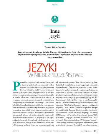 projekt Inne języki Tomasz Wicherkiewicz Zróżnicowanie językowe świata, Europy i jej regionów, które bezsprzecznie organizowało życie polityczne, ekonomiczne i społeczne na przestrzeni wieków, zaczyna zanikać. P rzez większą część wieku XX w różnych państwach w Europie (aczkolwiek nie wszędzie) wielość języków i ich odmian postrzegano jako przeszkodę (zwykle w lokalnej skali) w zrównoważonym rozwoju społecznym, a przez to i gospodarczym tych krajów. Dopiero w ostatnich dekadach tego wieku, z czasem, niejako w wyniku odrodzenia zainteresowania etnicznością i w związku z rozwojem ruchów etnicznych i regionalnych, Europejczycy zaczęli odkrywać, że otaczająca ich w czasach młodości różnorodność językowa: dialektów, gwar, narzeczy, substandardowych czy mówionych odmian angielskich vernaculars, francuskich patois, niemieckich Mundarten, rosyjskich наречии i говоров, niderlandzkich streektalen, hiszpańskich idiomas lub hablas, odchodzi w przeszłość. Stosunkowo szybko zjawiska te przybrały na sile, sprawiając, że instytucje i organizacje międzynarodowe oraz świat akademicki zaczęły bić na alarm i słać ostrzeżenia: zróżnicowanie językowe świata jest zagrożone, podobnie 2/2015 jak naturalne ekosystemy. Wraz z utratą swoich języków ludzie/ludy tracą kultury, zbiorową pamięć, tożsamość i jednostkowość. Zagrożenie wymarciem, a nawet śmierć języka to los języków mniejszych i większych społeczności na całym świecie, gdyż coraz więcej z tych języków nie jest już przekazywanych z pokolenia na pokolenie. Podawane z coraz większą dokładnością – np. przez ethnologue.org and SIL International – liczby języków świata (w przedziale między 6500 a 7200) z roku na rok mają coraz bardziej spadkowy charakter. Niektórzy językoznawcy wprost wyrażają swój niepokój. David Crystal (2000:18-19) pisał we wstępie do swojej książki Language Death: I consider it a plausible calculation that – at the rate things are going – the coming [XXI] century will see either the death or the doom of 90% of mankind’s languages. Wcześniej Michael Krauss (1992) stwierdził: That means only about 600 [languages] are „safe”. The majority of the world’s languages are vulnerable not just to decline but to extinction. Over half the world’s languages are Nauczanie wielojęzyczne [ 51 ] projekt moribund, i.e. not effectively passed on to the next generation. A middle position could assert 50% loss in the next 100 years. Kilka lat później prognozy tego uczonego zabrzmiały bardziej drastycznie: Out of approximately 5,000 to 6,000 still existing languages, over one tenth is in the last phase of their existence, and about 80 per cent of others are immediately threatened with extinction. It has been estimated that in 2050 only about 1,000 living languages will remain on earth (Krauss 1998). Obok programów i inicjatyw rewitalizacyjnych, to dokumentacja języków stanowi jedną z naukowych (a zarazem często społecznych) odpowiedzi na ich zagrożenie. Ta nowa transdyscyplinarna dziedzina językoznawstwa obejmuje m.in. zbieranie, gromadzenie, digitalizację i opracowanie oraz archiwizację próbek tekstów mówionych i pisanych – o ile takie w danym języku istnieją. Na jakość archiwów dokumentacji wpływa reprezentatywność próbek, tzn. zróżnicowanie wiekowe, społeczne, płciowe zarejestrowanych mówców, gatunków archiwizowanych tekstów i ich tematyki. Celem dokumentacji języka jest stworzenie jego reprezentatywnego korpusu. Korpusy takie (np. British National Corpus, Corpus of Contemporary American English, Datenbank für Gesprochenes Deutsch, Austrian Academy Corpus, Corpus del Español, Narodowy Korpus Języka Polskiego) powstają i są rozbudowywane w rezultacie długoterminowych projektów prowadzonych przez wielodyscyplinarne zespoły specjalistów, ze stabilnym instytucjonalnym finansowaniem oraz z wykorzystaniem najnowocześniejszego oprogramowania, baz danych i centrów komputerowych. O takich systematycznie gromadzonych, stabilnie utrzymywanych i reprezentatywnych zasobach można jednak mówić i myśleć głównie w przypadku języków silnych demograficznie, posiadających wysoki status polityczny/oficjalny. O wiele trudniej o takie wsparcie dla języków zagrożonych, których liczba użytkowników maleje. Jeszcze gorzej wygląda stan dokumentacji odmian językowych pozbawionych prestiżowego standardu (literackiego). Dziedzictwo językowe Rzeczypospolitej – baza dokumentacji zagrożonych języków Wiele odmian językowych w Polsce to takie właśnie słabo udokumentowane (mikro)etnolekty, zespoły dialektalne/ gwarowe, języki mniejszościowe, których społeczności użytkowników albo już zniknęły, albo są w najwyższym stopniu [ 52 ] wymarciem zagrożone. Polska jest krajem, który w swoim obecnym kształcie terytorialnym i etnodemograficznym uchodził po II wojnie światowej za jeden z najbardziej homogenicznych i jednojęzycznych (monolingwalnych) w Europie. Jak wiadomo jednak, terytorium Rzeczypospolitej (w najszerszym tego pojęcia znaczeniu) zawsze zamieszkiwały etniczne/regionalne wspólnoty komunikatywne, które mówiły językami innymi niż polski. Dialekty i zespoły gwarowe polszczyzny doczekały się już zaczątków korpusów, atlasów i innych opracowań dokumentacyjnych – jak np. ze wszech miar godne polecenia w wymiarze przekrojowym i edukacyjnym kompendium internetowe (pod red. prof. Haliny Karaś) Dialekty i gwary polskie, zawierające również odrębne zakładki nt. kaszubszczyzny i leksykon kaszubski. Brakowało jednak podobnego, a ze względu na większe zróżnicowanie repertuaru języków bardziej uniwersalnego kompendium wiedzy dotyczącego języków (i ich odmian) nie-polskich – zwłaszcza w zmiennym diachronicznie i terytorialnie aspekcie tytułowego dziedzictwa językowego Rzeczypospolitej. Tak powstał pomysł stworzenia portalu www