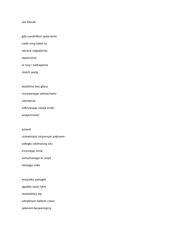 Jan Klósak gdy uwolniłem spojrzenie nade mną byłaś ty ubrana najpiękniej wpatrzona w rysy i zadrapania moich warg leżeliśmy bez głosu rozmawiając uśmiechami namiętnie odkrywając swoje znaki wzajemności powoli rozkwitałaś intymnym pięknem odległa zdolnością oka trzymając mnie wsłuchanego w szept twojego ciała wszystko zastygło zgubiło swój rytm stawaliśmy się odrębnym taktem czasu spleceni bezpamięcią gdy zaciskam powieki i wątpię czuję ten cud dziwne uczucie potrzeby oraz bycia nią Debiutanci Debiutanci od pierwszego wejrzenia niezgrabni w swoich gestach pełni czaru uroku i lekko zmanierowani tak – to my obici w świecie niezłomne indywidualności które szukały siebie wzajemnie Debiutujemy przy nieprzychylnej publice awarii prądu podczas strajku żywiołów jednak walczymy *** potrzebny kawałek cienia do okrycia schowania się na zewnątrz mój się zużył i jest mi nieswojo (może być używany po drugim właścicielu byle sprawny) poprzedni lokator mile widziany lubię towarzystwo w długie gorące dni nie jestem zaborczy chętnie dzielę się przestrzenią myśli i słów a boję się tylko nocami kiedy my sami cieniejemy *** Różne odcienie grozy bardzo niepokoi mnie ta mucha siedząca na białej ścianie absurdalnie nazbyt żywa niedostatecznie duża na kontrast gdyby była ćmą chociaż taką dużą ale ona nie chcieć nie chce rusza głową tylko jak przed atakiem a widzę jedynie ją ugina swoje odnóża start i okno jak dobrze że spokój Śmierć zatańczmy jakbyśmy się nie znali powiedziała ona – Śmierć zatańczyliśmy był to najpiękniejszy taniec przy dźwiękach które kiedyś brzmiały jej suknia falowała wspomnieniami włosy pachniały ideałem objęła mnie a dotknięcie jej szyi odebrało mi radość śmierci