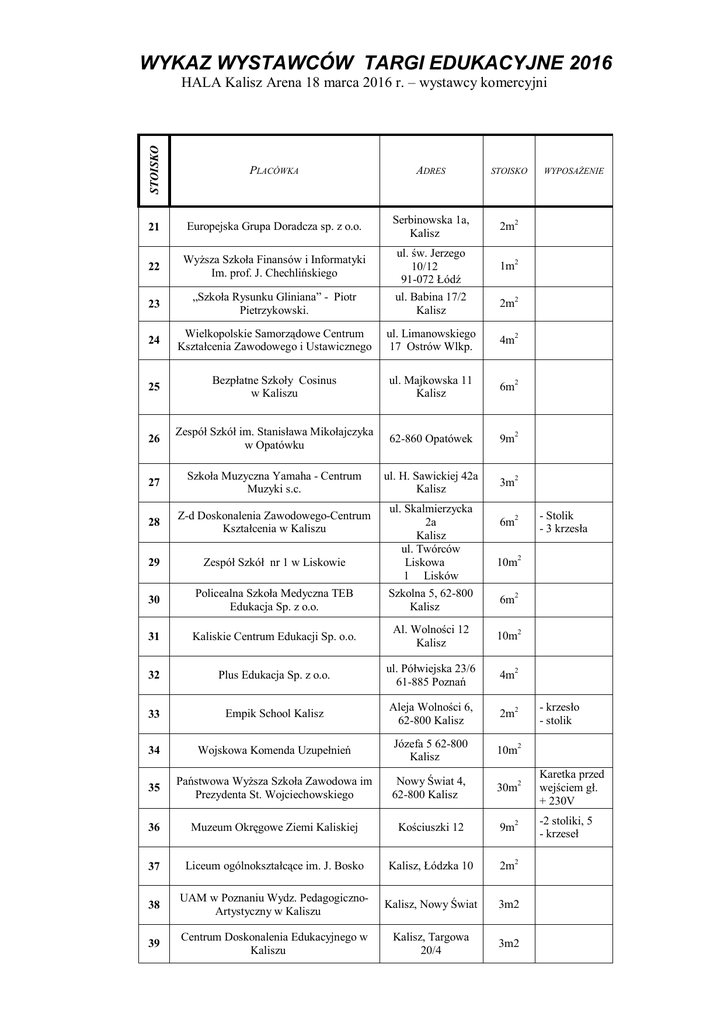 WYKAZ WYSTAWCÓW TARGI EDUKACYJNE 2016