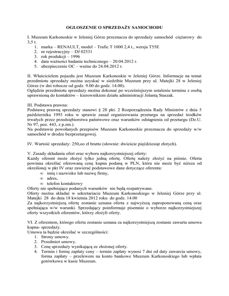 OGŁOSZENIE O SPRZEDAŻY SAMOCHODU I. Muzeum Karkonoskie w Jeleniej Górze przeznacza do sprzedaży samochód ciężarowy do 3,5 t. 1. marka – RENAULT, model – Trafic T 1000 2,4 t., wersja T55E 2. nr rejestracyjny – DJ 02531 3. rok produkcji – 1996 4. data ważności badania technicznego – 20.04.2012 r. 5. ubezpieczenie OC – ważne do 24.04.2012 r. II. Właścicielem pojazdu jest Muzeum Karkonoskie w Jeleniej Górze. Informacje na temat przedmiotu sprzedaży można uzyskać w siedzibie Muzeum przy ul. Matejki 28 w Jeleniej Górze (w dni robocze od godz. 9.00 do godz. 14.00). Oględzin przedmiotu sprzedaży można dokonać po wcześniejszym ustaleniu terminu z osobą uprawnioną do kontaktów – kierownikiem działu administracji Jolantą Staszak. III. Podstawa prawna: Podstawę prawną sprzedaży stanowi § 28 pkt. 2 Rozporządzenia Rady Ministrów z dnia 5 października 1993 roku w sprawie zasad organizowania przetargu na sprzedaż środków trwałych przez przedsiębiorstwa państwowe oraz warunków odstąpienia od przetargu (Dz.U. Nr 97, poz. 443, z p.zm.). Na podstawie powołanych przepisów Muzeum Karkonoskie przeznacza do sprzedaży w/w samochód w drodze bezprzetargowej. IV. Wartość sprzedaży: 250,oo zł brutto (słownie: dwieście pięćdziesiąt złotych). V. Zasady składania ofert oraz wyboru najkorzystniejszej oferty: Każdy oferent może złożyć tylko jedną ofertę. Ofertę należy złożyć na piśmie. Oferta powinna określać oferowaną cenę kupna podaną w PLN, która nie może być niższa od określonej w pkt IV oraz zawierać podstawowe dane dotyczące oferenta: • imię i nazwisko lub nazwę firmy, • adres, • telefon kontaktowy Oferty nie spełniające podanych warunków nie będą rozpatrywane. Oferty można składać w sekretariacie Muzeum Karkonoskiego w Jeleniej Górze przy ul. Matejki 28 do dnia 18 kwietnia 2012 roku do godz. 14.00 Za najkorzystniejszą ofertę zostanie uznana oferta z najwyższą zaproponowaną ceną oraz spełniająca w/w warunki. Sprzedający poinformuje pisemnie o wyborze najkorzystniejszej oferty wszystkich oferentów, którzy złożyli oferty. VI. Z oferentem, którego oferta zostanie uznana za najkorzystniejszą zostanie zawarta umowa kupna- sprzedaży. Umowa ta będzie określać w szczególności: 1. Strony umowy. 2. Przedmiot umowy. 3. Cenę sprzedaży wynikającą ze złożonej oferty. 4. Termin i formę zapłaty ceny – termin zapłaty wynosi 7 dni od daty zawarcia umowy, forma zapłaty – przelewem na konto bankowe Muzeum Karkonoskiego lub wpłata gotówkowa w kasie Muzeum. 5. Sposób odbioru przedmiotu sprzedaży – kupujący będzie uprawniony do odbioru przedmiotu sprzedaży po dokonaniu zapłaty umówionej ceny, koszty odbioru obciążają kupującego i w momencie dokonania zapłaty ponosi on całkowitą odpowiedzialność za przedmiot sprzedaży. 6. Wraz z dokonaniem zapłaty sprzedający przekaże kupującemu wszelkie dokumenty uprawniające kupującego do korzystania z przedmiotu sprzedaży. Kupujący jest zobowiązany dokonać na własny koszt i rachunek wszelkich zgłoszeń i opłat wynikających z przeniesienia własności przedmiotu sprzedaży. Jelenia Góra, dnia 13 kwietnia 2012 r. Zatwierdzam