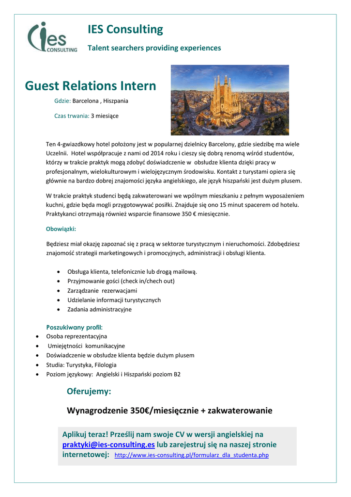IES Consulting Talent searchers providing experiences Guest Relations Intern Gdzie: Barcelona , Hiszpania Czas trwania: 3 miesiące Ten 4-gwiazdkowy hotel położony jest w popularnej dzielnicy Barcelony, gdzie siedzibę ma wiele Uczelnii. Hotel współpracuje z nami od 2014 roku i cieszy się dobrą renomą wśród studentów, którzy w trakcie praktyk mogą zdobyć doświadczenie w obsłudze klienta dzięki pracy w profesjonalnym, wielokulturowym i wielojęzycznym środowisku. Kontakt z turystami opiera się głównie na bardzo dobrej znajomości języka angielskiego, ale język hiszpański jest dużym plusem. W trakcie praktyk studenci będą zakwaterowani we wpólnym mieszkaniu z pełnym wyposażeniem kuchni, gdzie będa mogli przygotowywać posiłki. Znajduje się ono 15 minut spacerem od hotelu. Praktykanci otrzymają również wsparcie finansowe 350 € miesięcznie. Obowiązki: Będziesz miał okazję zapoznać się z pracą w sektorze turystycznym i nieruchomości. Zdobędziesz znajomość strategii marketingowych i promocyjnych, administracji i obsługi klienta. Obsługa klienta, telefonicznie lub drogą mailową. Przyjmowanie gości (check in/chech out) Zarządzanie rezerwacjami Udzielanie informacji turystycznych Zadania administracyjne Poszukiwany profil: Osoba reprezentacyjna Umiejętności komunikacyjne Doświadczenie w obsłudze klienta będzie dużym plusem Studia: Turystyka, Filologia Poziom językowy: Angielski i Hiszpański poziom B2 Oferujemy: Wynagrodzenie 350€/miesięcznie + zakwaterowanie Aplikuj teraz! Prześlij nam swoje CV w wersji angielskiej na [email protected] lub zarejestruj się na naszej stronie internetowej: http://www.ies-consulting.pl/formularz_dla_studenta.php