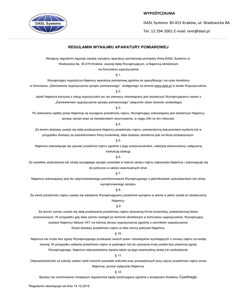 WYPOŻYCZALNIA DASL Systems 30-415 Kraków, ul. Wadowicka 8A Tel. 12 294 2001 E-mail: [email protected] REGULAMIN WYNAJMU APARATURY POMIAROWEJ Niniejszy regulamin reguluje zasady wynajmu aparatury pomiarowej pomiędzy firmą DASL Systems ul. Wadowicka 8a, 30-415 Kraków, zwanej dalej Wynajmującym, a Najemcą określonym na formularzu wypożyczenia. § 1. Wynajmujący wypożycza Najemcy aparaturę pomiarową zgodnie ze specyfikacją i na czas określony w formularzu „Zamówienie wypożyczenia sprzętu pomiarowego” dostępnego na stronie www.dasl.pl w dziale Wypożyczalnia. § 2. Jeżeli Najemca korzysta z usług wypożyczalni po raz pierwszy zobowiązany jest dostarczyć Wynajmującemu razem z „Zamówieniem wypożyczenia sprzętu pomiarowego” załączniki (skan dowodu osobistego) § 3. Po dokonaniu wpłaty przez Najemcę za wynajęcie przedmiotu najmu, Wynajmujący zobowiązany jest dostarczyć Najemcy sprawy sprzęt wraz ze świadectwem wzorcowania, w ciągu 24h (w dni robocze). § 4. Za termin dostawy uważa się datę przekazania Najemcy przedmiotu najmu, potwierdzoną dokumentem wydania lub w przypadku dostawy za pośrednictwem firmy kurierskiej, data dostawy określona jest na liście przewozowym. § 5. Najemca zobowiązuje się używać przedmiot najmu zgodnie z jego przeznaczeniem, należytą starannością i załączoną instrukcją obsługi. § 6. Za wszelkie uszkodzenia lub utratę wynajętego sprzętu powstałe w trakcie okresu najmu odpowiada Najemca i zobowiązuje się do pokrycia w całości ewentualnych strat. § 7. Najemca zobowiązany jest do natychmiastowego poinformowania Wynajmującego o jakichkolwiek uszkodzeniach lub utraty wynajmowanego sprzętu. § 8. Za zwrot przedmiotu najmu uważa się odesłanie Wynajmującemu przedmiot wynajmu w stanie w jakim został on dostarczony Najemcy. §9 Za termin zwrotu uważa się datę przekazania przedmiotu najmu stosownej firmie kurierskiej, potwierdzonej listem przewozowym. W przypadku gdy data zwrotu nastąpił po terminie określonym w formularzu wypożyczenia, Wynajmujący wystawi Najemcy fakturę VAT na różnicę okresu wypożyczenia zgodnie z cennikiem wypożyczenia. Koszt dostawy przedmiotu najmu w obie strony pokrywa Najemca. § 10. Najemca nie może bez zgody Wynajmującego przekazać swoich praw i obowiązków wynikających z umowy najmu na osobę trzecią. W przypadku oddania przedmiotu najmu w podnajem lub do używania innej osobie bez pisemnej zgody Wynajmującego, Najemca odpowiedzialny będzie także za jego ewentualną utratę lub uszkodzenie. § 11. Odpowiedzialność za szkody wobec osób trzecich powstałe wskutek prac prowadzonych przy użyciu przedmiotu najmu przez Najemcę, ponosi wyłącznie Najemca. § 12. Sprawy nie unormowane niniejszym regulaminie będą rozstrzygane zgodnie z przepisami Kodeksu Cywilnego. *Regulamin obowiązuje od dnia 14.12.2015