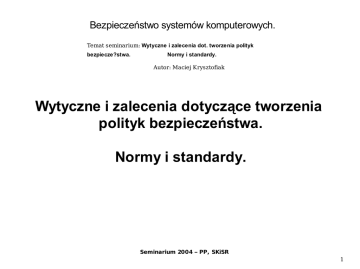 Bezpieczeństwo systemów komputerowych. Temat seminarium: Wytyczne i zalecenia dot. tworzenia polityk bezpiecze?stwa. Normy i standardy. Autor: Maciej Krysztofiak Wytyczne i zalecenia dotyczące tworzenia polityk bezpieczeństwa. Normy i standardy. Seminarium 2004 – PP, SKiSR 1 Wytyczne i zalecenia dotycz ące tworzenia polityki bezpiecze ństwa. Normy i standardy. Plan prezentacji Polityka bezpieczeństwa: ● Definicja ● Dokument ● Analiza ryzyka ● Wdrażanie ● Korzyści z wdrażania polityki Normy Audyt Outsourcing Podsumowanie Seminarium 2004 – PP, SKiSR 2 Wytyczne i zalecenia dotycz ące tworzenia polityki bezpiecze ństwa. Normy i standardy. Czym jest polityka bezpieczeństwa? Polityka bezpieczeństwa jest zbiorem spójnych, precyzyjnych i zgodnych z obowiązującym prawem przepisów, reguł i procedur, według których dana organizacja buduje, zarządza oraz udostępnia zasoby i systemy informacyjne i informatyczne. Określa ona, które zasoby mają być chronione i w jaki sposób. Oczywiście jej postulaty muszą odpowiadać oczekiwaniom właściciela systemów i zgromadzonych w nich informacji. W polityce bezpieczeństwa nie chodzi tylko o sporządzenie listy zakupów i czynności, które trzeba wykonać obecnie, ale też m.in. o wskazanie możliwych rodzajów naruszenia bezpieczeństwa w przyszłości (np. utrata i kradzież informacji, nieautoryzowany dostęp), scenariuszy postępowania w takich sytuacjach i działań, które pozwolą uniknąć powtórzenia się danego incydentu. Seminarium 2004 – PP, SKiSR 3 Wytyczne i zalecenia dotycz ące tworzenia polityki bezpiecze ństwa. Normy i standardy. Dokument bezpieczeństwa Wymiernym aspektem polityki bezpieczeństwa jest tak zwany dokument polityki bezpieczeństwa, który zawiera (określa) odpowiednie zasady, wytyczne, nakazy i zakazy, a także stopień swobody korzystania z sieci wewnętrznej i zewnętrznej. W ka żdej firmie powinien znajdować się oficjalny dokument polityka bezpieczeństwa zawieraj ący jasną i precyzyjną definicję bezpieczeństwa informacji i związaną z nią politykę ochrony. Dokument polityki bezpieczeństwa jest podstawą dla rozpoczęcia jakichkolwiek działań związanych z ochroną informacji w firmie. O opracowaniu i wdrożeniu polityki bezpieczeństwa decyduje zarz ąd, natomiast w jej tworzeniu oprócz personelu technicznego muszą uczestniczyć pracownicy różnych działów - zwykli użytkownicy. To oni będą podlegać przyj ętym regułom, ich opinia może wi ęc zapobiec np. nadmiernym, niemożliwym do wprowadzenia restrykcjom w dostępie do zasobów. Seminarium 2004 – PP, SKiSR 4 Wytyczne i zalecenia dotycz ące tworzenia polityki bezpiecze ństwa. Normy i standardy. Dokument bezpieczeństwa (2) Etapy tworzenie dokumentu polityki bezpieczeństwa w dużej części są zbieżne z etapami tworzenia tej polityki. Etap pierwszy: zdefiniowanie zagrożeń ● Etap drugi: konstruowanie zabezpieczeń organizacyjnych ● Etap trzeci: formowanie treści dokumentu ● Seminarium 2004 – PP, SKiSR 5 Wytyczne i zalecenia dotycz ące tworzenia polityki bezpiecze ństwa. Normy i standardy. Analiza ryzyka Podstawą prac jest przeprowadzenie analizy ryzyka związanego z przetwarzaniem informacji. Analiza ryzyka to systematyczny podział na kategorie zagrożeń danych i środków im przeciwdziałających oraz określenie planu działania, który większość zasobów (technicznych i pozatechnicznych) skieruje przeciw najbardziej prawdopodobnemu ryzyku. Dzięki temu możliwe jest zidentyfikowanie zagrożeń oraz określenie tych elementów systemów przetwarzających informacje, w których ryzyko jest największe. Pozwoli to w trakcie dalszych prac na zaproponowanie zabezpieczeń chroniących najbardziej zagrożone procesy informacyjne. Seminarium 2004 – PP, SKiSR 6 Wytyczne i zalecenia dotycz ące tworzenia polityki bezpiecze ństwa. Normy i standardy. Analiza ryzyka (2) Analiza ryzyka może być stosowana zarówno do nowych zasobów jak też do systemów będących już w trakcie eksploatacji. Można jej dokonać zarówno podczas projektowania systemu, przy planowaniu znaczących zmian jak też podczas okresowych przeglądów i kontroli wdrożenia zabezpieczeń. Seminarium 2004 – PP, SKiSR 7 Wytyczne i zalecenia dotycz ące tworzenia polityki bezpiecze ństwa. Normy i standardy. Wdrażanie polityki bezpieczeństwa Początkiem sukcesu wdrożenia polityki bezpieczeństwa jest jego odpowiedni plan (strategia) zawierający następujące etapy: Rozpoznanie problemu przetwarzania informacji w organizacji ● Tworzenie dokumentów Polityki Bezpieczeństwa ● Audyt bezpieczeństwa grup przetwarzanych informacji ● Wdrożenie Polityki Bezpieczeństwa Informacji ● ● Okresowe audyty bezpieczeństwa Seminarium 2004 – PP, SKiSR 8 Wytyczne i zalecenia dotycz ące tworzenia polityki bezpiecze ństwa. Normy i standardy. Korzyści Korzyści płynące z wdrożenia polityki bezpieczeństwa to: Zgodność z wymaganiami prawnymi; ● Pewniejsze działanie w sytuacji zagrożeń powodowanych przez czynniki wewnętrzne i zewnętrzne; ● Ochrona żywotnych interesów organizacji; ● Wysoka sprawność pracowników osiągana poprzez odpowiednie szkolenia; ● Lepsza organizacja pracy; ● Oszczędności finansowe; ● Utrzymanie przewagi nad konkurencją; ● Poprawa wizerunku firmy. ● Seminarium 2004 – PP, SKiSR 9 Wytyczne i zalecenia dotycz ące tworzenia polityki bezpiecze ństwa. Normy i standardy. Straty wynikające bezpośrednio z błędów związanych z niezabezpieczoną informacją: Straty materialne (przeciek informacji do konkurencji, gorsze warunki kontraktu); ●Odpowiedzialność karna lub cywilna; ●Bałagan organizacyjny; ●Niezgodność lub sprzeczność danych; ●Niewłaściwe decyzje; ●Niezgodne z wymaganiami wykonanie pracy, niekompetencja. ● Seminarium 2004 – PP, SKiSR 10 Wytyczne i zalecenia dotycz ące tworzenia polityki bezpiecze ństwa. Normy i standardy. Normy