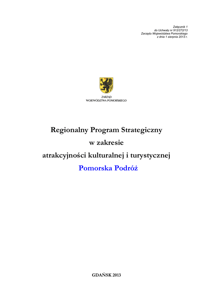 Załącznik 1 do Uchwały nr 912/272/13 Zarządu Województwa Pomorskiego z dnia 1 sierpnia 2013 r. Regionalny Program Strategiczny w zakresie atrakcyjności kulturalnej i turystycznej Pomorska Podróż GDAŃSK 2013 2 SPIS TREŚCI Wykaz użytych skrótów 4 Wprowadzenie 5 I. CZĘŚĆ DIAGNOSTYCZNA 7 1. Wnioski z analizy sytuacji w obszarze turystyki i kultury 7 2. Analiza SWOT 13 3. Wyzwania 15 II. CZĘŚĆ PROJEKCYJNA 16 1. Cele, Priorytety i Działania 18 2. Realizacja Zobowiązań SWP zapisanych w SRWP 2020 33 III. SYSTEM REALIZACJI 35 1. Kompetencje i odpowiedzialność kluczowych aktorów 35 2. Koordynacja z pozostałymi RPS 38 3. Procedura aktualizacji 41 4. Zasady i warunki wykorzystania Zintegrowanych Porozumień Terytorialnych 41 5. Ramy finansowe 44 6. System monitorowania i oceny realizacji 46 IV. ZAŁĄCZNIKI 48 Załącznik 1. Charakterystyka potencjalnych przedsięwzięć strategicznych 48 Załącznik 2. Wnioski z oceny ex-ante 51 Załącznik 3. Słownik kluczowych pojęć 53 3 Wykaz użytych skrótów 5M DF DIF DK DO DPW DRG DT GUS ICT JST LGD LGR LOT Mechanizm Finansowy EOG MKiDN MSiT NFOŚiGW ODR PO Ryby POT PROT PROW PSME RPO RPS SRWP SWP UE UMWP UNESCO WFOŚiGW Gdańsk, Sopot, Gdynia, Słupsk, Malbork Departament Finansów Departament Infrastruktury Departament Kultury Departament Organizacji Departament Promocji Departament Rozwoju Gospodarczego Departament Turystyki Główny Urząd Statystyczny ang. Information and Communication Technologies Jednostki Samorządu Terytorialnego Lokalna Grupa Działania Lokalna Grupa Rybacka Lokalna Organizacja Turystyczna Mechanizm Finansowy Europejskiego Obszaru Gospodarczego Ministerstwo Kultury i Dziedzictwa Narodowego Ministerstwo Sportu i Turystyki Narodowy Fundusz Ochrony Środowiska i Gospodarki Wodnej Ośrodek Doradztwa Rolniczego Program Operacyjny Ryby Polska Organizacja Turystyczna Pomorska Regionalna Organizacja Turystyczna Program Rozwoju Obszarów Wiejskich Pomorski System Monitoringu i Ewaluacji Regionalny Pogram Operacyjny Regionalny Pogram Strategiczny Strategia Rozwoju Województwa Pomorskiego Samorząd Województwa Pomorskiego Unia Europejska Urząd Marszałkowski Województwa Pomorskiego ang. United Nations Educational, Scientific and Cultural Organization; pol. Organizacja Narodów Zjednoczonych do Spraw Oświaty, Nauki i Kultury Wojewódzki Fundusz Ochrony Środowiska i Gospodarki Wodnej w Gdańsku 4 WPROWADZENIE 1. Regionalny Program Strategiczny w zakresie atrakcyjności kulturalnej i turystycznej, dalej określany nazwą RPS Pomorska Podróż lub słowem „Program”, jest jednym z sześciu zasadniczych narzędzi realizacji Strategii Rozwoju Województwa Pomorskiego 2020, dalej zwanej SRWP, uchwalonej przez Sejmik Województwa Pomorskiego w dniu 24 września 2012 r. (uchwała nr 458/XXII/12). 2. Podstawę prawną do opracowania Programu w zakresie atrakcyjności kulturalnej i turystycznej, poza uchwałą Sejmiku Województwa Pomorskiego nr 458/XXII/2012 z dnia 24 września 2012 r., stanowią: ustawa z dnia 6 grudnia 2006 r. o zasadach prowadzenia polityki rozwoju oraz ustawa z dnia 5 czerwca 1998 r. o samorządzie województwa. 3. Program pełni wiodącą rolę w konkretyzacji i realizacji wynikających z zapisów SRWP działań Samorządu Województwa Pomorskiego w takich obszarach tematycznych SRWP, jak wizerunek i marka turystyczna Pomorskiego oraz budowa sieciowych, ponadregionalnych produktów turystycznych. 4. Program, jako jeden z sześciu dokumentów wiodących w realizacji SRWP, należy do podstawowych punktów odniesienia, decydujących o kształcie przyjmowanych na poziomie Województwa Pomorskiego programów operacyjnych, a także ukierunkowaniu środków ujmowanych po stronie wydatków rozwojowych w budżecie województwa. 5. Zakres tematyczny Programu obejmuje jeden cel operacyjny SRWP i dwa kierunki działań SRWP. Osiągnięciu celu operacyjnego SRWP mają służyć działania rozwojowe, które w sposób wyselekcjonowany i zhierarchizowany wskazane zostały w części projekcyjnej dokumentu. RPS W ZAKRESIE ATRAKCYJNOŚCI KULTURALNEJ I TURYSTYCZNEJ Cel operacyjny z SRWP Unikatowa oferta turystyczna i kulturalna Kierunek działania z SRWP Rozwój sieciowych i kompleksowych produktów turystycznych Stworzenie rozpoznawalnej, wysokiej jakości oferty kulturalnej 6. Program prezentuje wynikającą ze SRWP politykę rozwoju w zakresie rozwoju regionalnych i sieciowych produktów turystycznych oraz budowy wizerunku i marki Pomorskiego, a także zawiera listę przedsięwzięć strategicznych, w tym wynikających ze zobowiązań Samorządu Województwa Pomorskiego zapisanych w SRWP. 7. W celu wdrożenia zasady zintegrowanego podejścia do rozwoju w wymiarze gospodarczym, społecznym i przestrzennym, Program określa zróżnicowaną terytorialnie politykę rozwoju województwa w poszczególnych działaniach rozwojowych, dotyczących obszaru tematycznego objętego dokumentem. 8. Projekt Programu, przyjęty Uchwałą Nr 325/234/13 Zarządu Województwa Pomorskiego z dnia 28 marca 2013 roku, zgodnie z wymogami wynikającymi z ustawy z dnia 6 grudnia 2006 r. o zasadach prowadzenia polityki rozwoju (Dz. U. 2006 Nr 227 poz. 1658 z późn. zm.) skierowany został do konsultacji społecznych, które trwały łącznie 61 dni (od 8 kwietnia do 7 czerwca 2013 r.). Raport z przebiegu konsultacji społecznych Programu przyjęty został Uchwałą Nr 782/264/13 Zarządu Województwa Pomorskiego z dnia 4 lipca 2013 roku, a następnie zmieniony Uchwałą Nr 911/272/13 Zarządu Województwa Pomorskiego z dnia 1 sierpnia 2013 roku. 9. Zgodnie z wymogami wynikającymi z ustawy z dnia 3 października 2008 r. o udostępnianiu informacji o środowisku i jego ochronie, udziale społeczeństwa w ochronie środowiska oraz o ocenach 5 oddziaływania na środowisko (Dz. U. z 2008 r. Nr 199, poz. 1227 z późn. zm.), projekt Programu podlegał strategicznej ocenie oddziaływania na środowisko, której zasadniczym elementem było sp