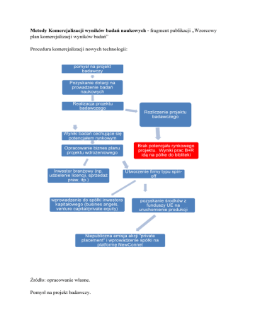 Metody Komercjalizacji wyników badań naukowych - fragment publikacji „Wzorcowy plan komercjalizacji wyników badań” Procedura komercjalizacji nowych technologii: pomysł na projekt badawczy Pozyskanie dotacji na prowadzenie badań naukowych Realizacja projektu badawczego Rozliczenie projektu badawczego Wyniki badań cechujące się potencjałem rynkowym Opracowanie biznes planu projektu wdrożeniowego Inwestor branżowy (np. udzielenie licencji, sprzedaż praw, itp.) wprowadzenie do spółki inwestora kapitałowego (busines angels, venture capital/private equity) Brak potencjału rynkowego projektu. Wyniki prac B+R idą na pólke do bibliteki Utworzenie firmy typu spinoff pozyskanie środków z funduszy UE na uruchomienie produkcji Niepubliczna emisja akcji "private placement" i wprowadzenie spółki na platformę NewConnet Źródło: opracowanie własne. Pomysł na projekt badawczy. Jeżeli nie planuje się zakończenie projektu badawczego na etapie rozliczenia projektu należy na etapie jego konstruowania uwzględnić warunki panujące na rynku komercyjnym. Należy zatem: • określić jakie potrzeby rynkowe nasze działania badawcze mają zaspokoić. • sprawdzić czy podobne produkty lub usługi, które nasz projekt badawczy ma wprowadzić, lub udoskonalić nie są dostępne na rynku. • zdefiniować potencjalne rynki zbytu • określić użytkowników końcowych • wskazać bariery i szanse • zdefiniować potencjalne przeszkody, które nasza technologia musi pokonać • wskazać sposoby eliminacji barier uniemożliwiających odniesienie sukcesu rynkowego. Większość odpowiedzi na powyższe pytania można pozyskać bez znacznych nakładów finansowych. Dostępne one będą w czasopismach branżowych, Internecie, publikacjach reklamowych oraz raportach dla akcjonariuszy firm konkurencyjnych, bibliotece, bezpłatnych bazach danych itp. Pozyskanie dotacji na prowadzenie badań naukowych.Aby pozyskać dotację należy wypełnić odpowiednią dla danego funduszu dokumentacje aplikacyjną. W przypadku braku doświadczenie w aplikowaniu o środki zasadne jest skorzystanie z usług wyspecjalizowanych firm konsultingowych. Realizacja projektu badawczego. Jeżeli jest to możliwe wskazana jest współpraca z firmami działającymi w branży dla której planujemy wprowadzenie nowoczesnych technologii. W przypadku niektórych programów grantowych jest to wręcz obligatoryjne np. w ramach Inicjatywy Technologicznej konieczne jest na etapie składania wniosku o grant podpisanie umowy o współpracy z firmą zainteresowaną wdrożeniem do produkcji wyników prac badawczych. Dzięki temu zespół naukowców na bieżąco może korzystać z doświadczeń i know–how firmy, co zwiększa znaczącą szanse na sukces rynkowy przedsięwzięcia. Bieżąca współpraca z biznesem pozwala na uniknięcie wielu barier występujących w fazie wdrożeniowej projektu. Należy podkreślić, iż zdecydowana większość prac badawczych kończy się niestety przedwcześnie, a wyniki prac badawczych kończą się jedynie publikacją dostępną w bibliotece. Wbrew pozorom proces wdrożenia nowych technologii cechujących się znaczącym potencjałem rynkowym jest równie trudny jak stworzenie takiej technologii. Przykładowa procedura wdrażania innowacji technicznej do produkcji polegającej na uruchomieniu produkcji: • Analiza planowanej wielkości produkcji • Analiza technologii w powiązaniu z wielkością produkcji • Dobór optymalnej technologii dla danej produkcji • Analiza dostępnych maszyn i przyrządów • Wybór zestawu maszyn odpowiedniego do planowanej produkcji • Plan zagospodarowania miejsca postawienia maszyn i urządzeń • Opracowanie studium wykonalności planowanej do wdrożenia technologii • Opracowanie technologii w oparciu o wybrany rodzaj maszyn, urządzeń i przyrządów • • • • • • • • Dobór narzędzi oraz akcesoriów i materiałów zużywalnych do wykonania obróbki Opracowanie założeń do zaprojektowania przyrządów specjalnych Nadzór nad prawidłowością ustawienia ciągu technologicznego Sprawdzenie prawidłowości zaprojektowanej technologii Sprawdzenie prawidłowości doboru narzędzi, przyrządów i materiałów zużywalnych Optymalizacja ciągu technologicznego Optymalizacja prawidłowości zaprojektowanej technologii Optymalizacja prawidłowości doboru narzędzi, przyrządów i materiałów zużywalnych Biznes plan projektu wdrożeniowego powinien zawierać szczegółową analizę określającą warunki rynkowe, szczegółową procedurę uruchamiania produkcji oraz kompleksową analizę finansową. Sugeruje się zlecenie wykonania analiz wyspecjalizowanej firmie doradczej. Oceny efektywności możliwości komercjalizacji technologii dokonuje się na podstawie analizy biznesplanu (biznesplan powinien zatem obejmować poniżej określone zagadnienia) oraz ewentualnych rozmów z twórcami technologii. Oceny możliwości komercjalizacji wyników badań naukowych dokonać należy poprzez uzyskanie odpowiedzi na następujące pytania: 1. Czy jest jasno określony produkt/usługa będący efektem realizacji projektu i czy opisane są jego właściwości (szczególnie te wyróżniające go spośród innych podobnych produktów lub do poprzedniej jego wersji w przypadku gdy projekt dotyczy rozwoju już istniejącego produktu)? 2. Czy jest dokładnie zdefiniowany przyszły rynek zbytu? Czy jest oszacowana jego wielkość? Przy czym należy również skupić się na dodatkowych zagadnieniach: a. jaka jest na nim konkurencja (kto, jakie wielkości udziałów, bariery wejścia)? b. jakie istnieją potencjalne substytuty w stosunku do naszego produktu? c. jak ma się jakość (właściwości) naszego produktu w stosunku do najbliższych produktów konkurencyjnych i substytutów? d. jak ma się cena naszego produktu do cen produktów konkurencyjnych/substytucyjnych? e. jakie są możliwości/bariery wejścia na dany rynek (w przypadku gdy prod