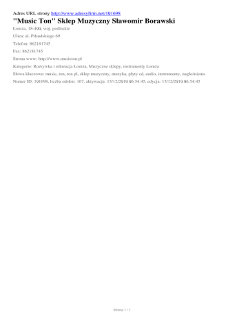 Adres URL strony http://www.adresyfirm.net/101698 "Music Ton" Sklep Muzyczny Sławomir Borawski Łomża, 18-400, woj. podlaskie Ulica: al. Piłsudskiego 69 Telefon: 862181745 Fax: 862181745 Strona www: http://www.musicton.pl Kategorie: Rozrywka i rekreacja Łomża, Muzyczne sklepy, instrumenty Łomża Słowa kluczowe: music, ton, ton pl, sklep muzyczny, muzyka, płyty cd, audio, instrumenty, nagłośnienie Numer ID: 101698, liczba odsłon: 167, aktywacja: 15/12/2010 06:54:45, edycja: 15/12/2010 06:54:45 Strona 1 / 1