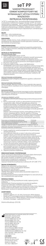 seT PP SAMOWYTRAWIAJĄCY CEMENT KOMPOZYTOWY NIE WYMAGAJĄCY UŻYCIA SYSTEMU WIĄŻĄCEGO INSTRUKCJA POSTĘPOWANIA P O L S K I ‘seT PP’ to uwalniający fluor samowytrawiający cement adhezyjny o podwójnym mechanizmie wiązania. Stosując ‘seT PP’ nie musisz używać systemu wiążącego. ‘seT PP’ jest przeznaczony do osadzania uzupełnień wykonanych metodą pośrednią z ceramiki, metalu lub materiału kompozytowego: wkładów, nakładów, koron, mostów, wkładów koronowo-korzeniowych indywidualnych i standardowych oraz licówek. SKŁAD: 35% masy – estry metakrylanowe 65% masy – nieorganiczny wypełniacz WSKAZANIA: Wkłady, nakłady, korony, mosty, wkłady koronowo-korzeniowe standardowe lub indywidualne i licówki wykonane z ceramiki, metalu lub materiału kompozytowego. PRZECIWWSKAZANIA: Produkt może spowodować u niektórych pacjentów podrażnienie skóry. Zrezygnuj wówczas z dalszego stosowania materiału i wezwij pomoc medyczną. INSTRUKCJA POSTĘPOWANIA: PRZYGOTOWANIE ZĘBA: 1. Wybierz odpowiedni odcień ‘seT PP’. 2. Usuń uzupełnienie tymczasowe i dokładnie wyczyść opracowane powierzchnie zęba z cementu tymczasowego przy użyciu beztłuszczowego pumeksu (UWAGA: do osadzenia uzupełnienia tymczasowego nie używaj cementów zawierających eugenol). 3. Przymierz uzupełnienie. 4. Ponownie wypłucz wodą i wysusz. NIE PRZESUSZAJ. OSTRZEŻENIE: Jeśli konieczna jest dodatkowa ochrona miazgi zęba, przed pobraniem wycisku użyj twardniejącego wyścielacza na bazie wodorotlenku wapnia. Substancje takie jak: woda utleniona, środki znoszące nadwrażliwość zębiny, środki dezynfekujące, środki obkurczające naczynia, środki do impregnacji zębiny itp. mogą spowodować zaburzenie reakcji polimeryzacji i osłabienie siły wiązania cementu. PRZYGOTOWANIE UZUPEŁNIENIA: Dokładnie wyczyść i przygotuj uzupełnienie zgodnie z zaleceniami producenta. PRZYGOTOWANIE STRZYKAWKI: Zdejmij zakrętkę. Wyciśnij na tackę 2-3mm materiału (aby upewnić się, że prawidłowo wydobywa się ze strzykawki). Umocuj końcówkę mieszającą. MIESZANIE RĘCZNE Nie mocując uprzednio końcówki mieszającej wyciśnij odpowiednią ilość materiału na podłoże do zarabiania. Mieszaj bazę i katalizator szpatułką przez 30 sekund. APLIKACJA CEMENTU ‘seT PP’: 1. Pamiętaj o ochronie pola zabiegowego przed zanieczyszczeniem śliną. 2. Równo rozprowadź ‘seT PP’ po odpowiednich powierzchniach uzupełnienia i zęba. UWAGA: Gdy aplikujesz cement do kanału korzeniowego, nie używaj igły Lentulo, ponieważ takie postępowanie znacząco przyspieszy wiązanie cementu. Podczas osadzania wkładu koronowo-korzeniowego wykonaj kilka wibrujących ruchów aby uwolnić pozostające w kanale pęcherzyki powietrza. UWAGA: Jeśli cementujesz licówki, przed aplikacją seT PP użyj systemu wiążącego (jak Go!, Stae itp. zgodnie z instrukcją producenta i z uwzględnieniem procedury wytrawiania tkanek zęba) aby zwiększyć siłę wiązania. Cementuj tylko 1-2 licówki jednocześnie ponieważ czas pracy materiału jest ograniczony. Czas pracy w temperaturze pokojowej 2 minuty Czas wiązania w temperaturze jamy ustnej 5 minut Czas polimeryzacji światłem 20 sekund Uwaga: Powyższe wartości są przybliżone i mogą się różnić w zależności od warunków przechowywania materiału, wilgotności, daty produkcji materiału i temperatury. 3. Osadź uzupełnienie i przed przystąpieniem do polimeryzacji odczekaj 30 sekund. 4. Usuń nadmiary materiału w czasie 2 sekund po polimeryzacji światłem lub po 2 minutach od rozpoczęcia mieszania. UWAGA: Jeśli nadmiary cementu są usuwane z wykorzystaniem kulek z waty lub podobnych przyborów należy starać się, by przy osadzaniu uzupełnienia pozostawić jak najmniejszą ilość nadmiarów. Niezwłocznie po rozpoczęciu polimeryzacji lub chemicznym wiązaniu materiału należy, w celu zapobiegania inhibicji tlenowej, pokryć nadmiary żelem glicerynowym. 5.W celu przyspieszenia wiązania przeprowadź dokładną polimeryzację (minimum 20 sekund na każdą powierzchnię). W przypadku odbudów z materiałów kompozytowych lub ceramicznych polimeryzuj ‘seT PP’ poprzez odbudowę. 6.Wypoleruj obrzeża uzupełnienia. PRZECHOWYWANIE I POSTĘPOWANIE: W celu zachowania odpowiednich właściwości fizyko-chemicznych, zaleca się przechowywanie produktu w lodówce. Nie narażać produktu na działanie wysokich temperatur. Przechowuj w temperaturze w zakresie 2°-25°C (35°-77°F) Przed użyciem przechowuj w chłodziarce. Używaj w temperaturze pokojowej w zakresie 20°-25°C (68°-77°F) ŚRODKI OSTROŻNOŚCI: Wyłącznie do zastosowań profesjonalnych. Przechowuj w miejscu niedostępnym dla dzieci. Do zastosowań zewnętrznych. Nie używaj po upływie okresu trwałości. UWAGA: Pod rygorem prawa zaleca się sprzedaż wyłącznie na potrzeby dentystów. Certyfikaty bezpieczeństwa materiału dostępne na: www.sdi.com.au lub u przedstawiciela regionalnego. PIERWSZA POMOC: Oczy (kontakt): Przemyj niezwłocznie wodą i zapewnij pomoc medyczną. Skóra (kontakt): Przemyj niezwłocznie szmatką lub gazikiem nasączonym alkoholem. Dokładnie wypłucz wodą. Przyjęcie doustne: Nakaż wypicie znacznej ilości wody/mleka. Zapewnij pomoc medyczną jeśli objawy zatrucia będą się utrzymywać. Wchłonięcie: nie powinno wywołać objawów klinicznych. ASORTYMENT: - strzykawki 7g - dostępne odcienie: A1, A2, OA3, Translucent, White Opaque. - Zestaw seT PP zawierający po jednej strzykawce w odcieniach A1, A2, OA3,Translucent, White Opaque i 70 końcówek mieszających. - Końcówki mieszające - opakowanie 50 sztuk. Ostatnia Aktualizacja: 2012-06. Wyprodukowano w Australii przez SDI Limited Bayswater, Victoria 3153 Australia 1 800 337 003 Austria 00800 022 55 734 Brazylia 0800 770 1735 Francja 00800 022 55 734 Niemcy 0800 100 5759 Irlandia 01 886 9577 Włochy 800 780625 Nowa Zelandia 0800 734 034 Hiszpania 00800 022 55 734 Wielka Brytania 0080
