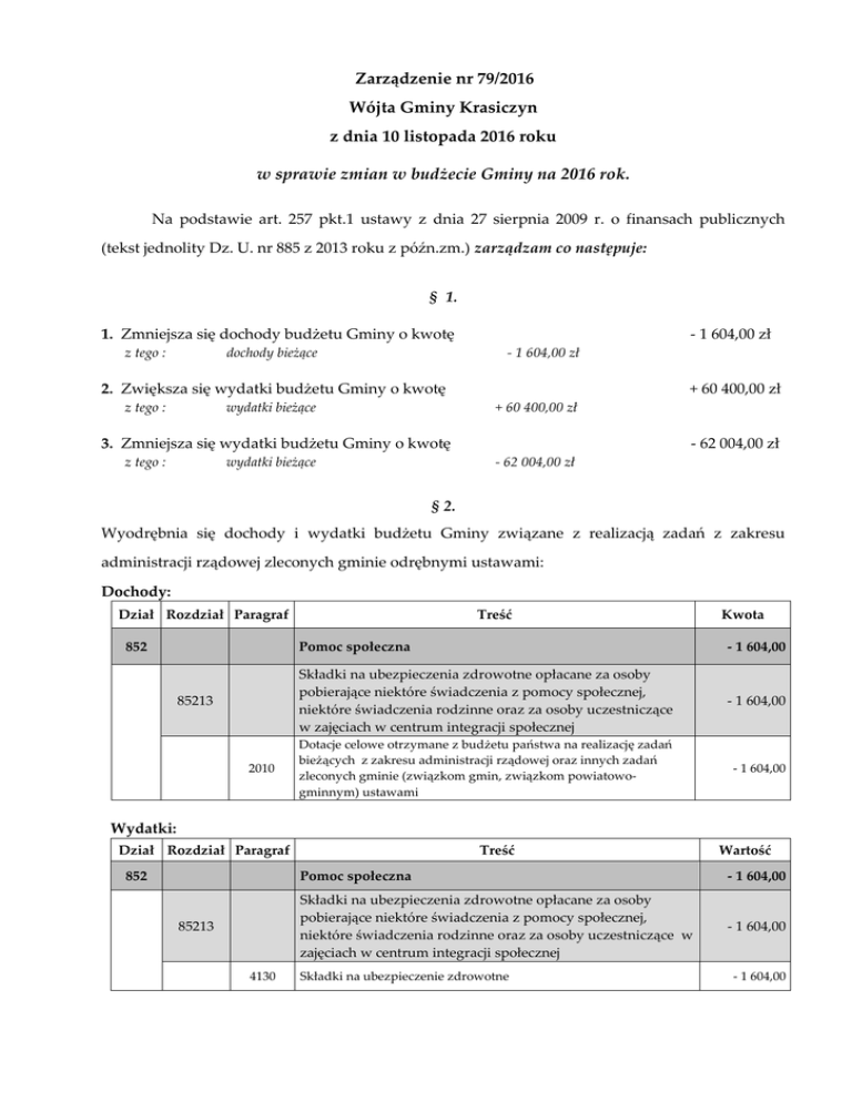 Zarządzenie nr 79/2016 Wójta Gminy Krasiczyn z dnia 10 listopada 2016 roku w sprawie zmian w budżecie Gminy na 2016 rok. Na podstawie art. 257 pkt.1 ustawy z dnia 27 sierpnia 2009 r. o finansach publicznych (tekst jednolity Dz. U. nr 885 z 2013 roku z późn.zm.) zarządzam co następuje: § 1. 1. Zmniejsza się dochody budżetu Gminy o kwotę z tego : dochody bieżące - 1 604,00 zł - 1 604,00 zł 2. Zwiększa się wydatki budżetu Gminy o kwotę z tego : wydatki bieżące + 60 400,00 zł + 60 400,00 zł 3. Zmniejsza się wydatki budżetu Gminy o kwotę z tego : wydatki bieżące - 62 004,00 zł - 62 004,00 zł § 2. Wyodrębnia się dochody i wydatki budżetu Gminy związane z realizacją zadań z zakresu administracji rządowej zleconych gminie odrębnymi ustawami: Dochody: Dział Rozdział Paragraf 852 85213 2010 Treść Kwota Pomoc społeczna - 1 604,00 Składki na ubezpieczenia zdrowotne opłacane za osoby pobierające niektóre świadczenia z pomocy społecznej, niektóre świadczenia rodzinne oraz za osoby uczestniczące w zajęciach w centrum integracji społecznej - 1 604,00 Dotacje celowe otrzymane z budżetu państwa na realizację zadań bieżących z zakresu administracji rządowej oraz innych zadań zleconych gminie (związkom gmin, związkom powiatowogminnym) ustawami - 1 604,00 Wydatki: Dział Rozdział Paragraf 852 85213 4130 Treść Wartość Pomoc społeczna - 1 604,00 Składki na ubezpieczenia zdrowotne opłacane za osoby pobierające niektóre świadczenia z pomocy społecznej, niektóre świadczenia rodzinne oraz za osoby uczestniczące w zajęciach w centrum integracji społecznej - 1 604,00 Składki na ubezpieczenie zdrowotne - 1 604,00 § 3. Wprowadza się zmianę w dochodach budżetu Gminy: Zmiany dochodów budżetowych Dział Rozdział Paragraf 852 85213 2010 Treść Kwota Pomoc społeczna - 1 604,00 Składki na ubezpieczenia zdrowotne opłacane za osoby pobierające niektóre świadczenia z pomocy społecznej, niektóre świadczenia rodzinne oraz za osoby uczestniczące w zajęciach w centrum integracji społecznej - 1 604,00 Dotacje celowe otrzymane z budżetu państwa na realizację zadań bieżących z zakresu administracji rządowej oraz innych zadań zleconych gminie (związkom gmin, związkom powiatowo-gminnym) ustawami Razem: - 1 604,00 - 1 604,00 Podstawą do wprowadzenia zmian w dochodach jest decyzja : Wojewody Podkarpackiego znak F.VI.3111.1.246.2016 z dnia 09-11-2016 r. § 4. Wprowadza się zmianę w wydatkach budżetu Gminy: Zmiany wydatków budżetowych Dział Rozdział Paragraf 010 01095 Treść Rolnictwo i łowiectwo 0,00 Pozostała działalność 0,00 4210 Zakup materiałów i wyposażenia 4300 Zakup usług pozostałych 400 40002 Dostarczanie wody 15 000,00 4300 Zakup usług pozostałych 5 000,00 0,00 Drogi wewnętrzne 0,00 Zakup materiałów i wyposażenia 4270 Zakup usług remontowych 75023 10 000,00 Transport i łączność 4210 750 300,00 15 000,00 Zakup materiałów i wyposażenia 60017 - 300,00 Wytwarzanie i zaopatrywanie w energię elektryczną, gaz i wodę 4210 600 Wartość 15 000,00 - 15 000,00 Administracja publiczna 0,00 Urzędy gmin (miast i miast na prawach powiatu) 0,00 4140 Wpłaty na Państwowy Fundusz Rehabilitacji Osób Niepełnosprawnych 4260 Zakup energii - 11 000,00 5 000,00 4300 Zakup usług pozostałych 4410 Podróże służbowe krajowe 4700 Szkolenia pracowników niebędących członkami korpusu służby cywilnej 754 75412 6 000,00 - 1 000,00 1 000,00 Bezpieczeństwo publiczne i ochrona przeciwpożarowa 0,00 Ochotnicze straże pożarne 0,00 4280 Zakup usług zdrowotnych 1 100,00 4410 Podróże służbowe krajowe - 500,00 4700 Szkolenia pracowników niebędących członkami korpusu służby cywilnej - 600,00 758 75818 4810 852 85213 4130 900 Różne rozliczenia - 31 500,00 Rezerwy ogólne i celowe - 31 500,00 Rezerwy (rezerwa ogólna na wydatki bieżące) - 31 500,00 Pomoc społeczna 11 238,00 Składki na ubezpieczenia zdrowotne opłacane za osoby pobierające niektóre świadczenia z pomocy społecznej, niektóre świadczenia rodzinne oraz za osoby uczestniczące w zajęciach w centrum integracji społecznej - 1 604,00 Składki na ubezpieczenie zdrowotne (zad. zlec.) Gospodarka komunalna i ochrona środowiska 90001 Gospodarka ściekowa i ochrona wód - 1 604,00 16 500,00 9 000,00 4210 Zakup materiałów i wyposażenia 4 000,00 4270 Zakup usług remontowych 5 000,00 Oczyszczanie miast i wsi 0,00 90003 3020 Wydatki osobowe niezaliczone do wynagrodzeń 4270 Zakup usług remontowych 90015 - 500,00 Oświetlenie ulic, placów i dróg 4270 500,00 7 500,00 Zakup usług remontowych 7 500,00 Razem: - 1 604,00 § 5. Zarządzenie wchodzi w życie z dniem podjęcia i podlega przekazaniu Regionalnej Izbie Obrachunkowej w Rzeszowie. Wójt Gminy Krasiczyn Tadeusz Bobek
