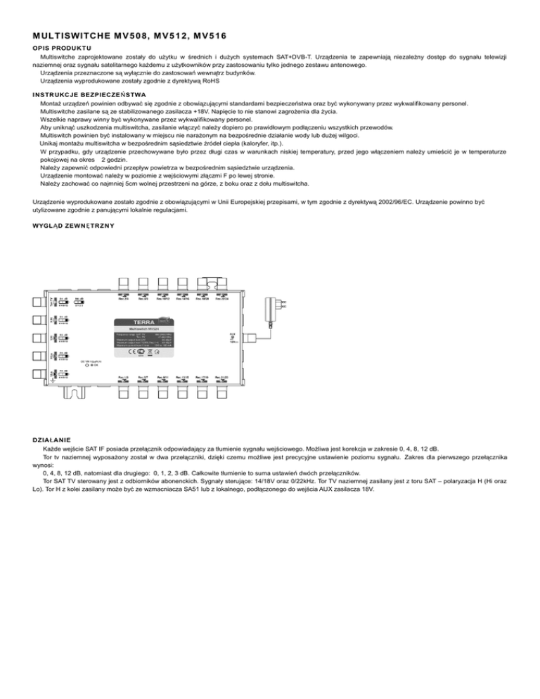 M ULTISWITCHE M V 5 0 8, M V 5 1 2, M V 5 1 6 OPIS PRODU K T U Multiswitche zaprojektowane zostały do użytku w średnich i dużych systemach SAT+DVB-T. Urządzenia te zapewniają niezależny dostęp do sygnału telewizji naziemnej oraz sygnału satelitarnego każdemu z użytkowników przy zastosowaniu tylko jednego zestawu antenowego. Urządzenia przeznaczone są wyłącznie do zastosowań wewnątrz budynków. Urządzenia wyprodukowane zostały zgodnie z dyrektywą RoHS I NSTR UKCJE BEZPIECZE Ń STWA Montaż urządzeń powinien odbywać się zgodnie z obowiązującymi standardami bezpieczeństwa oraz być wykonywany przez wykwalifikowany personel. Multiswitche zasilane są ze stabilizowanego zasilacza +18V. Napięcie to nie stanowi zagrożenia dla życia. Wszelkie naprawy winny być wykonywane przez wykwalifikowany personel. Aby uniknąć uszkodzenia multiswitcha, zasilanie włączyć należy dopiero po prawidłowym podłączeniu wszystkich przewodów. Multiswitch powinien być instalowany w miejscu nie narażonym na bezpośrednie działanie wody lub dużej wilgoci. Unikaj montażu multiswitcha w bezpośrednim sąsiedztwie źródeł ciepła (kaloryfer, itp.). W przypadku, gdy urządzenie przechowywane było przez długi czas w warunkach niskiej temperatury, przed jego włączeniem należy umieścić je w temperaturze pokojowej na okres 2 godzin. Należy zapewnić odpowiedni przepływ powietrza w bezpośrednim sąsiedztwie urządzenia. Urządzenie montować należy w poziomie z wejściowymi złączmi F po lewej stronie. Należy zachować co najmniej 5cm wolnej przestrzeni na górze, z boku oraz z dołu multiswitcha. Urządzenie wyprodukowane zostało zgodnie z obowiązującymi w Unii Europejskiej przepisami, w tym zgodnie z dyrektywą 2002/96/EC. Urządzenie powinno być utylizowane zgodnie z panującymi lokalnie regulacjami. WYGL Ą D ZEWN Ę TRZ N Y DZIA Ł AN IE Każde wejście SAT IF posiada przełącznik odpowiadający za tłumienie sygnału wejściowego. Możliwa jest korekcja w zakresie 0, 4, 8, 12 dB. Tor tv naziemnej wyposażony został w dwa przełączniki, dzięki czemu możliwe jest precycyjne ustawienie poziomu sygnału. Zakres dla pierwszego przełącznika wynosi: 0, 4, 8, 12 dB, natomiast dla drugiego: 0, 1, 2, 3 dB. Całkowite tłumienie to suma ustawień dwóch przełączników. Tor SAT TV sterowany jest z odbiorników abonenckich. Sygnały sterujące: 14/18V oraz 0/22kHz. Tor TV naziemnej zasilany jest z toru SAT – polaryzacja H (Hi oraz Lo). Tor H z kolei zasilany może być ze wzmacniacza SA51 lub z lokalnego, podłączonego do wejścia AUX zasilacza 18V. Nazwa MV-580 MV-512 MV-516 Kod R70708 R70712 R70716 Ilość wejść 5 5 5 Ilość wyjść 8 12 16 Pasmo pracy [MHz] SAT 950 - 2400 DVB-T/Radio 47 - 790 wyjścia 1-4 5...14 wyjścia 5-8 4...12 wyjścia 912 SAT - wyjścia 1316 Wzmocnienie (prekorekcja ch-ki tłumienia przewodu) [dB] DVBT/Radio -1...5 wyjścia 5-8 -2...3 wyjścia 912 - -3...1 12, krok 4dB DVB-T/Radio 15, krok 1dB 105 wyjścia 1-4 88 wyjścia 5-8 86 wyjścia 912 - wyjścia 1316 pasmo SAT > 30 pasmo DVB-T > 35 < 65 Maksymalny pobór prądu z linii H oraz zewnętrznego źródła zasilania 18V 100mA Sygnały sterujące 14/18V, 0/22kHz Zakres temperatur pracy [ºC] Masa [kg] 82 > 30 Pobór prądu z odbiornika [mA] Wymiary [mm] 84 - Separacja wejść SAT [dB] Separacja wyjść [dB] -4...-1 SAT Max. poziom sygnału SAT (IMD3=35dB)* [dBμV] Max. poziom sygnału DVB-T (IMD3=60dB)* [dBμV] 2...8 wyjścia 1-4 wyjścia 1316 Regulacja wzmocnienia [dB] 3...10 -20...+50 187x135x30 227x135x30 267x135x30 0,6 0,7 0,9
