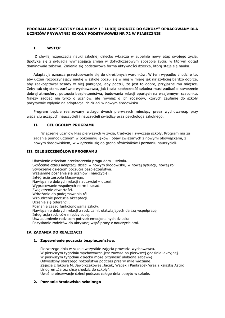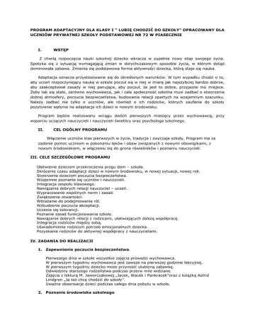 PROGRAM ADAPTACYJNY DLA KLASY I " LUBIĘ CHODZIĆ DO SZKOŁY" OPRACOWANY DLA UCZNIÓW PRYWATNEJ SZKOŁY PODSTAWOWEJ NR 72 W PIASECZNIE I. WSTĘP Z chwilą rozpoczęcia nauki szkolnej dziecko wkracza w zupełnie nowy etap swojego życia. Spotyka się z sytuacją wymagającą zmian w dotychczasowym sposobie życia, w którym dotąd dominowała zabawa. Zmienia się podstawowa forma aktywności dziecka, którą staje się nauka. Adaptacja oznacza przystosowanie się do określonych warunków. W tym wypadku chodzi o to, aby uczeń rozpoczynający naukę w szkole poczuł się w niej w miarę jak najszybciej bardzo dobrze, aby zaakceptował zasady w niej panujące, aby poczuł, że jest to dobre, przyjazne mu miejsce. Żeby tak się stało, zarówno wychowawca, jak i cała społeczność szkolna musi zadbać o stworzenie dobrej atmosfery, poczucia bezpieczeństwa, budowania relacji opartych na wzajemnym szacunku. Należy zadbać nie tylko o uczniów, ale również o ich rodziców, których zaufanie do szkoły pozytywnie wpłynie na adaptacje ich dzieci w nowym środowisku. Program będzie realizowany wciągu dwóch pierwszych miesięcy przez wychowawcę, przy wsparciu uczących nauczycieli i nauczycieli świetlicy oraz psychologa szkolnego. II. CEL OGÓLNY PROGRAMU Włączenie uczniów klas pierwszych w życie, tradycje i zwyczaje szkoły. Program ma za zadanie pomoc uczniom w pokonaniu lęków i obaw związanych z nowymi obowiązkami, z nowym środowiskiem, w włączeniu się do grona rówieśników i poznaniu nauczycieli. III. CELE SZCZEGÓŁOWE PROGRAMU Ułatwienie dzieciom przekroczenia progu dom – szkoła. Skrócenie czasu adaptacji dzieci w nowym środowisku, w nowej sytuacji, nowej roli. Stworzenie dzieciom poczucia bezpieczeństwa. Wzajemne poznanie się uczniów i nauczycieli. Integracja zespołu klasowego. Nawiązanie dobrych relacji nauczyciel – uczeń. Wypracowanie wspólnych norm i zasad. Zwiększenie otwartości. Wdrażanie do podejmowania ról. Wzbudzenie poczucia akceptacji. Uczenie się tolerancji. Poznanie zasad funkcjonowania szkoły. Nawiązanie dobrych relacji z rodzicami, ułatwiających dalszą współpracę. Integracja rodziców między sobą. Uświadomienie rodzicom potrzeb emocjonalnych dziecka. Pozyskanie rodziców do aktywnej współpracy z nauczycielami. IV. ZADANIA DO REALIZACJI 1. Zapewnienie poczucia bezpieczeństwa. Pierwszego dnia w szkole wszystkie zajęcia prowadzi wychowawca. W pierwszym tygodniu wychowawca jest zawsze na pierwszej godzinie lekcyjnej. W pierwszym tygodniu dziecko może przynosić ulubioną zabawkę. Odwiedziny starszego rodzeństwa podczas przerw mile widziane. Zajęcia z lekturą M. Jaworczakowej „Jacek, Wacek i Pankracek”oraz z książką Astrid Lindgren „Ja też chcę chodzić do szkoły”. Uważne obserwacje dzieci podczas całego dnia pobytu w szkole. 2. Poznanie środowiska szkolnego Spacer po budynku szkolnym i otoczeniu szkoły. 3. Integracja zespołu klasowego Identyfikatory z imionami. Zabawy integracyjne. Wycieczka integracyjna. 4. Aktywne włączenie w życie szkoły i klasy Poznanie praw i obowiązków ucznia. Opracowanie „Kodeksu klasy”. Zapoznanie obowiązkami dyżurnego. Zapoznanie z zasadami zachowania się w stołówce szkolnej. Przygotowanie uroczystości „Pasowania na ucznia.” 5. Obserwacja uczniów Zajęcia z psychologiem szkolnym. Współpraca z nauczycielami świetlicy. Dzielenie się sugestiami z nauczycielami uczącymi w klasie. 6. Nawiązanie współpracy z rodzicami Przedstawienie założeń dydaktyczno – wychowawczych. Wspólne opracowanie programu wychowawczego klasy. Zachęcenie rodziców do udziału w życiu klasy i szkoły. Zachęcenie do współpracy z nauczycielami, do kontaktów podczas zebrań, dni otwartych. V. PRZEWIDYWANE OSIĄGNIĘCIA, Dziecko: czuje się bezpiecznie w murach szkoły, jest akceptowane, szanuje nauczyciela i kolegów w klasie, uczestniczy w tworzeniu zasad zachowania, potrafi pracować w zespole, nie ma uprzedzeń do innych, porozumiewa się ze wszystkimi w klasie, wie co świadczy o jego wyjątkowości, swobodnie porusza się po budynku szkolnym, wie, jak funkcjonuje szkoła, umie słuchać innych, wie, że każdy jest inny i ma do tego prawo. Rodzic jest spokojny o bezpieczeństwo o swojego dziecka, współpracuje z nauczycielem, czynnie uczestniczą w życiu klasowym. VI. EWALUACJA PROGRAMU Ewaluacji programu dokona wychowawca klasy poprzez obserwację oraz ocenę zachowania uczniów, rozmowy z uczniami oraz ich rodzicami. .