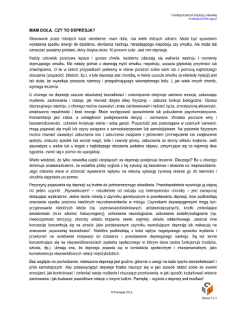Fundacja Centrum Edukacji Liderskiej fundacja.cel.free.ngo.pl MAM DOŁA. CZY TO DEPRESJA? Stosowane przez młodych ludzi określenie: mam doła, ma wiele różnych odcieni. Może być sposobem wyrażenia spadku energii do działania, obniżenia nastroju, narastającego niepokoju czy smutku. Ale może też oznaczać poważny problem, który dotyka około 10 procent ludzi. Jest nim depresja. Każdy człowiek przeżywa lepsze i gorsze chwile, każdemu zdarzają się wahania nastroju i momenty dojmującego smutku. Nie należy jednak z depresją mylić smutku, niepokoju, uczucia głębokiej przykrości lub zniechęcenia. O ile w takich przypadkach jesteśmy w stanie poradzić sobie sami lub z pomocą najbliższego otoczenia (przyjaciół, bliskich, itp.), o tyle depresja jest chorobą, w której uczucie smutku (a niekiedy irytacji) jest tak duże, że wywołuje poczucie niemocy i przepełniającego wewnętrznego bólu. I, jak wiele innych chorób, wymaga leczenia. U chorego na depresję uczucie absolutnej bezradności i zniechęcenia obejmuje zarówno emocje, zaburzając myślenie, zachowania i relacje, jak również dotyka sfery fizycznej – zaburza funkcje biologiczne. Oprócz depresyjnego nastroju, u chorego można zauważyć utratę zainteresowań i radości życia, zmniejszoną aktywność, zwiększoną męczliwość i brak energii. Może występować spowolnienie lub pobudzenie psychomotoryczne. Koncentracja jest słaba, a umiejętność podejmowania decyzji – zachwiana. Wzrasta poczucie winy i bezwartościowości, człowiek krytykuje siebie i sobą gardzi. Przyszłość jest postrzegana w czarnych barwach, mogą pojawiać się myśli lub czyny związane z samookaleczeniem lub samobójstwem. Na poziomie fizycznym można również zauważyć zaburzenia snu i zaburzenia związane z jedzeniem (zmniejszenie lub zwiększenie apetytu, znaczny spadek lub wzrost wagi), bóle i zawroty głowy, zaburzenia ze strony układu krążenia. Jeśli zauważysz u siebie lub u kogoś z najbliższego otoczenia podobne objawy, utrzymujące się co najmniej dwa tygodnie, zwróć się o pomoc do specjalisty. Warto wiedzieć, że tylko niewielka część cierpiących na depresję podejmuje leczenie. Dlaczego? Bo u chorego dominuje przeświadczenie, że wszelkie próby wyjścia z tej sytuacji są bezcelowe i skazane na niepowodzenie. Jego znikoma wiara w zdolność wywierania wpływu na własną sytuację życiową skłania go do bierności i utrudnia sięgnięcie po pomoc. Przyczyny pojawiania się depresji są trudne do jednoznacznego określenia. Prawdopodobnie wywołuje ją więcej niż jeden czynnik. „Wyzwalaczem” – niezależnie od rodzaju czy intensywności choroby – jest zazwyczaj stresujące wydarzenie. Jedne teorie mówią o czynniku genetycznym w powstawaniu depresji, inne podkreślają znaczenie spadku poziomu niektórych neurotransmiterów w mózgu. Czynnikami depresjogennymi mogą być: przyjmowanie niektórych leków (np. przeciwnadciśnieniowych, antykoncepcyjnych), środki zmieniające świadomość (m.in. alkohol, halucynogeny), schorzenia neurologiczne, zaburzenia endokrynologiczne (np. niedoczynność tarczycy), choroby układu krążenia, nerek, wątroby, układu oddechowego. Jeszcze inne koncepcje koncentrują się na utracie, jako podstawowym czynniku wywołującym depresję lub wskazują na znaczenie „wyuczonej bezradności”. Niektóre podkreślają z kolei wpływ negatywnego sposobu myślenia i przekonań na osłabienie motywacji do działania i powstawanie depresyjnego nastroju. Są też teorie koncentrujące się na nieprawidłowościach systemu społecznego w którym dana osoba funkcjonuje (rodzina, szkoła, itp.). Uznają one, że depresja pojawia się w kontekście społecznym i interpersonalnym, jako konsekwencja nieprawidłowych relacji międzyludzkich. Bez względu na pochodzenie, nieleczona depresja jest groźna, głównie z uwagi na duże ryzyko samookaleczeń i prób samobójczych. Aby przezwyciężyć depresje trzeba nauczyć się w jaki sposób radzić sobie ze swoimi emocjami, jak kontrolować i zmieniać swoje myślenie i niszczące przekonania, w jaki sposób kształtować własne zachowania i jak budować prawidłowe relacje z innymi ludźmi. Pamiętaj – wyjście z depresji jest możliwe! © Fundacja C.E.L. Strona 1 z 1