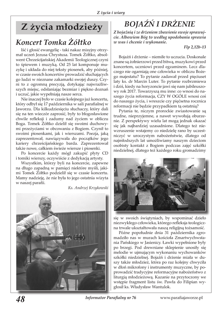 Z życia i wiary Z życia młodzieży Koncert Tomka Żółtko Iść i głosić ewangelię - taki nakaz misyjny otrzymał uczeń Jezusa Chrystusa. Tomek Żółtko, absolwent Chrześcijańskiej Akademii Teologicznej czyni to śpiewem i muzyką. Od 25 lat komponuje muzykę i układa do niej teksty piosenek, aby później, w czasie swoich koncertów prowadzić słuchających go ludzi w nieznane zakamarki swojej duszy. Czyni to z ogromną precyzją, dotykając najwrażliwszych miejsc, odsłaniając bezmiar i piękno doznań i uczuć, jakie wypełniają nasze serca. Nie inaczej było w czasie kolejnego już koncertu, który odbył się 17 października w sali parafialnej w Jaworzu. Dla kilkudziesięciu słuchaczy, który dali się na ten wieczór zaprosić, były to błogosławione chwile refleksji i zadumy nad życiem w obliczu Boga. Tomek Żółtko dzielił się swoimi duchowymi przeżyciami w obcowaniu z Bogiem. Czynił to swoimi piosenkami, jak i wierszami. Poezja, jaką zaprezentował, nawiązywała do początków jego kariery chrześcijańskiego barda. Zaprezentował także nowe, całkiem świeże wiersze i piosenki. Po koncercie każdy mógł zakupić płyty CD i tomiki wierszy, oczywiście z dedykacją artysty. Wszystkim, którzy byli na koncercie, zapewne na długo zapadną w pamięci niektóre myśli, jakimi Tomek Żółtko podzielił się w czasie koncertu. Mamy nadzieję, że nie była to jego ostatnia wizyta w naszej parafii. Ks. Andrzej Krzykowski BOJAŹŃ I DRŻENIE Z bojaźnią i ze drżeniem zbawienie swoje sprawujcie. Albowiem Bóg to według upodobania sprawia w was i chcenie i wykonanie. Flp 2,12b-13 Bojaźń i drżenie – niemiłe to uczucia. Doskonale znane są żołnierzowi przed bitwą, muzykowi przed koncertem, uczniowi przed egzaminem. Lecz dlaczego nie ogarniają one człowieka w obliczu Bożego majestatu? To pytanie zadawał przed pięciuset laty ks. dr Marcin Luter. To pytanie rozbrzmiewa i dziś, kiedy na horyzoncie jawi się nam jubileuszowy rok 2017. Towarzyszą mu inne: co wnosi do naszego życia reformacja, CZY W OGÓLE wnosi coś do naszego życia, i wreszcie czy pięćsetna rocznica reformacji nie będzie przypadkiem tą ostatnią? Pytania te, niczym prorockie zwiastowanie są trudne, nieprzyjemne, a nawet wywołują oburzenie. Z perspektywy wielu lat mogą jednak okazać się jak najbardziej uzasadnione. Dlatego też niewzruszenie wstajemy co niedzielę rano by uczestniczyć w uroczystym nabożeństwie, dlatego od najmłodszych lat umożliwiamy naszym dzieciom osobisty kontakt z Bogiem podczas zajęć szkółki niedzielnej, dlatego też każdego roku gromadzimy się w swoich świątyniach, by wspominać dzieło niezwykłego człowieka, którego refleksja teologiczna trwale ukształtowała naszą religijną tożsamość. Późne popołudnie dnia 31 października zgromadziło nas w murach kościoła Zmartwychwstania Pańskiego w Jasienicy. Ławki wypełnione były po brzegi. Pod drewniane sklepienie unosiły się melodie w ujmującym wykonaniu wychowanków szkółki niedzielnej. Bojaźń i drżenie miała w duszy także młodzież, która po raz kolejny chwyciła w dłoń mikrofony i instrumenty muzyczne, by poprowadzić tradycyjne reformacyjne nabożeństwo z liturgią młodzieżową. Kazanie na przytoczony we wstępie fragment listu św. Pawła do Filipian wygłosił ks. Władysław Wantulok. 48 Informator Parafialny nr 76 www.parafiajaworze.pl Z życia i wiary Posłuszeństwo wobec Bożego Słowa zaczyna się od najprostszych rzeczy. Choć można było zupełnie inaczej spożytkować pierwsze popołudnie długiego weekendu, to owo „chcenie i wykonanie” pokierowało nasze kroki właśnie w stronę kościoła. Pozornie niewielki gest. Chrystus mówi jednak w przypowieści: nad tym co małe byłeś wierny, wiele ci powierzę (Mt 25,21). Bóg powierza dziś w nasze ręce swoją winnicę. Żyjąc w Kościele pełni jesteśmy chęci, by go należycie pielęgnować. Cóż jednak z wykonaniem? – Boże to upodobanie. Adam Krzykowski Dwa dni w Oazie, ale Beskidzkiej Spędzanie wolnego czasu z przyjaciółmi to najlepszy sposób integracji, dlatego Parafia w Jaworzu postanowiła zorganizować kilkudniową wycieczkę dla młodzieży ewangelickiej pod wodzą ks. Andrzeja Krzykowskiego. W niedzielę po południu zebraliśmy się w Jaworzu www.parafiajaworze.pl i w Jasienicy, skąd odebrał nas mały bus i ruszyliśmy w podróż do czeskiej miejscowości Pisek niedaleko Jabłonkowa. Podróż przebiegła szybko oraz w dobrym nastroju. Po przybyciu do ośrodka wypoczynkowego „Beskidzka Oaza” zostały nam przydzielone pokoje. Zaraz po rozpakowaniu rzeczy nadszedł czas na obiadokolację. Po zjedzeniu obejrzeliśmy wspólnie komedię o prehistorycznym człowieku. Później, po udaniu się do pokojów, graliśmy w różne gry i rozmawialiśmy. Następnego dnia, w poniedziałek po śniadaniu udaliśmy się na pieszą wycieczkę w góry. Pogoda nam sprzyjała, słońce mocno świeciło, więc w górach nie było zimno. Koło południa udało nam się zdobyć szczyt góry Girowa. Po zjedzeniu drugiego śniadania oraz drobnych zabawach udaliśmy się z powrotem do ośrodka. Tego dnia udaliśmy się jeszcze na zakupy. Wieczorem po kolacji graliśmy w różne gry planszowe oraz znowu oglądaliśmy wspólnie film. Ostatniego dnia naszego pobytu w czeskiej miejscowości udaliśmy się autobusem do Jabłonkowa, gdzie szukaliśmy lodziarni. Z trudem udało nam się znaleźć małą kawiarenkę, a przy okazji zwiedziliśmy centrum Jabłonkowa. Pogoda tego dnia również była słoneczna, więc czas mijał przyjemnie lecz szybko. Po powrocie do domu wypoczynkowego spakowaliśmy się i w oczekiwaniu na busa, spędziliśmy czas, skacząc na trampolinie. Podczas jazdy powrotnej wszyscy byli zmęczeni i słychać było tylko pochrapywanie. Wieczorem, kiedy już się ściemniało, dotarliśmy do Jasienicy. Wycieczka wszystkim bardzo się podobała i wszyscy, mimo że zmęczeni to b