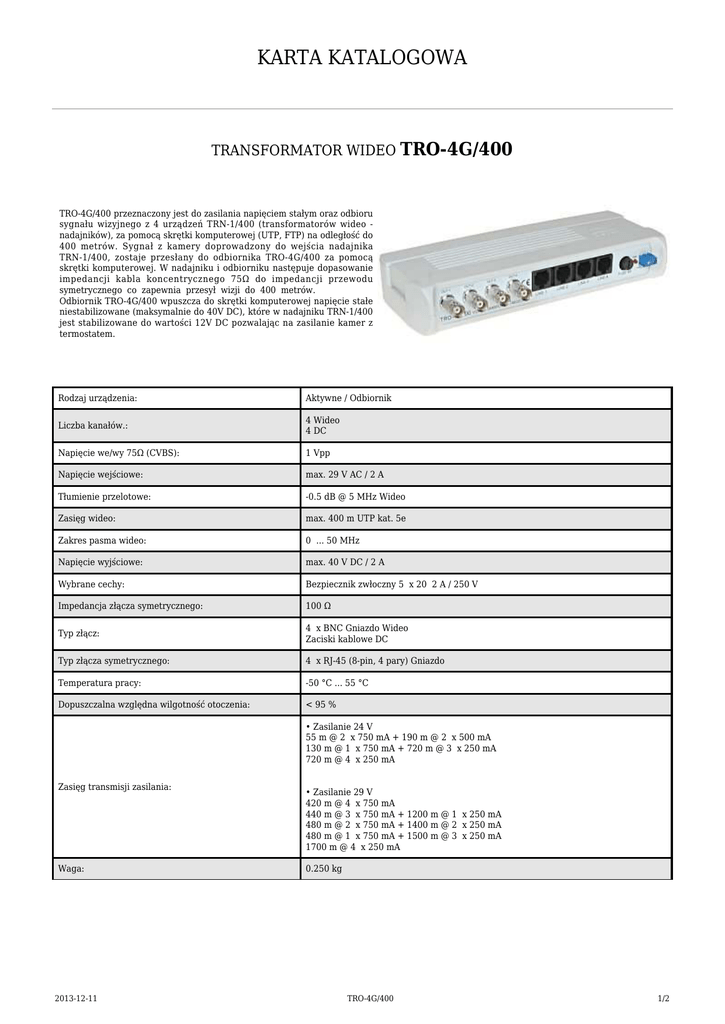KARTA KATALOGOWA TRANSFORMATOR WIDEO TRO-4G/400 TRO-4G/400 przeznaczony jest do zasilania napi ciem sta ym oraz odbioru sygna u wizyjnego z 4 urz dze TRN-1/400 (transformatorów wideo nadajników), za pomoc skr tki komputerowej (UTP, FTP) na odleg o do 400 metrów. Sygna z kamery doprowadzony do wej cia nadajnika TRN-1/400, zostaje przes any do odbiornika TRO-4G/400 za pomoc skr tki komputerowej. W nadajniku i odbiorniku nast puje dopasowanie impedancji kabla koncentrycznego 75 do impedancji przewodu symetrycznego co zapewnia przesy wizji do 400 metrów. Odbiornik TRO-4G/400 wpuszcza do skr tki komputerowej napi cie sta e niestabilizowane (maksymalnie do 40V DC), które w nadajniku TRN-1/400 jest stabilizowane do warto ci 12V DC pozwalaj c na zasilanie kamer z termostatem. Rodzaj urz dzenia: Aktywne / Odbiornik Liczba kana ów.: 4 Wideo 4 DC Napi cie we/wy 75 (CVBS): 1 Vpp Napi cie wej ciowe: max. 29 V AC / 2 A T umienie przelotowe: -0.5 dB @ 5 MHz Wideo Zasi g wideo: max. 400 m UTP kat. 5e Zakres pasma wideo: 0 ... 50 MHz Napi cie wyj ciowe: max. 40 V DC / 2 A Wybrane cechy: Bezpiecznik zw oczny 5 x 20 2 A / 250 V Impedancja z cza symetrycznego: 100 Typ z cz: 4 x BNC Gniazdo Wideo Zaciski kablowe DC Typ z cza symetrycznego: 4 x RJ-45 (8-pin, 4 pary) Gniazdo Temperatura pracy: -50 °C ... 55 °C Dopuszczalna wzgl dna wilgotno otoczenia: < 95 % Zasilanie 24 V 55 m @ 2 x 750 mA + 190 m @ 2 x 500 mA 130 m @ 1 x 750 mA + 720 m @ 3 x 250 mA 720 m @ 4 x 250 mA Zasi g transmisji zasilania: Waga: 2013-12-11 Zasilanie 29 V 420 m @ 4 x 750 mA 440 m @ 3 x 750 mA + 1200 m @ 1 x 250 mA 480 m @ 2 x 750 mA + 1400 m @ 2 x 250 mA 480 m @ 1 x 750 mA + 1500 m @ 3 x 250 mA 1700 m @ 4 x 250 mA 0.250 kg TRO-4G/400 1/2 KARTA KATALOGOWA Wymiary: 2013-12-11 213 x 36 x 93 mm TRO-4G/400 2/2