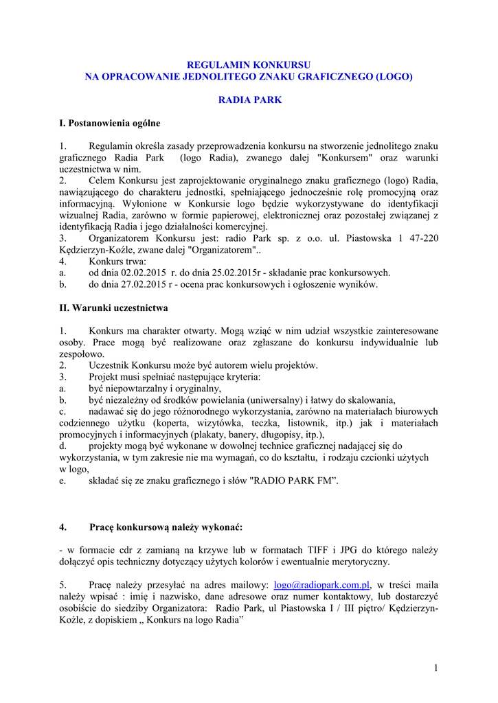 REGULAMIN KONKURSU NA OPRACOWANIE JEDNOLITEGO ZNAKU GRAFICZNEGO (LOGO) RADIA PARK I. Postanowienia ogólne 1. Regulamin określa zasady przeprowadzenia konkursu na stworzenie jednolitego znaku graficznego Radia Park (logo Radia), zwanego dalej "Konkursem" oraz warunki uczestnictwa w nim. 2. Celem Konkursu jest zaprojektowanie oryginalnego znaku graficznego (logo) Radia, nawiązującego do charakteru jednostki, spełniającego jednocześnie rolę promocyjną oraz informacyjną. Wyłonione w Konkursie logo będzie wykorzystywane do identyfikacji wizualnej Radia, zarówno w formie papierowej, elektronicznej oraz pozostałej związanej z identyfikacją Radia i jego działalności komercyjnej. 3. Organizatorem Konkursu jest: radio Park sp. z o.o. ul. Piastowska 1 47-220 Kędzierzyn-Koźle, zwane dalej "Organizatorem".. 4. Konkurs trwa: a. od dnia 02.02.2015 r. do dnia 25.02.2015r - składanie prac konkursowych. b. do dnia 27.02.2015 r - ocena prac konkursowych i ogłoszenie wyników. II. Warunki uczestnictwa 1. Konkurs ma charakter otwarty. Mogą wziąć w nim udział wszystkie zainteresowane osoby. Prace mogą być realizowane oraz zgłaszane do konkursu indywidualnie lub zespołowo. 2. Uczestnik Konkursu może być autorem wielu projektów. 3. Projekt musi spełniać następujące kryteria: a. być niepowtarzalny i oryginalny, b. być niezależny od środków powielania (uniwersalny) i łatwy do skalowania, c. nadawać się do jego różnorodnego wykorzystania, zarówno na materiałach biurowych codziennego użytku (koperta, wizytówka, teczka, listownik, itp.) jak i materiałach promocyjnych i informacyjnych (plakaty, banery, długopisy, itp.), d. projekty mogą być wykonane w dowolnej technice graficznej nadającej się do wykorzystania, w tym zakresie nie ma wymagań, co do kształtu, i rodzaju czcionki użytych w logo, e. składać się ze znaku graficznego i słów "RADIO PARK FM”. 4. Pracę konkursową należy wykonać: - w formacie cdr z zamianą na krzywe lub w formatach TIFF i JPG do którego należy dołączyć opis techniczny dotyczący użytych kolorów i ewentualnie merytoryczny. 5. Pracę należy przesyłać na adres mailowy: [email protected], w treści maila należy wpisać : imię i nazwisko, dane adresowe oraz numer kontaktowy, lub dostarczyć osobiście do siedziby Organizatora: Radio Park, ul Piastowska I / III piętro/ KędzierzynKoźle, z dopiskiem „ Konkurs na logo Radia” 1 6. Nadesłanie lub dostarczenie pracy konkursowej jest równoznaczne z przyjęciem warunków niniejszego regulaminu. 7. Zwycięzca Konkursu zobowiązuje się do niezgłaszania żadnych roszczeń względem Organizatora Konkursu z tytułu wykorzystania przez niego pracy konkursowej nadesłanej wraz ze zgłoszeniem konkursowym lub z tytułu jej niewykorzystania albo wykorzystania w ograniczonym zakresie. 8. Koszty przesyłki ponoszą autorzy prac. Nadesłane prace i dokumenty nie podlegają zwrotowi. III. Ocena oraz Nagroda 1. Prace zostaną ocenione przez Komisję Konkursową, powołaną przez Organizatora. 2. Komisja dokona wyboru jednego, najlepszego projektu przy zachowaniu anonimowości zgłoszonych projektów. Prace oceniane będą pod względem estetycznym oraz funkcjonalnym. 3. Decyzje Komisji zapadają większością głosów. 4. Decyzja Komisji jest ostateczna i nie przysługuje od niej odwołanie. 5. Laureat powiadomiony zostanie telefonicznie. 6. Komisja Konkursowa dokona wyboru jednego, najlepszego projektu, którego autor otrzyma kwotę w wysokości 700 zł oraz aparat cyfrowy NIKON Coolpix L23 o wartości 300 zł 7. Organizator konkursu zastrzega sobie prawo do zakończenia konkursu bez wyłonienia zwycięzcy. Dopuszcza się sytuację, w której nie zostanie wybrany żaden projekt. 8. Kwota 700 zł zostanie wypłacona wyłonionemu zwycięzcy konkursu po zawarciu umowy o przeniesieniu na Organizatora praw autorskich majątkowych do wybranego logo znaku graficznego. Kwota ta zostanie wypłacona przelewem na rachunek bankowy wskazany przez zwycięzcę konkursu w terminie siedmiu dni od dnia podpisania wymienionej wyżej umowy. IV. Prawo własności i prawo wykorzystania zwycięskiego projektu 1. Autor wybranej pracy zobowiązany jest do przeniesienia na Organizatora wszelkich majątkowych praw autorskich (w tym wyłączne prawo do zezwalania na wykonywanie zależnych praw autorskich oraz przenoszenia nabytych praw na inne osoby) do opracowanego przez siebie znaku graficznego oraz prawa własności egzemplarzy utworu złożonych w ramach konkursu, jak również przeniesienia na Organizatora uprawnienia do wykonywania osobistych praw autorskich do utworu. Przeniesienie ww. praw będzie miało charakter nieodpłatny. W tym celu Autor pracy wybranej zawrze z Organizatorem umowę, co będzie jednoznaczne z możliwością wykorzystania przez Organizatora wybranej pracy konkursowej dla potrzeb Radia na wszystkich wskazanych w umowie polach eksploatacji oraz do nieograniczonego w czasie korzystania i rozporządzania w kraju i za granicą, w tym m.in. do: a. wyłącznego używania i wykorzystania pracy konkursowej we wszelkiej działalności promocyjnej - reklamowej, komercyjnej i informacyjnej, b. utrwalania i zwielokrotniania pracy konkursowej wszelkimi technikami graficznymi, 2 c. zwielokrotniania poprzez dokonywanie zapisu pracy konkursowej na nośnikach elektronicznych, d. publicznego wystawiania i wyświetlania pracy konkursowej na wszelkich imprezach otwartych i zamkniętych, i innych, e. nadawania za pomocą wizji przewodowej, bezprzewodowej oraz za pośrednictwem satelity, f. wprowadzania do obrotu, wydawania i rozpowszechniania wszelkich materiałów promocyjnych, informacyjnych, wydawniczych i innych z wykorzystaniem pracy konkursowej, g. wprowadzania do pamięci komputera i umieszczenia pracy konkursowej w Internecie, h. publicznego wystawiania pracy konkursowej, najmu, dzierżawy i bezpłatnego użyczenia pracy konkursowej. 2. Organizator Konkursu zastrzega sobie prawo do zlecen