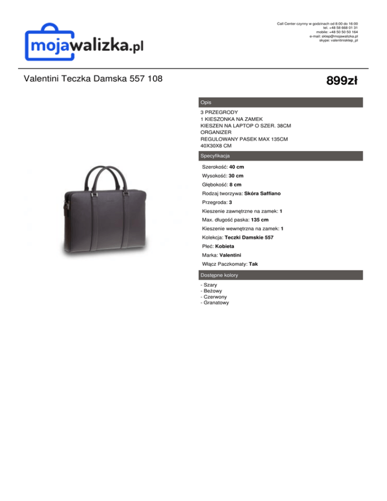 Call Center czynny w godzinach od 8:00 do 16:00 tel. +48 58 668 01 31 mobile: +48 50 50 50 164 e-mail: [email protected] skype: valentinisklep_pl 899zł Valentini Teczka Damska 557 108 Opis 3 PRZEGRODY 1 KIESZONKA NA ZAMEK KIESZEN NA LAPTOP O SZER. 38CM ORGANIZER REGULOWANY PASEK MAX 135CM 40X30X8 CM Specyfikacja Szerokość: 40 cm Wysokość: 30 cm Głębokość: 8 cm Rodzaj tworzywa: Skóra Saffiano Przegroda: 3 Kieszenie zawnętrzne na zamek: 1 Max. długość paska: 135 cm Kieszenie wewnętrzna na zamek: 1 Kolekcja: Teczki Damskie 557 Płeć: Kobieta Marka: Valentini Włącz Paczkomaty: Tak Dostępne kolory - Szary - Beżowy - Czerwony - Granatowy Powered by TCPDF (www.tcpdf.org)