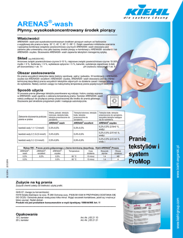 ARENAS®-wash Płynny, wysokoskoncentrowany środek piorący Właściwości ARENAS®- wash jest wysokoskoncentrowanym środkiem piorącym wolnym od fosforanów o wyjątkowej sile prania w temp. 30˚ C, 40˚ C, 60˚ C i 90˚ C. Dzięki zawartości inhibitorów szarzenia i specjalnej kombinacji związków powierzchniowo-czynnych ARENAS®- wash stosowany jest zarówno jako uniwersalny oraz jako bazowy środek piorący w kombinacji z ARENAS®- excellent i/ lub ARENAS®- oxydes. Stosowanie ARENAS®- wash zapewnia tekstyliom nienaganną optykę. Skład (wg 648/2004/WE) Anionowe związki powierzchniowo-czynne 5-15 %, niejonowe związki powierzchniowo-czynne 15-30%, mydło < 5 %, fosfoniany < 5 %, wybielacze optyczne < 5 %, barwniki, substancje zapachowe (Lilial). pH (koncentratu) = ok. 11 pH (roztworu roboczego) = ok. 9 Obszar zastosowania Do prania wszystkich tekstyliów także bielizny sportowej, wełny i jedwabiu. W kombinacji z ARENAS®oxydes lub ARENAS®- excellent i ARENAS®- oxydes, ARENAS®- wash stosowany jest do chemotermicznej dezynfekcji prania wszystkich tekstyliów odpornych na działanie zasad i nadających się do wybielania. Należy zwrócić uwagę na maksymalną temperaturę prania pojedynczych tekstyliów. Sposób użycia Wełna, jedwab, tekstylia kolorowe, tekstylia białe, tekstylia przeznaczone do sprzątania. Tekstylia kolorowe, tekstylia białe, tekstylia przeznaczone do sprzątania. Tekstylia białe, tekstylia przeznaczone do sprzątania, wszystkie tekstylia nadające się do wybielania. ARENAS®-wash ARENAS®-excellent ARENAS®-oxydes twardość wody 1 (< 1,5 mmol/l) 0,3%-0,5% 0,3%-0,5% 0,2%-0,5% (2-5ml/ 1L wody) twardość wody 2 (1,5-2,5 mmol/l) 0,4%-0,6% 0,4%-0,6% 0,2%-0,5% (2-5 ml/ 1L wody) twardość wody 3 (> 2,5 mmol/l) 0,5%-0,8% 0,5%-0,8% 0,2%-0,5% (2-5 ml/ 1L wody ) Zalecenie dozowania podczas prania w pralce: Wykaz RKI - Proces prania połączonego z chemo-termiczną dezynfecją - Kiehl-ARENAS®-Proces ARENAS®excellent 0,5% 0,5% ARENAS®oxydes 0,5% Temperatura 0,5% 60 °C Czas działania 15 minut Stosunek płynów 1:4 Obszar działania AB 60 °C 15 minut 1:4 A 02.12.2014 Zużycie na kg prania Zużycie chemii zależy od wielkości użytej pralki. GHS 07, Uwaga (w koncentracie); H319 Działa drażniąco na oczy. R 280 Ochronę oczu. P305/351/338 W PRZYPADKU DOSTANIA SIĘ DO OCZU: Ostrożnie płukać wodą przez kilka minut. Wyjąć soczewki kontaktowe, jeżeli są i można je łatwo usunąć. Nadal płukać. Produkt nie jest produktem konsumenckim w myśl dyrektywy 1999/44/WE Art. 1! Opakowanie 10 L kanister 20 L kanister Art.-Nr. j 65 21 10 Art.-Nr. j 65 21 21 www.kiehl-group.com 22.12.2014 ARENAS®wash 0,5% Pranie tekstyliów i system ProMop www.kiehl-zegarski.pl W procesie prania głównego tekstylia posortowane wg rodzaju i koloru zostają wyprane w ARENAS®- wash zgodnie z zalecaną temperaturą prania. Kanister ARENAS®- wash należy podłączyć do przyłącza pompy przeznaczonej dla środka do prania głównego. Dozowanie jest określone programem pralki i następuje automatycznie.