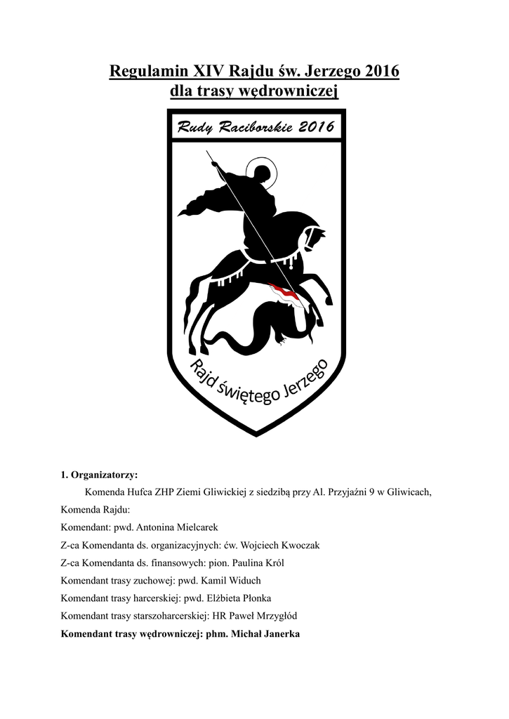 Regulamin XIV Rajdu św. Jerzego 2016 dla trasy wędrowniczej 1. Organizatorzy: Komenda Hufca ZHP Ziemi Gliwickiej z siedzibą przy Al. Przyjaźni 9 w Gliwicach, Komenda Rajdu: Komendant: pwd. Antonina Mielcarek Z-ca Komendanta ds. organizacyjnych: ćw. Wojciech Kwoczak Z-ca Komendanta ds. finansowych: pion. Paulina Król Komendant trasy zuchowej: pwd. Kamil Widuch Komendant trasy harcerskiej: pwd. Elżbieta Płonka Komendant trasy starszoharcerskiej: HR Paweł Mrzygłód Komendant trasy wędrowniczej: phm. Michał Janerka 2. Termin i miejsce rajdu: XIV Rajd św. Jerzego odbędzie się na terenie miast województwa śląskiego, z noclegiem na polu namiotowym nad rzeką Rudą w dniach 15 - 17 kwietnia 2016 r. oraz z noclegiem w Zespole Szkół w Rudach w dniach 23. – 24.04.2016 r. Impreza odbędzie się bez względu na warunki atmosferyczne. Zakończenie Rajdu odbędzie się w niedzielę 24 kwietnia o godzinie 12:00. Dojazdy i powroty z miejsca Rajdu w pierwszy weekend we własnym zakresie. Dnia 24 kwietnia zostanie zapewniony transport. 3. Cele rajdu: propagowanie ZHP jako nowatorskiej i atrakcyjnej organizacji, motywowanie uczestników do samorozwoju, promowanie Związku Harcerstwa Polskiego poprzez działania dla społeczności zarówno lokalnej jak i regionalnej, integracja członków Rajdu. upowszechnienie aktywnych form wypoczynku i spędzania wolnego czasu, promocja zdrowego stylu życia, promocja postaw obywatelskich i zgodnej współpracy w grupie, poznanie walorów kulturowych i turystycznych gminy Kuźnia Raciborska i okolic, upowszechnienie wiedzy o historii gminy Kuźnia Raciborska i okolic, zapoznanie się z ginącymi tradycjami, zwiększenie samodzielności i zaradności życiowej uczestników Rajdu, ze szczególnym uwzględnieniem kompetencji w zakresie orientacji w terenie. 4. Uczestnictwo: Udział w Rajdzie mogą wziąć osoby zgłoszone do 06.04.2016 r., spełniające wymagania wiekowe pionu wędrowniczego i występujące w patrolu o określonej liczebności. Organizator zastrzega sobie prawo wcześniejszego zamknięcia zgłoszeń w przypadku przekroczenia limitu uczestników. W indywidualnych, ustalonych z organizatorami przypadkach dopuszcza się start patroli o innej liczebności. Liczebność patrolu: 2 - 4 osoby. Z patrolem przyjeżdża pełnoletni opiekun. Może on brać czynny udział w Rajdzie na prawach uczestnika. W takim przypadku jest wliczany do liczebności patrolu oraz płaci pełną kwotę wpisowego. Każdy zgłoszony uczestnik (za wyjątkiem opiekunów nie będących członkami ZHP) musi posiadać uzupełnione w Ewidencji ZHP dane. 5. Współzawodnictwo: Na trasie Rajdu będzie prowadzone współzawodnictwo patroli. Oceniane będzie: uczestnictwo w programie, jakość wykonania zadań, zdyscyplinowanie patrolu, ekwipunek patrolu, przestrzeganie regulaminu. 6. Ekwipunek: obowiązkowe indywidualne: plecak turystyczny, wygodne obuwie turystyczne, obuwie na zmianę do używania w miejscu noclegów, prowiant (śniadania i kolacje), przybory do spożywania posiłków, śpiwór i karimata, okrycie przeciwdeszczowe, przybory toaletowe, umundurowanie harcerskie (dla członków organizacji harcerskich), dokument tożsamości - legitymacja szkolna lub studencka (jeśli uczestnik takową posiada), odblaskowe elementy odzieży, obowiązkowe zespołu: latarka , podręczna apteczka, telefon komórkowy (z min. 5zł na koncie), kompas/ busola, każdy patrol musi posiadać i przedstawić: wykupione Ubezpieczenie NNW wraz z listą z danymi uczestników patrolu, a także zgody rodziców oraz pisemne zobowiązanie opiekuna, stanowiące załącznik do niniejszego Regulaminu. W miarę możliwości członkowie patrolu powinni posiadać koszulki środowiska lub inne koszulki harcerskie. 7. Gwarantowane świadczenia: Organizator Rajdu zapewnia: noclegi w warunkach turystycznych, ciepły posiłek w sobotę 16.04.2016 r., możliwość skorzystania z czajnika elektrycznego w miejscu noclegu w dniach 23-24.04.2016 r., nagrodę dla zwycięskiego patrolu, pamiątkowy dyplom dla każdego patrolu, wejście do obiektów przewidzianych na trasie Rajdu, pamiątkową niespodziankę, przejazd z Rud do Gliwic w dniu 24 kwietnia (dla osób zgłoszonych w formularzu). 8. Rezygnacja: Rezygnacja z udziału w Rajdzie patrolu lub uczestnika musi być niezwłocznie zgłoszona Komendzie Rajdu. W przypadku poinformowania o tym fakcie do dnia 30.03.2016 r. zostanie zwrócone 100% wpisowego, po tym terminie nie będzie możliwości zwrotu wpisowego. W przypadku wycofania się całego patrolu lub pojedynczego uczestnika z dalszego uczestnictwa w Rajdzie, zespół zobowiązany jest do niezwłocznego powiadomienia o tym fakcie Komendy Rajdu. Patrol, który schodzi z trasy (rezygnacja, dyskwalifikacja, zagubienie), musi na własną rękę dotrzeć do bazy noclegowej Rajdu. 9. Bezpieczeństwo: W każdym patrolu musi być pełnoletni opiekun, który za niego odpowiada. Wszyscy uczestnicy Rajdu muszą przestrzegać zasad ustalonych przez Organizatora i muszą posiadać cały wymagany sprzęt. Każdy patrol musi posiadać przynajmniej jeden sprawny telefon komórkowy. Obowiązuje nakaz przestrzegania zasad poruszania się po drogach publicznych, przepisów ruchu drogowego i przeciwpożarowych. Obowiązuje zakaz poruszania się po uprawach rolnych, hodowlanych, szkółkach leśnych i terenach prywatnych. Nieprzestrzeganie regulaminu może skutkować punktami karnymi, bądź przy rażącym naruszeniu zasad, wykluczeniem patrolu z dalszej rywalizacji. 10. Dyskwalifikacja: Dyskwalifikacja uczestnika lub patrolu może nastąpić w wypadku nieprzestrzegania: Prawa Harcerskiego, przepisów ruchu drogowego, przepisów ochrony przyrody i bezpieczeństwa przeciwpożarowego. Dyskwalifikacja jest równorzędna z wykluczeniem z Rajdu, utratą praw do wszelkich świadczeń oraz brakiem zwrotu wpisowego. 11. Zgłoszenia oraz wpisowe: Zgłoszenia na Rajd podzielone są na II tury: I tura zgłoszeń przeznaczona jest jedynie 