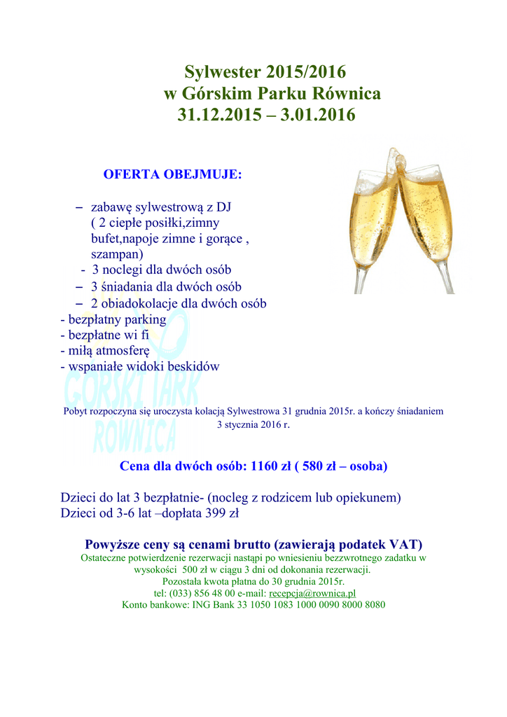 Sylwester 2015/2016 w Górskim Parku Równica 31.12.2015 – 3.01.2016 OFERTA OBEJMUJE: – zabawę sylwestrową z DJ ( 2 ciepłe posiłki,zimny bufet,napoje zimne i gorące , szampan) - 3 noclegi dla dwóch osób – 3 śniadania dla dwóch osób – 2 obiadokolacje dla dwóch osób - bezpłatny parking - bezpłatne wi fi - miłą atmosferę - wspaniałe widoki beskidów Pobyt rozpoczyna się uroczysta kolacją Sylwestrowa 31 grudnia 2015r. a kończy śniadaniem 3 stycznia 2016 r. Cena dla dwóch osób: 1160 zł ( 580 zł – osoba) Dzieci do lat 3 bezpłatnie- (nocleg z rodzicem lub opiekunem) Dzieci od 3-6 lat –dopłata 399 zł Powyższe ceny są cenami brutto (zawierają podatek VAT) Ostateczne potwierdzenie rezerwacji nastąpi po wniesieniu bezzwrotnego zadatku w wysokości 500 zł w ciągu 3 dni od dokonania rezerwacji. Pozostała kwota płatna do 30 grudnia 2015r. tel: (033) 856 48 00 e-mail: [email protected] Konto bankowe: ING Bank 33 1050 1083 1000 0090 8000 8080