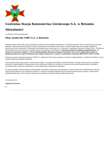 Centralna Stacja Ratownictwa Górniczego S.A. w Bytomiu Aktualności 12 grudzień 2016 (poniedziałek) Złoty medal dla CSRG S.A. w Bytomiu. Takiego sukcesu chyba nikt się nie spodziewał, jednak do końca byliśmy przekonani, że to dobry kierunek. Mowa o kończącym się właśnie projekcie, dotyczącym nowej bielizny i odzieży ochronnej dla ratowników górniczych. Projekt zrealizowany został dzięki współpracy konsorcjum trzech podmiotów: Centralnej Stacji Ratownictwa Górniczego S.A. w Bytomiu, Centralnego Instytutu Ochrony Pracy – Państwowy Instytut Badawczy oraz Wytwórni Umundurowania Strażackiego w Brzezinach. Z ogromną radością pragniemy poinformować, że otrzymał on pierwsze miejsce w 44-tym Ogólnopolskim Konkursie Poprawy Warunków Pracy oraz zdobył Złoty Medal na Międzynarodowych Targach Wynalazczości, Badań Naukowych i Nowych Technologii w Brukseli (BRUSSELS INOVA 2016). W miniony piątek (9 grudnia) delegacja CSRG S.A. odebrała w Warszawie nagrodę w konkursie ogólnopolskim z rąk Minister Rodziny, Pracy i Polityki Społecznej Elżbiety Rafalskiej. Celem projektu było opracowanie i wytworzenie modeli, a następnie prototypów zestawów bielizny i odzieży ochronnej dla ratowników górniczych, zapewniających bezpieczeństwo oraz oddawanie ciepła oraz możliwość monitorowania stanu fizjologicznego ratownika w warunkach akcji w gorącym środowisku, w celu zapobiegania przegrzania organizmu. W ramach projektu przeprowadzono szereg badań ratowników górniczych wyposażonych w sprzęt ochrony dróg oddechowych (aparaty regeneracyjne tlenowe oraz powietrzne butlowe) w różnych warunkach klimatycznych (komorze klimatycznej), zgodnie z opracowaną metodyką badań jak również samych aparatów na aparaturze odzwierciedlającej układ oddechowy. 12 Grudnia 2016 Nagroda Warszawa. 10