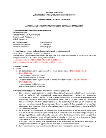 Załącznik nr 3C SIWZ „UBEZPIECZENIE MAJĄTKOWE GMINY KOBIERZYCE” FORMULARZ OFERTOWY – ZADANIE III A. INFORMACJE I POSTANOWIENIA OGÓLNE DOTYCZĄCE ZAMÓWIENIA 1. Ubezpieczający/Ubezpieczony (Zamawiający) Gmina Kobierzyce siedziba Urzędu Gminy Kobierzyce: Kobierzyce, ul. Pałacowa 1 55-040 Kobierzyce NIP Zamawiającego Regon Zamawiającego Strona internetowa: 896-13-08-068 931-93-50-75 http://ugk.pl/ 2. Przewidywany termin wykonania zamówienia (okres ubezpieczenia) Od 16.05.2015 r. do 15.05.2017 r. (24 miesiące). Ubezpieczyciel (wykonawca) ma obowiązek wystawić polisy ubezpieczeniowe w ten sposób, że okres ubezpieczenia dzieli się na dwa okresy rozliczeniowe: I okres rozliczeniowy od 15.05.2015 roku do 14.05.2016roku, II okres rozliczeniowy od 15.05.2016 roku do 14.05.2017 roku. 3. Płatność składki w 4 ratach 1) Dla polis ubezpieczenia wystawionych za I okres rozliczeniowy od 15.05.2015 roku do 14.05.2016 roku I rata płatna do 20.06.2015 roku II rata płatna do 11.01.2016 roku 2) Dla polis ubezpieczenia wystawionych za II okres rozliczeniowy od 15.05.2016 roku do 14.05.2017 roku I rata płatna do 20.06.2016 roku II rata płatna do 10.01.2017 roku 4. Postanowienia dotyczące zakresu, przedmiotu i sum ubezpieczenia a. Zakres ochrony ubezpieczeniowej opisany dla poszczególnych ryzyk jest zakresem minimalnym. Jeżeli w ogólnych lub szczególnych warunkach ubezpieczeń znajdują się dodatkowe uregulowania, z których wynika, że zakres ubezpieczenia jest szerszy od proponowanego w Specyfikacji Istotnych Warunków Zamówienia (dalej: SIWZ), w tym także nie obarczony zaproponowanymi limitami odpowiedzialności, to automatycznie zostaje on włączony do ochrony ubezpieczeniowej Zamawiającego. Zapisy w ogólnych lub szczególnych warunkach ubezpieczenia, z których wynika, iż zakres ubezpieczenia jest węższy niż zakres opisany w SIWZ, nie mają zastosowania. b. W przypadku doubezpieczeń lub ubezpieczeń krótkoterminowych, zastosowanie będą miały warunki niniejszej umowy ubezpieczenia (także w ramach klauzuli automatycznego pokrycia), a Ubezpieczyciel będzie pobierał składkę proporcjonalnie do okresu udzielanej ochrony, zgodnie z zasadą: wnioskowana suma ubezpieczenia x stawka / 365 dni x wnioskowana liczba ubezpieczanych dni. Nie będzie miała zastosowania składka minimalna. c. Franszyzy i udziały własne nie wymienione przez wykonawcę w formularzu ofertowym, a występujące w OWU nie mają zastosowania i należy je uważać za zniesione. d. Sumy ubezpieczenia oraz wypłaty odszkodowania zawierają podatek od towarów i usług. ZAŁĄCZNIK NR 3C SIWZ FORMULARZ OFERTOWY „UBEZPIECZENIE MAJĄTKOWE GMINY KOBIERZYCE” e. Wykonawca przyjmuje bez zastrzeżeń podany sposób szacowania wartości mienia zgłaszanego do ubezpieczenia i w przypadku szkody nie będzie podnosił z tego tytułu zarzutu. f. W trakcie postępowania przetargowego (do wskazanego terminu otwarcia ofert), wykonawca ma prawo przeprowadzenia audytu oceny ryzyka (survey) ubezpieczanych lokalizacji oraz rzeczy ruchomych i nieruchomości określonych jako przedmiot ubezpieczenia, celem oceny ryzyka i zapoznania się ze stanem zabezpieczeń. Termin audytu i szczegóły techniczne jego przeprowadzenia wymagają wcześniejszego uzgodnieniu z zamawiającym. g. Wykonawca oświadcza, że zapoznał się z warunkami przetargu, uzyskał wszystkie informacje niezbędne do oszacowania ryzyka, przygotowania oferty i właściwego wykonania zamówienia oraz, że nie wnosi żadnych zastrzeżeń do SIWZ. Wykonawca oświadcza również, że zapoznał się z zapisami Umowy Generalnej i w pełni akceptuje jej treść. B. SZCZEGÓŁOWE WARUNKI ZAMÓWIENIA UBEZPIECZENIE CZŁONKÓW GMINNYCH OCHOTNICZYCH STRAŻY POŻARNEJ 1. Ubezpieczający: Gmina Kobierzyce 2. Ubezpieczeni: członkowie Ochotniczych Straży Pożarnych (58 osób) członkowie Młodzieżowych Drużyn Pożarniczych (9 osób) 3. Jednostki straży pożarnej: a) ochotnicza straż pożarna: b) młodzieżowa drużyna pożarnicza: 4. Forma ubezpieczenia: 3 jednostki (Kobierzyce, Pustków Wilczkowski, Pustków Żurawski) 1 jednostka bezimienna 5. Zakres ubezpieczenia / ochrony: Zgodnie z art. 32 ust. 3 pkt 2 ustawy o ochronie przeciwpożarowej (tekst jednolity z dnia 15 października 2009 r. Dz. U. Nr 178, poz. 1380 z późn. zm.) przedmiotem ubezpieczenia są następstwa nieszczęśliwych wypadków członków Ochotniczych Straży Pożarnych, w tym następstwa nieszczęśliwych wypadków zaistniałych w trakcie akcji ratowniczo – gaśniczych, wykonywania poleceń służbowych jako członka OSP i MDP, trwania ćwiczeń (w tym w trakcie zawodów i szkoleń) polegające na uszkodzeniu ciała lub rozstroju zdrowia, powodujące trwały uszczerbek na zdrowiu lub śmierć ubezpieczonego. Wysokość odszkodowania ustala się zgodnie z przepisami ustawy z dnia 30.10.2002r. o ubezpieczeniu społecznym z tytułu wypadków przy pracy i chorób zawodowych (tekst jednolity z dnia 22 września 2009 r. Dz. U. Nr 167, poz. 1322). Przy czym jako: • czas akcji należy rozumieć czas od powiadomienia i zadysponowania członków OSP do akcji gaśniczej lub ratunkowej, do chwili zgłoszenia w Powiatowym Stanowisku Kierowania faktu powrotu do strażnicy OSP • czas ćwiczeń należy rozumieć jako okres od zadysponowania członków OSP do miejsca ćwiczeń, do chwili powiadomienia Powiatowego Stanowiska Kierowania o fakcie powrotu do strażnicy OSP 6. Klauzule dodatkowe: Do zakresu ubezpieczenia, w zamian za dodatkowe punkty doliczane do zakresu ochrony ubezpieczeniowej Zamawiający proponuje włączenie do ubezpieczenia następujących dodatkowych postanowień umownych. Strona 2 z 3 ZAŁĄCZNIK NR 3C SIWZ FORMULARZ OFERTOWY „UBEZPIECZENIE MAJĄTKOWE GMINY KOBIERZYCE” Lp. 1 2 3 4 Klauzula Limit odpowiedzialności Koszt nabycia przedmiotów 20% sumy ubezpieczenia ortopedycznych Koszty leczenia, w tym 20% sumy ubezpieczenia koszty rehabilitacji oparzenia i odmrożenia 30%