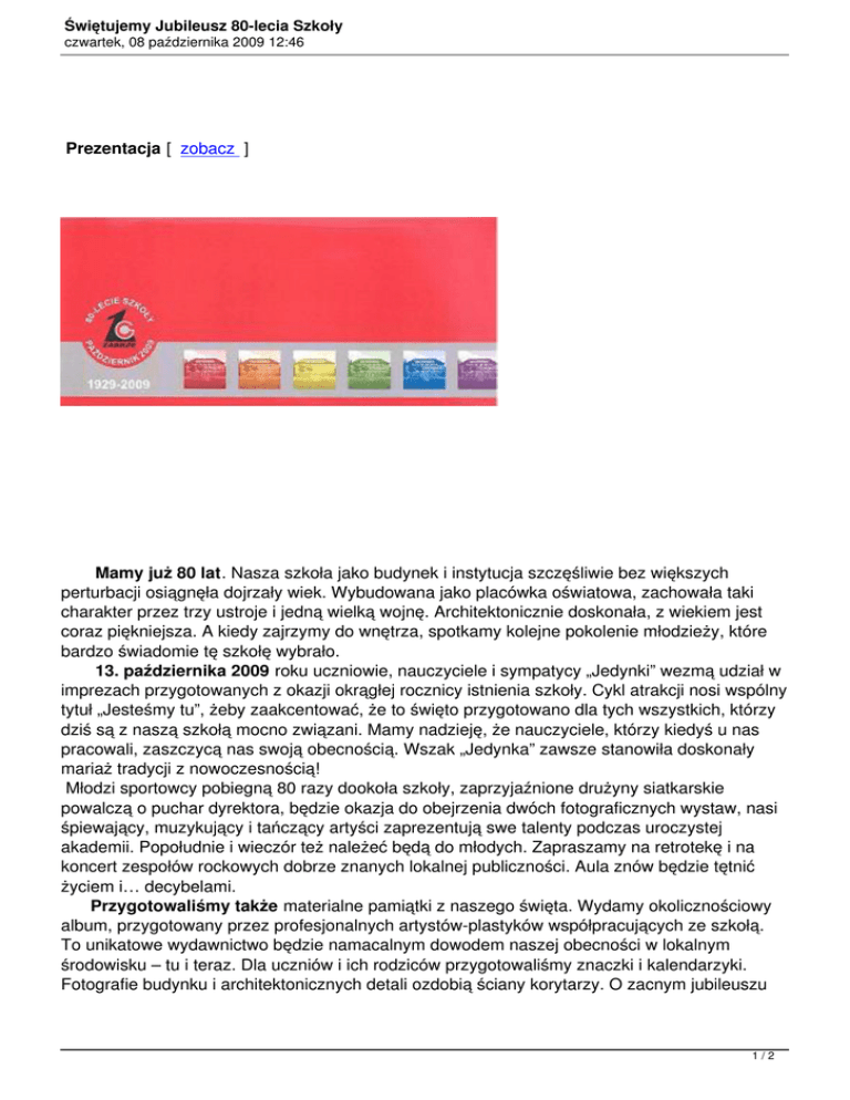 Świętujemy Jubileusz 80-lecia Szkoły czwartek, 08 października 2009 12:46 Prezentacja [ zobacz ] Mamy już 80 lat. Nasza szkoła jako budynek i instytucja szczęśliwie bez większych perturbacji osiągnęła dojrzały wiek. Wybudowana jako placówka oświatowa, zachowała taki charakter przez trzy ustroje i jedną wielką wojnę. Architektonicznie doskonała, z wiekiem jest coraz piękniejsza. A kiedy zajrzymy do wnętrza, spotkamy kolejne pokolenie młodzieży, które bardzo świadomie tę szkołę wybrało. 13. października 2009 roku uczniowie, nauczyciele i sympatycy „Jedynki” wezmą udział w imprezach przygotowanych z okazji okrągłej rocznicy istnienia szkoły. Cykl atrakcji nosi wspólny tytuł „Jesteśmy tu”, żeby zaakcentować, że to święto przygotowano dla tych wszystkich, którzy dziś są z naszą szkołą mocno związani. Mamy nadzieję, że nauczyciele, którzy kiedyś u nas pracowali, zaszczycą nas swoją obecnością. Wszak „Jedynka” zawsze stanowiła doskonały mariaż tradycji z nowoczesnością! Młodzi sportowcy pobiegną 80 razy dookoła szkoły, zaprzyjaźnione drużyny siatkarskie powalczą o puchar dyrektora, będzie okazja do obejrzenia dwóch fotograficznych wystaw, nasi śpiewający, muzykujący i tańczący artyści zaprezentują swe talenty podczas uroczystej akademii. Popołudnie i wieczór też należeć będą do młodych. Zapraszamy na retrotekę i na koncert zespołów rockowych dobrze znanych lokalnej publiczności. Aula znów będzie tętnić życiem i… decybelami. Przygotowaliśmy także materialne pamiątki z naszego święta. Wydamy okolicznościowy album, przygotowany przez profesjonalnych artystów-plastyków współpracujących ze szkołą. To unikatowe wydawnictwo będzie namacalnym dowodem naszej obecności w lokalnym środowisku – tu i teraz. Dla uczniów i ich rodziców przygotowaliśmy znaczki i kalendarzyki. Fotografie budynku i architektonicznych detali ozdobią ściany korytarzy. O zacnym jubileuszu 1/2 Świętujemy Jubileusz 80-lecia Szkoły czwartek, 08 października 2009 12:46 będziemy więc długo pamiętać. Kochani Absolwenci, nie smućcie się. Podczas obchodów 85 rocznicy istnienia szkoły znów Wy będziecie najważniejsi. 2/2