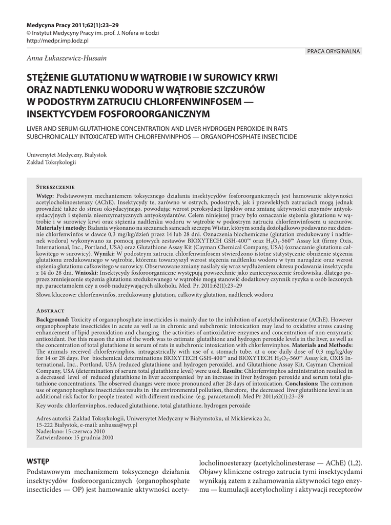Medycyna Pracy 2011;62(1):23–29 © Instytut Medycyny Pracy im. prof. J. Nofera w Łodzi http://medpr.imp.lodz.pl PRACA ORYGINALNA Anna Łukaszewicz-Hussain STĘŻENIE GLUTATIONU W WĄTROBIE I W SUROWICY KRWI ORAZ NADTLENKU WODORU W WĄTROBIE SZCZURÓW W PODOSTRYM ZATRUCIU CHLORFENWINFOSEM — INSEKTYCYDEM FOSFOROORGANICZNYM LIVER AND SERUM GLUTATHIONE CONCENTRATION AND LIVER HYDROGEN PEROXIDE IN RATS SUBCHRONICALLY INTOXICATED WITH CHLORFENVINPHOS — ORGANOPHOSPHATE INSECTICIDE Uniwersytet Medyczny, Białystok Zakład Toksykologii Streszczenie Wstęp: Podstawowym mechanizmem toksycznego działania insektycydów fosforoorganicznych jest hamowanie aktywności acetylocholinoesterazy (AChE). Insektycydy te, zarówno w ostrych, podostrych, jak i przewlekłych zatruciach mogą jednak prowadzić także do stresu oksydacyjnego, powodując wzrost peroksydacji lipidów oraz zmianę aktywności enzymów antyoksydacyjnych i stężenia nieenzymatycznych antyoksydantów. Celem niniejszej pracy było oznaczanie stężenia glutationu w wątrobie i w surowicy krwi oraz stężenia nadtlenku wodoru w wątrobie w podostrym zatruciu chlorfenwinfosem u szczurów. Materiały i metody: Badania wykonano na szczurach samcach szczepu Wistar, którym sondą dożołądkowo podawano raz dziennie chlorfenwinfos w dawce 0,3 mg/kg/dzień przez 14 lub 28 dni. Oznaczenia biochemiczne (glutation zredukowany i nadtlenek wodoru) wykonywano za pomocą gotowych zestawów BIOXYTECH GSH-400™ oraz H2O2-560™ Assay kit (firmy Oxis, International, Inc., Portland, USA) oraz Glutathione Assay Kit (Cayman Chemical Company, USA) (oznaczanie glutationu całkowitego w surowicy). Wyniki: W podostrym zatruciu chlorfenwinfosem stwierdzono istotne statystycznie obniżenie stężenia glutationu zredukowanego w wątrobie, któremu towarzyszył wzrost stężenia nadtlenku wodoru w tym narządzie oraz wzrost stężenia glutationu całkowitego w surowicy. Obserwowane zmiany nasilały się wraz wydłużeniem okresu podawania insektycydu z 14 do 28 dni. Wnioski: Insektycydy fosforoorganiczne występują powszechnie jako zanieczyszczenie środowiska, dlatego poprzez zmniejszenie stężenia glutationu zredukowanego w wątrobie mogą stanowić dodatkowy czynnik ryzyka u osób leczonych np. paracetamolem czy u osób nadużywających alkoholu. Med. Pr. 2011;62(1):23–29 Słowa kluczowe: chlorfenwinfos, zredukowany glutation, całkowity glutation, nadtlenek wodoru Abstract Background: Toxicity of organophosphate insecticides is mainly due to the inhibition of acetylcholinesterase (AChE). However organophosphate insecticides in acute as well as in chronic and subchronic intoxication may lead to oxidative stress causing enhancement of lipid peroxidation and changing the activities of antioxidative enzymes and concentration of non-enzymatic antioxidant. For this reason the aim of the work was to estimate glutathione and hydrogen peroxide levels in the liver, as well as the concentration of total glutathione in serum of rats in subchronic intoxication with chlorfenvinphos. Materials and Methods: The animals received chlorfenvinphos, intragastrically with use of a stomach tube, at a one daily dose of 0.3 mg/kg/day for 14 or 28 days. For biochemical determinations BIOXYTECH GSH-400™ and BIOXYTECH H2O2-560™ Assay kit, OXIS International, Inc., Portland, USA (reduced glutathione and hydrogen peroxide), and Glutathione Assay Kit, Cayman Chemical Company, USA (determination of serum total glutathione level) were used. Results: Chlorfenvinphos administration resulted in a decreased level of reduced glutathione in liver accompanied by an increase in liver hydrogen peroxide and serum total glutathione concentrations. The observed changes were more pronounced after 28 days of intoxication. Conclusions: The common use of organophosphate insecticides results in the environmental pollution, therefore, the decreased liver glutathione level is an additional risk factor for people treated with different medicine (e.g. paracetamol). Med Pr 2011;62(1):23–29 Key words: chlorfenvinphos, reduced glutathione, total glutathione, hydrogen peroxide Adres autorki: Zakład Toksykologii, Uniwersytet Medyczny w Białymstoku, ul Mickiewicza 2c, 15-222 Białystok, e-mail: [email protected] Nadesłano: 15 czerwca 2010 Zatwierdzono: 15 grudnia 2010 WSTĘP Podstawowym mechanizmem toksycznego działania insektycydów fosforoorganicznych (organophosphate insecticides — OP) jest hamowanie aktywności acety- locholinoesterazy (acetylcholinesterase — AChE) (1,2). Objawy kliniczne ostrego zatrucia tymi insektycydami wynikają zatem z zahamowania aktywności tego enzymu — kumulacji acetylocholiny i aktywacji receptorów 24 A. Łukaszewicz-Hussain muskarynowych oraz nikotynowych (1,3,4). Insektycydy fosforoorganiczne, zarówno w ostrych, jak i przewlekłych zatruciach, mogą jednak prowadzić także do stresu oksydacyjnego, powodując wzrost peroksydacji lipidów oraz zmianę aktywności enzymów antyoksydacyjnych i stężenia nieenzymatycznych antyoksydantów (1,4–6). W badaniach Vidyasagar i wsp. (5) wykazano np. wzrost stężenia dialdehydu malonowego (malonyldialdehyde — MDA) w surowicy i aktywności dysmutazy ponadtlenkowej (superoxide dismutase — SOD) w erytrocytach u osób hospitalizowanych z powodu ostrego zatrucia OP. U osób tych nie obserwowano normalizacji badanych parametrów po podaniu atropiny i pochodnych oksymów. Ryzyko wynikające ze stosowania pestycydów dotyczy przede wszystkim osób zatrudnionych przy dystrybucji i produkcji tych związków, pracowników rolnych, ale także osób mieszkających na terenach rolniczych lub spożywających skażoną nimi żywność. Niewielki odsetek populacji jest zagrożony przyjęciem wystarczająco dużej dawki pestycydu, aby wystąpiły objawy ostrego zatrucia. Duża jest natomiast liczba osób, które w sposób przewlekły narażone są na niewielkie ilości tych związków, przez co mogą być one zagrożone wystą