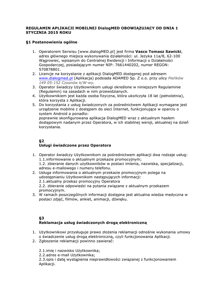 REGULAMIN APLIKACJI MOBILNEJ DialogMED OBOWIĄZUJĄCY OD DNIA 1 STYCZNIA 2015 ROKU §1 Postanowienia ogólne 1. Operatorem Serwisu [www.dialogMED.pl] jest firma Vasco Tomasz Sawicki, adres głównego miejsca wykonywania działalności: ul. Jeżyka 11a/8, 62-100 Wągrowiec, wpisanym do Centralnej Ewidencji i Informacji o Działalności Gospodarczej, posiadającym numer NIP: 7661440202, numer REGON: 570878801. 2. Licencje na korzystanie z aplikacji DialogMED dostępnej pod adresem www.dialogmed.pl (Aplikacja) podsiada ADAMED Sp. Z o.o. przy ulicy Pieńków 149 05-152 Czosnów k/W-wy. 3. Operator świadczy Użytkownikom usługi określone w niniejszym Regulaminie (Regulamin) na zasadach w nim przewidzianych. 4. Użytkownikiem jest każda osoba fizyczna, która ukończyła 18 lat (pełnoletnia), która korzysta z Aplikacji. 5. Do korzystania z usług świadczonych za pośrednictwem Aplikacji wymagane jest urządzenie mobilne z dostępem do sieci Internet, funkcjonujące w oparciu o system Android a ponadto: poprawnie skonfigurowana aplikacja DialogMED wraz z aktualnym hasłem dostępowym nadanym przez Operatora, w ich stabilnej wersji, aktualnej na dzień́ korzystania. §2 Usługi świadczone przez Operatora 1. Operator świadczy Użytkownikom za pośrednictwem aplikacji dwa rodzaje usług: 1.1.informowanie o aktualnym przekazie promocyjnym; 1.2. zbieranie danych użytkowników w postaci imienia, nazwiska, specjalizacji, adresu e-mailowego i numeru telefonu. 2. Usługa informowania o aktualnym przekazie promocyjnym polega na udostępnianiu Użytkownikom następujących informacji: 2.1.aktualny przekaz promocyjny Operatora 2.2. zbieranie odpowiedzi na pytania związane z aktualnym przekazem promocyjnym. 3. W ramach poszczególnych informacji dostępna jest aktualna wiedza medyczna w postaci zdjęć, filmów, ankiet, animacji, dźwięku. §3 Reklamacja usług świadczonych drogą elektroniczną 1. Użytkownikowi przysługuje prawo złożenia reklamacji odnośnie wykonania umowy o świadczenie usług drogą elektroniczną, czyli funkcjonowania Aplikacji. 2. Zgłoszenie reklamacji powinno zawierać́: 2.1.imię i nazwisko Użytkownika; 2.2.adres e-mail Użytkownika; 2.3.opis i datę̨ wystąpienia nieprawidłowości związanej z funkcjonowaniem Aplikacji. 3. Reklamacje można składać́ drogą elektroniczną na adres e-mail: [email protected] co bądź́ na adres: Vasco Przemysłowa 46a/81, 61-541 Poznań. 4. Reklamacja zostanie rozpatrzona w ciągu 14 dni od daty jej otrzymania. Informacja o rozpatrzeniu reklamacji zostanie przesłana na wskazany przez Użytkownika w reklamacji adres e-mail. §4 Dane osobowe Użytkowników 1. Korzystając z funkcjonalności Aplikacji Użytkownik wyraża zgodę̨ na: 1.1.przetwarzanie, gromadzenie, utrwalanie, przechowywanie, opracowywanie, udostępnianie i usuwanie danych osobowych Użytkownika przez Operatora w celu realizacji umowy oraz w zakresie niezbędnym do świadczenia usług przez Aplikację; 1.2.Użytkownik wyraża zgodę̨ na przekazywanie jego danych osobowych podmiotom trzecim w celu i zakresie niezbędnym do prawidłowej realizacji usług. 1.3.przetwarzanie, gromadzenie, utrwalanie, przechowywanie, opracowywanie, udostępnianie i usuwanie danych osobowych Użytkownika w celu badania rynku oraz zachowaná i preferencji usługobiorców z przeznaczeniem wyników tych badań na potrzeby polepszenia jakości usług świadczonych oraz w celach statystycznych. 2. Przy rejestrowaniu w aplikacji, Użytkownik może wyrazić́ zgodę̨ na: 2.1.przetwarzanie, gromadzenie, utrwalanie, przechowywanie, opracowywanie, udostępnianie i usuwanie danych osobowych Użytkownika przez Operatora w celach marketingowych i reklamy; 2.2. rozpowszechnianie danych osobowych Użytkownika zgromadzonych w Aplikacji w sieci Internet, w sposób określony w Polityce Prywatności Aplikacji. 3. Podczas rejestracji w Aplikacji Użytkownik podaje następujące dane osobowe: 3.1.imię i nazwisko; 3.2.specjalizację 3.3.adres e-mail; 3.4.telefon komórkowy. 4. Operator, będący administratorem danych osobowych, chroni dane osobowe swoich Użytkowników. Podane przez Użytkownika dane mogą̨ być́ przetwarzane dla celów określonych w ust. 1 i 2 jedynie przez Operatora i podmioty przez niego upoważnione na podstawie przepisów ustawy z dnia 29 sierpnia 1997 roku o ochronie danych osobowych oraz Regulaminu. Użytkownik ma prawo wglądu w swoje dane oraz prawo ich poprawiania. 5. Podanie danych osobowych przez Użytkownika jest całkowicie dobrowolne. Operator nie weryfikuje podanych danych osobowych. 6. Operator prowadzi zbiór danych osobowych Użytkowników serwisu. Zbiór danych został zarejestrowany u Generalnego Inspektora Ochrony Danych Osobowych. §6 Odpowiedzialność́ 1. Operator odpowiada za prawdziwość́ informacji udostępnianych Użytkownikom. 2. Operator dołoży wszelkich starań́, aby aplikacja DialogMED działała w sposób ciągły bez jakichkolwiek zakłóceń́, jednakże Operator nie ponosi żadnej odpowiedzialności za zakłócenia spowodowane siłą wyższą lub niedozwoloną ingerencją Użytkownika lub osoby trzeciej. §7 Rozwiązanie i wypowiedzenie umowy 1. Użytkownik może w każdym czasie wypowiedzieć́ umowę̨ o świadczenie usług drogą elektroniczną. Oświadczenie o wypowiedzeniu umowy o świadczenie usług drogą elektroniczną składane przez Użytkownika może zostać́ wysłane drogą elektroniczną na adres [email protected] lub poprzez usuniecie Aplikacji przez Użytkownika z poziomu urządzenia mobilnego. 2. Wypowiedzenie umowy przez którakolwiek ze stron, jak również̇ jej rozwiązanie za obustronną zgodą jest równoznaczne z zablokowaniem Użytkownikowi dostępu do Aplikacji. §8 Postanowienia końcowe 1. Operator zastrzega sobie prawo do czasowego całkowitego lub częściowego wyłączenia Aplikacji w celu jej ulepszenia, dodawania usług lub przeprowadzania konserwacji, bez wcześniejszego uprzedzania o tym Użytkownika. 2