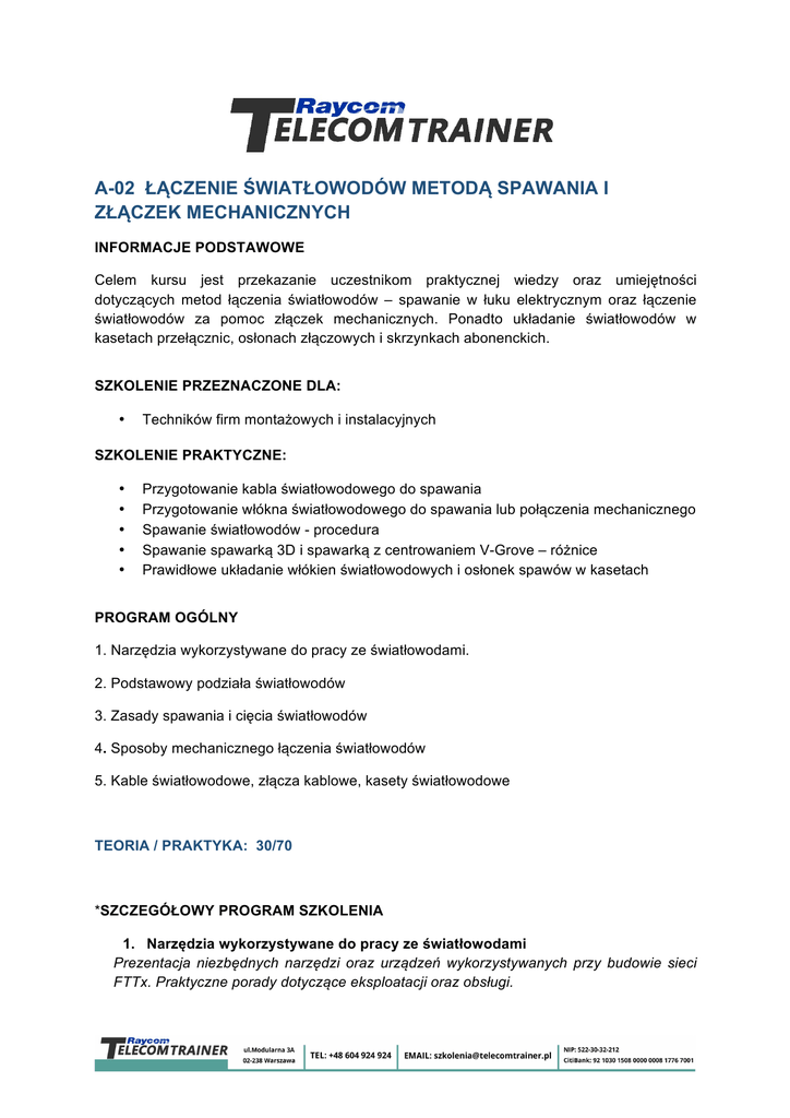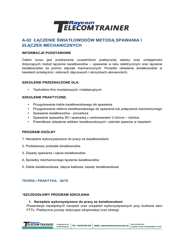 A-02 ŁĄCZENIE ŚWIATŁOWODÓW METODĄ SPAWANIA I ZŁĄCZEK MECHANICZNYCH INFORMACJE PODSTAWOWE Celem kursu jest przekazanie uczestnikom praktycznej wiedzy oraz umiejętności dotyczących metod łączenia światłowodów – spawanie w łuku elektrycznym oraz łączenie światłowodów za pomoc złączek mechanicznych. Ponadto układanie światłowodów w kasetach przełącznic, osłonach złączowych i skrzynkach abonenckich. SZKOLENIE PRZEZNACZONE DLA: • Techników firm montażowych i instalacyjnych SZKOLENIE PRAKTYCZNE: • • • • • Przygotowanie kabla światłowodowego do spawania Przygotowanie włókna światłowodowego do spawania lub połączenia mechanicznego Spawanie światłowodów - procedura Spawanie spawarką 3D i spawarką z centrowaniem V-Grove – różnice Prawidłowe układanie włókien światłowodowych i osłonek spawów w kasetach PROGRAM OGÓLNY 1. Narzędzia wykorzystywane do pracy ze światłowodami. 2. Podstawowy podziała światłowodów 3. Zasady spawania i cięcia światłowodów 4. Sposoby mechanicznego łączenia światłowodów 5. Kable światłowodowe, złącza kablowe, kasety światłowodowe TEORIA / PRAKTYKA: 30/70 *SZCZEGÓŁOWY PROGRAM SZKOLENIA 1. Narzędzia wykorzystywane do pracy ze światłowodami Prezentacja niezbędnych narzędzi oraz urządzeń wykorzystywanych przy budowie sieci FTTx. Praktyczne porady dotyczące eksploatacji oraz obsługi. 2. Podstawowy podział światłowodów Konstrukcja światłowodów. Podstawowe informacje dotyczące zjawisk fizycznych w światłowodach (m.in. całkowite wewnętrzne odbicie, rozkład współczynnika załamania – skokowe, gradientowe, struktura modowa). Typy światłowodów wg. ITU. Zestawienia i porównania parametrów transmisyjnych włókien różnej kategorii i producentów. 250µm 125µm 8 -12µm 125µm 250µm 50 - 60µm Rysunek 1 Budowa światłowodu jedno i wielomodowego. 3. Zasady spawania i cięcia światłowodów Techniki łączenia (spawania), światłowodów, rodzaje wykorzystywanych urządzeń centrowanie do płaszcza lub rdzenia. Niezbędne narzędzia. Procedura przygotowania do spawania. Możliwości i parametry połączeń spawanych włókien różnych kategorii. Prezentacja wyników pomiarów. Rysunek 2 Spawanie włókien światłowodowych w łuku elektrycznym. a b c d e f Rysunek 3 Etapy procedury przygotowania światłowodów do spawania: a) usunięcie powłoki, b) czyszczenie światłowodu, c) umieszczenie w dedykowanym uchwycie, d) łamanie, e) zgrzewanie w łuku elektrycznym, f) nałożenie osłonki. 4. Sposoby mechanicznego łączenia światłowodów Procedura przygotowania do łączenia, niezbędne narzędzia. Zalety i wady vs. spawy klasyczne. Praktyczne porady. 5. Kable światłowodowe, złącza kablowe, kasety światłowodowe Prezentacja elementów do budowy sieci FTTx, parametry, funkcjonalność, klasyfikacja oraz metody instalacji: - kable światłowodowe (mikrokable, kable kanałowe „klasyczne”, napowietrzne ADSS ang. All Dielectric Self Support, przyłączeniowe tzw. drop, nowości z rynku), - złącza rozłączalne, - kasety światłowodowe. włókna światłowodowe żel hydrofobowy jednostka światłowodowa taśmy obwoju centralne wzmocnienie „ripcord” powłoka zewnętrzna Rysunek 4 Konstrukcja kabla z centralnym elementem wzmacniającym. SC/APC LC/PC Rysunek 5 Przykłady złączy rozłączalnych. a) b) Rysunek 6 Złącza rozłączalne, a) płaskie, b) kątowe. *Powyższy materiał jedynie w sposób poglądowy, skrócony prezentuje zawartość szkoleń i ma na celu przedstawienie zainteresowanym osobom zakresu merytorycznego.