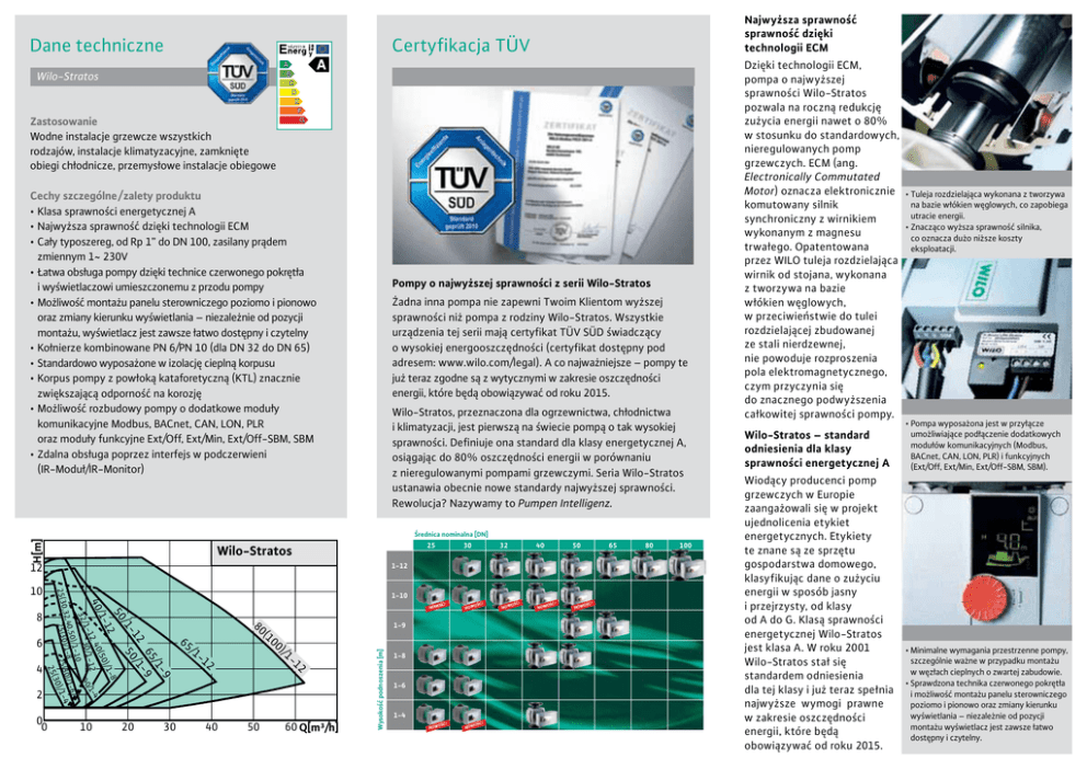 Dane techniczne Najwyższa sprawność sprawność dzięki technologii ECM Certyfikacja TÜV Wilo-Stratos Zastosowanie Wodne instalacje grzewcze wszystkich rodzajów, instalacje klimatyzacyjne, zamknięte obiegi chłodnicze, przemysłowe instalacje obiegowe Cechy szczególne / zalety produktu •Klasa sprawności energetycznej A •Najwyższa sprawność dzięki technologii ECM •Cały typoszereg, od Rp 1” do DN 100, zasilany prądem zmiennym 1~ 230V •Łatwa obsługa pompy dzięki technice czerwonego pokrętła i wyświetlaczowi umieszczonemu z przodu pompy •Możliwość montażu panelu sterowniczego poziomo i pionowo oraz zmiany kierunku wyświetlania – niezależnie od pozycji montażu, wyświetlacz jest zawsze łatwo dostępny i czytelny •Kołnierze kombinowane PN 6/PN 10 (dla DN 32 do DN 65) •Standardowo wyposażone w izolację cieplną korpusu •Korpus pompy z powłoką kataforetyczną (KTL) znacznie zwiększającą odporność na korozję •Możliwość rozbudowy pompy o dodatkowe moduły komunikacyjne Modbus, BACnet, CAN, LON, PLR oraz moduły funkcyjne Ext/Off, Ext/Min, Ext/Off-SBM, SBM •Zdalna obsługa poprzez interfejs w podczerwieni (IR-Moduł/IR-Monitor) Pompy o najwyższej sprawności z serii Wilo-Stratos Żadna inna pompa nie zapewni Twoim Klientom wyższej sprawności niż pompa z rodziny Wilo-Stratos. Wszystkie urządzenia tej serii mają certyfikat TÜV SÜD świadczący o wysokiej energooszczędności (certyfikat dostępny pod adresem: www.wilo.com/legal). A co najważniejsze – pompy te już teraz zgodne są z wytycznymi w zakresie oszczędności energii, które będą obowiązywać od roku 2015. Wilo-Stratos, przeznaczona dla ogrzewnictwa, chłodnictwa i klimatyzacji, jest pierwszą na świecie pompą o tak wysokiej sprawności. Definiuje ona standard dla klasy energetycznej A, osiągając do 80% oszczędności energii w porównaniu z nieregulowanymi pompami grzewczymi. Seria Wilo-Stratos ustanawia obecnie nowe standardy najwyższej sprawności. Rewolucja? Nazywamy to Pumpen Intelligenz. H[m] Średnica nominalna [DN] 25 Wilo-Stratos 12 32 40 50 1-12 1-10 OŚĆ! NOW 2 -9 /1 65 -9 /1 50 10 -1 0 0 -8 )/1 (50 3 25( 2 /1 12 6 80 65 20 30 /1 -1 2 40 50 OŚĆ! NOW 1-9 (1 00 )/1 -1 2 60 Q[m³/h] Wysokość podnoszenia [m] 50 /1- 8 0 4 40 24 12 0/11-1 30/14 32/ 1-10 0,50)/ 1-6 ,32,4 5(30)/1-825(30)/ 1-4 2 25(30 0)/ 10 4 30 1-8 1-6 1-4 OŚĆ! NOW OŚĆ! NOW OŚĆ! NOW OŚĆ! NOW OŚĆ! NOW 65 80 100 Dzięki technologii ECM, pompa o najwyższej sprawności Wilo-Stratos pozwala na roczną redukcję zużycia energii nawet o 80% w stosunku do standardowych, nieregulowanych pomp grzewczych. ECM (ang. Electronically Commutated Motor) oznacza elektronicznie komutowany silnik synchroniczny z wirnikiem wykonanym z magnesu trwałego. Opatentowana przez WILO tuleja rozdzielająca wirnik od stojana, wykonana z tworzywa na bazie włókien węglowych, w przeciwieństwie do tulei rozdzielającej zbudowanej ze stali nierdzewnej, nie powoduje rozproszenia pola elektromagnetycznego, czym przyczynia się do znacznego podwyższenia całkowitej sprawności pompy. Wilo-Stratos – standard odniesienia dla klasy sprawności energetycznej A Wiodący producenci pomp grzewczych w Europie zaangażowali się w projekt ujednolicenia etykiet energetycznych. Etykiety te znane są ze sprzętu gospodarstwa domowego, klasyfikując dane o zużyciu energii w sposób jasny i przejrzysty, od klasy od A do G. Klasą sprawności energetycznej Wilo-Stratos jest klasa A. W roku 2001 Wilo-Stratos stał się standardem odniesienia dla tej klasy i już teraz spełnia najwyższe wymogi prawne w zakresie oszczędności energii, które będą obowiązywać od roku 2015. • Tuleja rozdzielająca wykonana z tworzywa na bazie włókien węglowych, co zapobiega utracie energii. • Znacząco wyższa sprawność silnika, co oznacza dużo niższe koszty eksploatacji. • Pompa wyposażona jest w przyłącze umożliwiające podłączenie dodatkowych modułów komunikacyjnych (Modbus, BACnet, CAN, LON, PLR) i funkcyjnych (Ext/Off, Ext/Min, Ext/Off-SBM, SBM). • Minimalne wymagania przestrzenne pompy, szczególnie ważne w przypadku montażu w węzłach cieplnych o zwartej zabudowie. • Sprawdzona technika czerwonego pokrętła i możliwość montażu panelu sterowniczego poziomo i pionowo oraz zmiany kierunku wyświetlania – niezależnie od pozycji montażu wyświetlacz jest zawsze łatwo dostępny i czytelny. Łatwa i wygodna w obsłudze Niezawodna i cicha praca sprawiają, że Wilo-Stratos jest idealną pompą do zastosowań w budynkach użyteczności publicznej, biurowych, a także przemysłowych. Obsługa pompy Wilo-Stratos jest bardzo łatwa i wygodna dzięki sprawdzonej technice czerwonego pokrętła. Kontrola i regulacja wszystkich najważniejszych funkcji wykonywana jest jednym pokrętłem. Wyświetlacz umieszczony z przodu pompy umożliwia wygodny odczyt wszystkich ważnych informacji o pracy urządzenia. Centrala: Wilo Polska Sp. z o.o. al. Krakowska 38, Janki 05-090 Raszyn tel.: 22 702 61 61 fax: 22 702 61 00 www.wilo.pl e-mail: [email protected] INFOLINIA: 801 DO WILO (czyli 801 369 456) ODPOWIADA ZAŁOŻENIOM DYREKTYWY ERP (ENERGY RELATED PRODUCTS) Dział Instalacji Grzewczych i Sanitarnych – projekty i inwestycje Idealna do profesjonalnego zarządzania budynkiem Wilo-Stratos oferuje funkcje odpowiadające każdym wymaganiom. Poza standardowym złączem zbiorczej sygnalizacji awarii istnieje możliwość wyposażenia pompy w moduły komunikacyjne do połączenia z systemem nadrzędnym, pracujące zgodnie z protokołem komunikacyjnym Modbus, BACnet, CAN, LON oraz PLR. Co więcej, można zastosować IF-Moduły służące do sterowania dwóch pomp w układach praca – praca i praca – rezerwa. Wilo-Stratos spełnia zatem wszystkie wymagania profesjonalnego zarządzania budynkami. Pierwsza na świecie pompa o najwyższej sprawności. • Do zastosowań w instalacjach klimatyzacyjnych i chłodniczyc