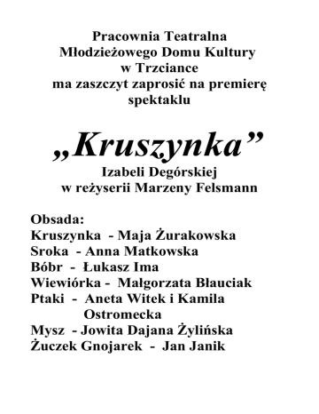 Pracownia Teatralna Młodzieżowego Domu Kultury w Trzciance ma zaszczyt zaprosić na premierę spektaklu „Kruszynka” Izabeli Degórskiej w reżyserii Marzeny Felsmann Obsada: Kruszynka - Maja Żurakowska Sroka - Anna Matkowska Bóbr - Łukasz Ima Wiewiórka - Małgorzata Błauciak Ptaki - Aneta Witek i Kamila Ostromecka Mysz - Jowita Dajana Żylińska Żuczek Gnojarek - Jan Janik Melodie piosenek - Marzena Felsmann Kamila Ostromecka(śpiew) Kostiumy - Marzena Felsmann Scenografia - Marzena Felsmann Marta Ślazyk Przedstawienie odbędzie się dnia 27 lutego 2013 r. o godzinie 17.00 w sali teatralnej MDK-u przy ulicy Gen. W. Sikorskiego 26 Jeśli chcesz się dowiedzieć, dlaczego egoizm i lenistwo nie pomagają w zdobywaniu nowych przyjaciół, a pomoc innym procentuje akceptacją otoczenia i lepszym samopoczuciem, przyjdź i poznaj przygody słonicy, która zgubiła się w lesie...