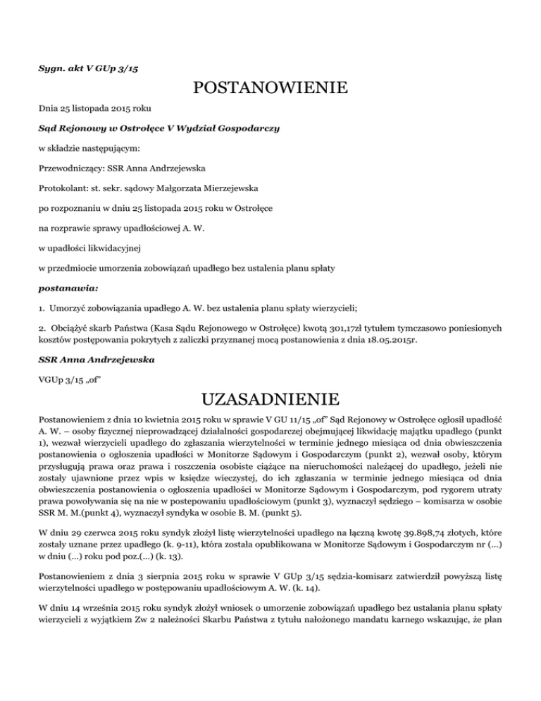 Sygn. akt V GUp 3/15 POSTANOWIENIE Dnia 25 listopada 2015 roku Sąd Rejonowy w Ostrołęce V Wydział Gospodarczy w składzie następującym: Przewodniczący: SSR Anna Andrzejewska Protokolant: st. sekr. sądowy Małgorzata Mierzejewska po rozpoznaniu w dniu 25 listopada 2015 roku w Ostrołęce na rozprawie sprawy upadłościowej A. W. w upadłości likwidacyjnej w przedmiocie umorzenia zobowiązań upadłego bez ustalenia planu spłaty postanawia: 1. Umorzyć zobowiązania upadłego A. W. bez ustalenia planu spłaty wierzycieli; 2. Obciążyć skarb Państwa (Kasa Sądu Rejonowego w Ostrołęce) kwotą 301,17zł tytułem tymczasowo poniesionych kosztów postępowania pokrytych z zaliczki przyznanej mocą postanowienia z dnia 18.05.2015r. SSR Anna Andrzejewska VGUp 3/15 „of” UZASADNIENIE Postanowieniem z dnia 10 kwietnia 2015 roku w sprawie V GU 11/15 „of” Sąd Rejonowy w Ostrołęce ogłosił upadłość A. W. – osoby fizycznej nieprowadzącej działalności gospodarczej obejmującej likwidację majątku upadłego (punkt 1), wezwał wierzycieli upadłego do zgłaszania wierzytelności w terminie jednego miesiąca od dnia obwieszczenia postanowienia o ogłoszenia upadłości w Monitorze Sądowym i Gospodarczym (punkt 2), wezwał osoby, którym przysługują prawa oraz prawa i roszczenia osobiste ciążące na nieruchomości należącej do upadłego, jeżeli nie zostały ujawnione przez wpis w księdze wieczystej, do ich zgłaszania w terminie jednego miesiąca od dnia obwieszczenia postanowienia o ogłoszenia upadłości w Monitorze Sądowym i Gospodarczym, pod rygorem utraty prawa powoływania się na nie w postepowaniu upadłościowym (punkt 3), wyznaczył sędziego – komisarza w osobie SSR M. M.(punkt 4), wyznaczył syndyka w osobie B. M. (punkt 5). W dniu 29 czerwca 2015 roku syndyk złożył listę wierzytelności upadłego na łączną kwotę 39.898,74 złotych, które zostały uznane przez upadłego (k. 9-11), która została opublikowana w Monitorze Sądowym i Gospodarczym nr (...) w dniu (...) roku pod poz.(...) (k. 13). Postanowieniem z dnia 3 sierpnia 2015 roku w sprawie V GUp 3/15 sędzia-komisarz zatwierdził powyższą listę wierzytelności upadłego w postępowaniu upadłościowym A. W. (k. 14). W dniu 14 września 2015 roku syndyk złożył wniosek o umorzenie zobowiązań upadłego bez ustalania planu spłaty wierzycieli z wyjątkiem Zw 2 należności Skarbu Państwa z tytułu nałożonego mandatu karnego wskazując, że plan podziału nie został sporządzony z uwagi na brak majątku upadłego, a sytuacja osobista upadłego w oczywisty sposób wskazuje, że nie byłby on zdolny do dokonania jakichkolwiek spłat w ramach planu spłaty wierzycieli. Sąd upadłościowy zważył co następuje: W sprawie zasadne było odstąpienie od ustalania planu spłaty wierzycieli. Zgodnie z art. 49116 ust. 1 PrUpN sąd umarza zobowiązania upadłego bez ustalenia planu spłaty wierzycieli, jeśli osobista sytuacja upadłego w oczywisty sposób wskazuje, że nie byłby on zdolny do dokonania jakichkolwiek spłat w ramach planu spłaty wierzycieli. Nie budzi wątpliwości, że odstąpienie od ustalenia planu spłaty ma charakter wyjątkowy. Celem ustalenia, czy zaistniały takie wyjątkowe okoliczności w stosunku do upadłego A. W., Sąd dokonał oceny stanu zdrowia upadłego, jego zdolności do pracy, aktualnej sytuacji osobistej i majątkowej i przyczyn powstania zadłużenia. W tym celu Sąd analizował dokumenty zgromadzone w aktach sprawy i przedstawione przez upadłego oraz wyjaśnienia upadłego złożone w charakterze strony. Upadły A. W. od 2010 roku pozostaje pod stałą opieką Wojewódzkiego Szpitala (...) w W. (...) z zaleceniem leczenia w poradni ortopedycznej i rehabilitacyjnej. Cierpi na nieuleczalną chorobę (...), której skutkiem są inne mnogi choroby, wśród których w rozpoznaniu klinicznym wymieniono: (...) (karta informacyjna leczenia szpitalnego - k. 25, wyjaśnienia upadłego). Upadły wskazał, że dożywotnio zmuszony jest zażywać liczne i kosztowne leki, w tym (...) i szczególnie drogie maści (...), na które potrzebuje średnio miesięcznie około 200-300 złotych, a które są mu niezbędne do codziennego, normalnego funkcjonowania. Chociaż aktualnie udaje mu się utrzymywać w miarę stabilny stan zdrowia, to jednak choroba (...) jest nieuleczalna, a (...) wymaga częstych wizyt w klinice. Sąd nie miał powodów by odmówić wiarygodności powyższym zeznaniom upadłego, skoro znajdują one potwierdzenie w złożonej dokumentacji medycznej. Lekarz orzecznik ZUS Oddział w P. orzeczeniem z dnia 31.08.2012 roku uznał upadłego za całkowicie niezdolnego do pracy do 31.08.2015 roku (k. 22). Zgodnie z art. 12 ust 2 ustawy z dnia 17 grudnia 1998 roku o emeryturach i rentach z Funduszu Ubezpieczeń Społecznych (Dz.U. z2015 roku, poz. 748) całkowicie niezdolną do pracy jest osoba, która utraciła zdolność do wykonywania jakiejkolwiek pracy. Na rozprawie w dniu 25 listopada 2015 roku upadły okazał legitymację emeryta-rencisty nr (...) z terminem ważności do 31.10.2018 roku wydaną przez ZUS o/P., co jednoznacznie wykazuje dalszą niezdolność do pracy upadłego. W związku z uzyskanym prawem do renty upadły uzyskuje z tego tytułu około 700,00 złotych miesięcznie, a nadto świadczy pracę w (...) w W. jako instruktor (...) (bez uprawnień) za którą uzyskuje miesięczne wynagrodzenie w wysokości około 1.700,00 złotych netto (k. 23). (...) upadły w bieżącym roku ukończył naukę w Liceum Ogólnokształcącym dla Dorosłych (...) i 30.06.2015 roku uzyskał świadectwo dojrzałości (k. 24). Celem uzyskiwania dalszych niezbędnych kwalifikacji terapeutycznych rozpoczął pięcioletnie wyższe studia w systemie niestacjonarnym na Wydziale Pedagogiki o specjalności rehabilitacja w (...) w P.. Aktualnie jest studentem pierwszego roku studiów, co upadły wykazał na rozprawie w dniu 25 listopada 2015 roku okazując legity